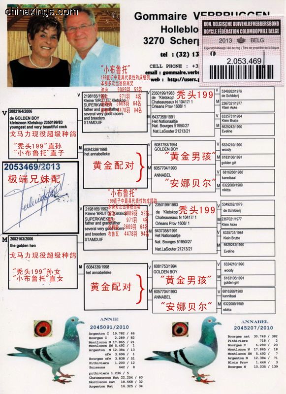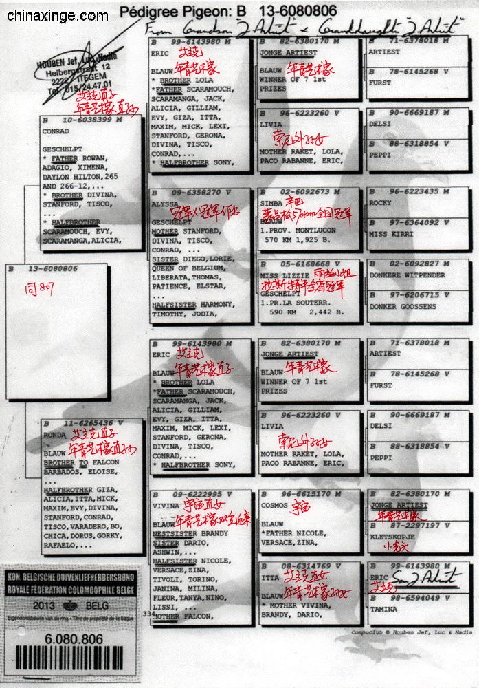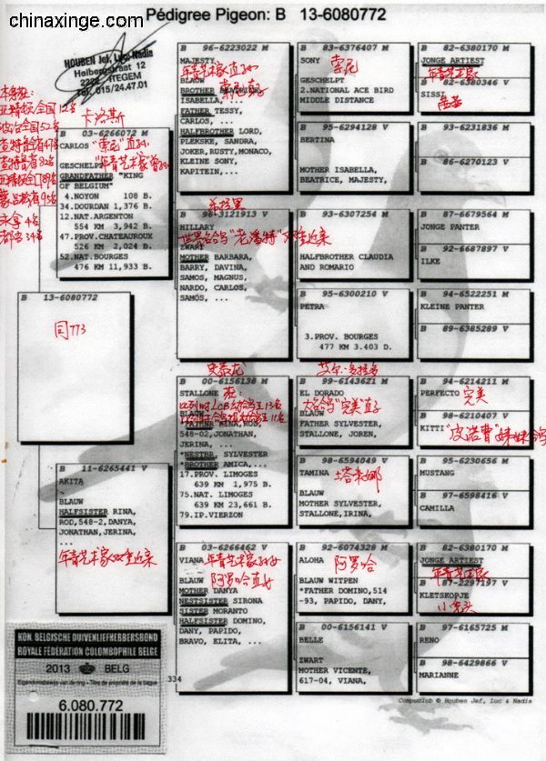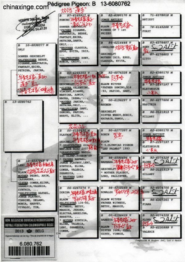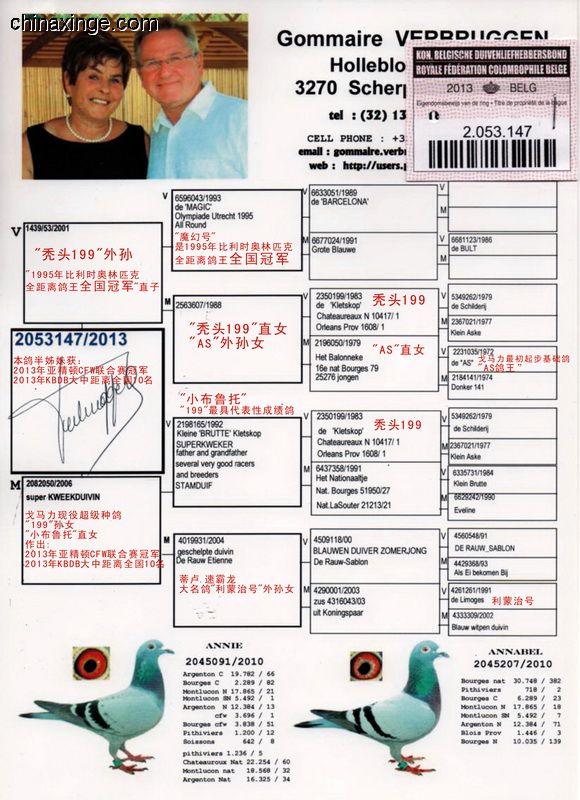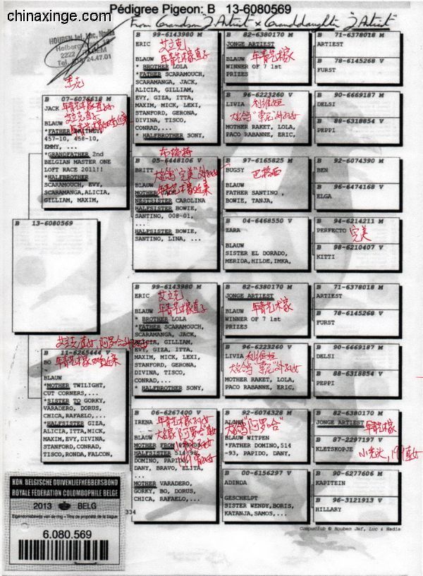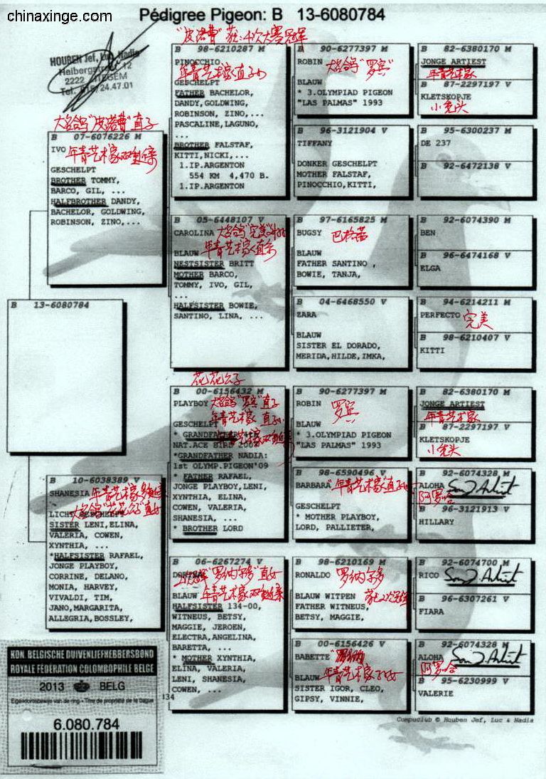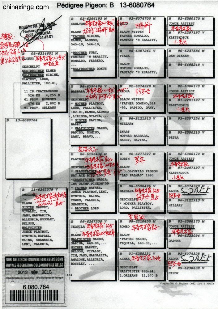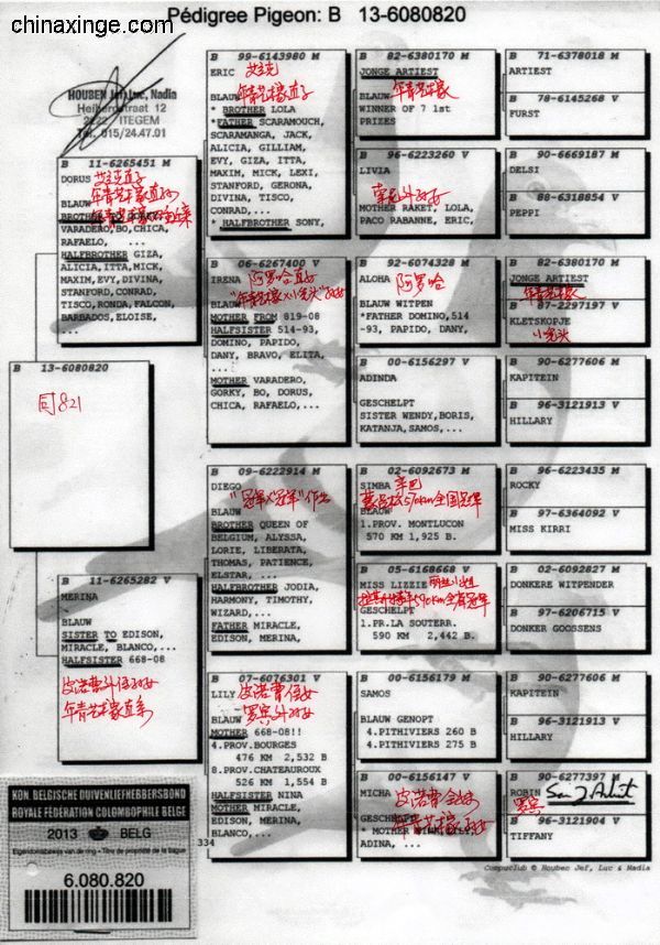 父親1439/889/2001 “199外孫” 祖父B93-1979344 “神奇號”,格里茨.路易恩。超級賽鴿,4次1名。10056羽1名,10229羽1名,5087羽1名,5038羽1名。NL726/87 萊卡特x慕利門x NL 787/91超級種雌作育 祖母B88-2563607 “199直女” 母親 B06-2082050 “199孫女” “小布魯托直女” 外祖父B92-2198165 “小布魯托” 超級種鴿。多羽頂級鴿的父親和祖父,“199直子” 外祖母B04-4019931 倚天.帝盧。118/00 灰,長距離鴿王全國2名兄弟x 001/03 “利蒙治”之女,“利蒙治號”為帝盧-速霸龍超級