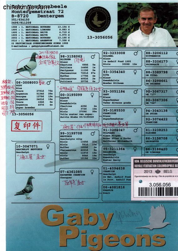 查特魯國家賽是今年比利時的第二場國家賽,5月30日集鴿,共集鴿41912羽,其中老鴿組22249羽,一歲鴿組19663羽,空距522公里左右。 當?shù)貢r間6月1日早上7點15分開籠放飛。 在此次查特魯國家賽中,最值得稱贊的是老將“電腦戈馬利”——戈馬利.佛布魯根,他不僅獲得了成鴿組的第3、8、60名的好成績,而且獲得了一歲鴿組的第47、69、76、79的好成績。 蓋比.凡德納比獲得一歲鴿組的第75名 旁邊是戈馬利3名.8名血統(tǒng)書