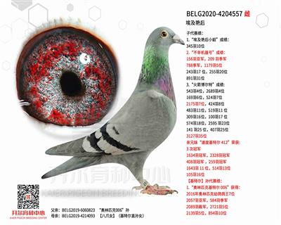 BELG2020-4204997 祖父本身榮獲: 2013 年 KBDB 全國鴿王 6 名 2013 年 KBDB 全國最佳鴿舍冠軍功臣鴿 拿永 1559 羽亞軍 拿永 1371 羽 5 名 拿永 1603 羽 5 名 拿永 1255 羽 10 名