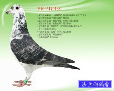 B10-5170174 B10-5170174(金白海歐)超級(jí)種鴿“吐尼爾018”“晚生麒麟花巴龍雌”子代 世界超級(jí)種鴿“馬拉松海鷗”“吐尼爾848”孫代 吐尼爾“超級(jí)262”“吐尼爾284”近親回血孫代 吐尼爾超級(jí)配對(duì)“白雪165X斯迪克狄-鐵輪919”近親回血曾孫代 吐尼爾世界名鴿“漂亮海鷗”“亞精頓省賽冠軍之母”后代 吐尼爾世界名鴿“波爾多I號(hào)”后代