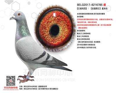 BELG2017-4231929 本身榮獲: 2017年巴利科夫 350 公里全國(guó)冠軍 613羽冠軍 372羽冠軍 139羽冠軍 在2019年作育出:1151羽冠軍 親兄妹代表成績(jī): 15次前1% 2019年省鴿王冠軍 2018年省鴿王季軍 2174羽冠軍 2250羽冠軍 1512羽冠軍 1270 羽亞軍
