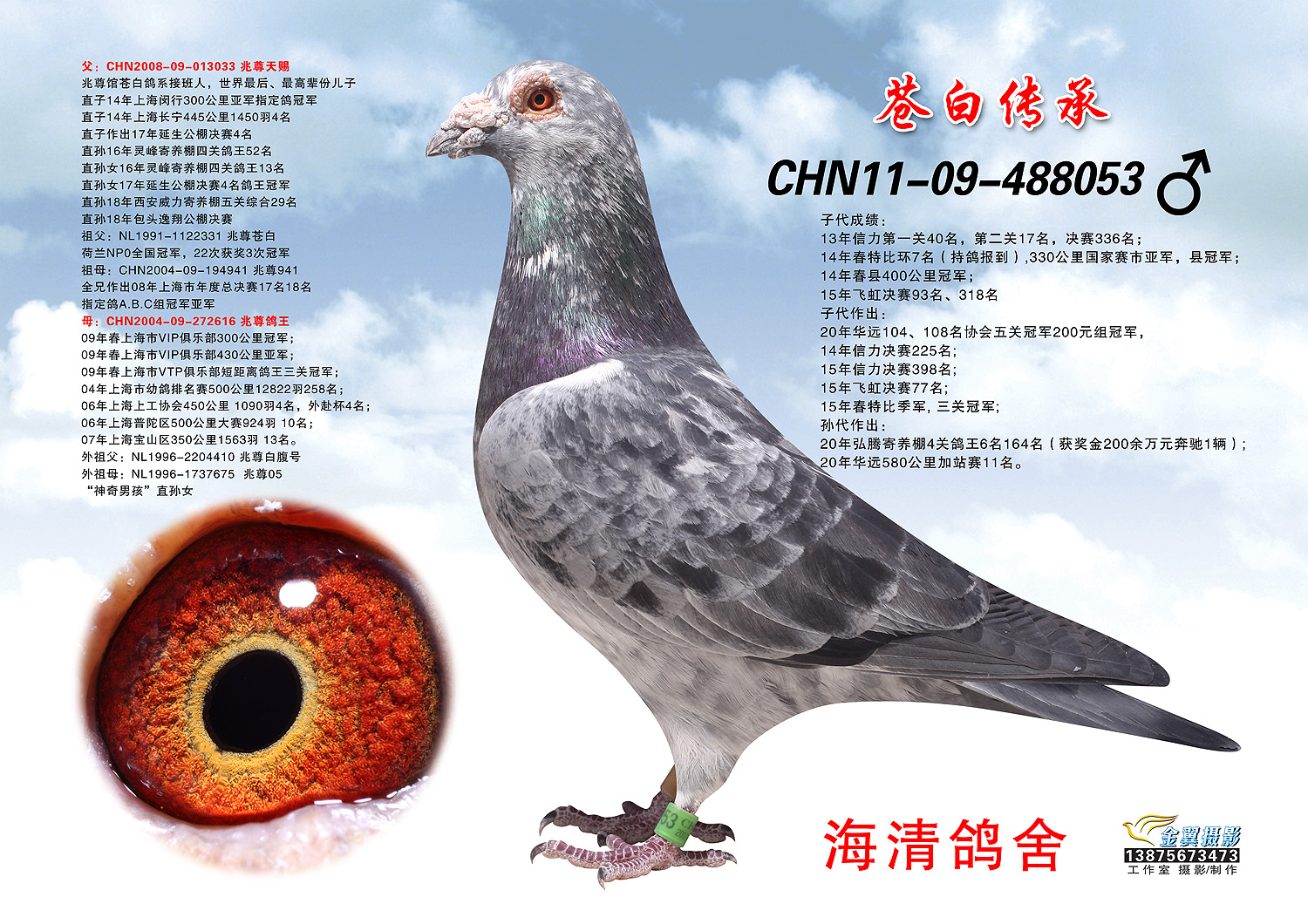 父親: 蒼白天賜(蒼白最后的兒子)CHN2008-09-013033 母親: 兆尊鴿王(多次高位進獎)CHN2004-09-272616