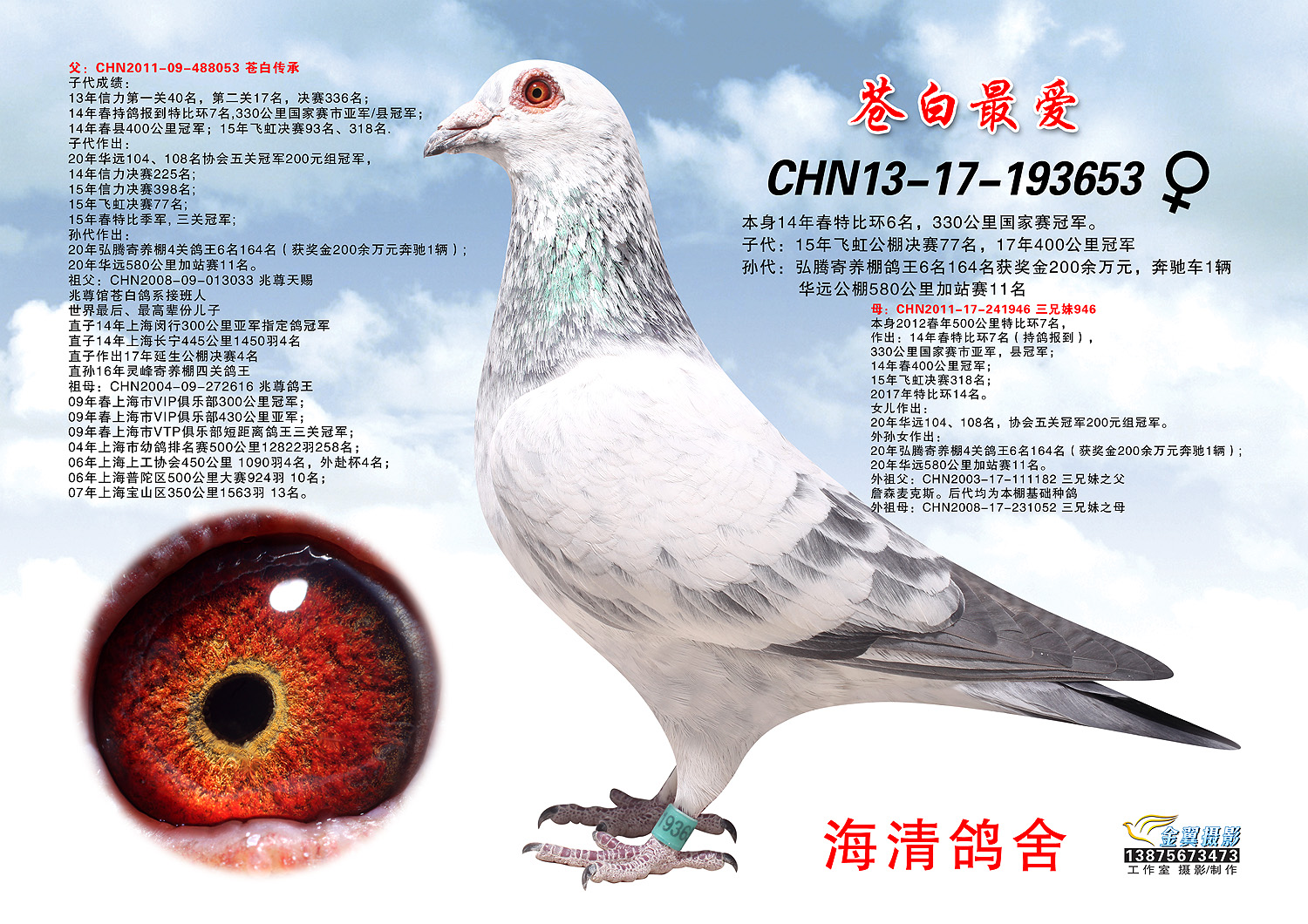本身500公里特比冠軍,330公里國(guó)家賽冠軍。 子孫代地方賽、公棚賽、寄養(yǎng)棚多羽高位進(jìn)獎(jiǎng)。