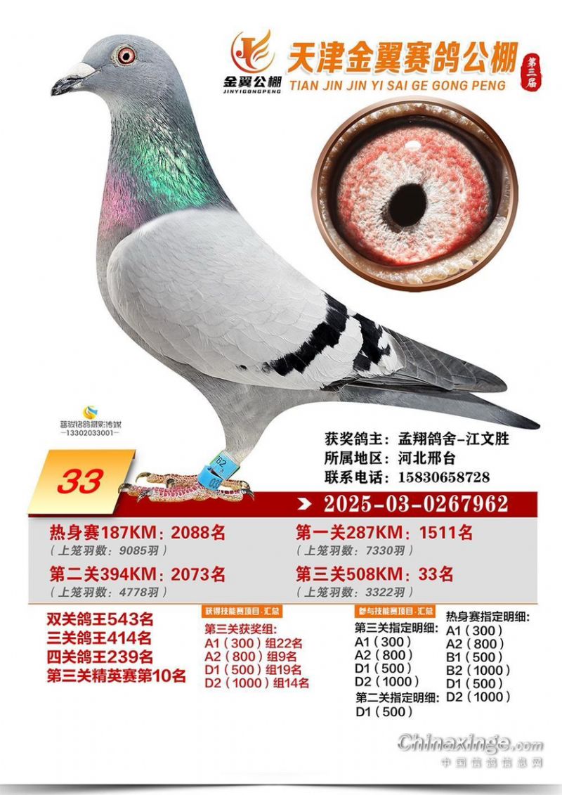 父親本舍新年輕克拉克262 母親天野四關(guān)鴿王冠軍X三關(guān)鴿王冠軍 全兄妹0419089獲得24年遼寧創(chuàng)翼公棚決賽60名 祖父2229120天野花鴿王 天野公棚300公里52名400公里25名530公里16名雙關(guān)鴿王冠軍三關(guān)鴿王冠軍 祖母1840209天野紅輪鴿王 天野公棚180公里83名300公里26名445公里38名530公里36名雙關(guān)鴿王7名三關(guān)鴿王亞軍四關(guān)鴿王冠軍