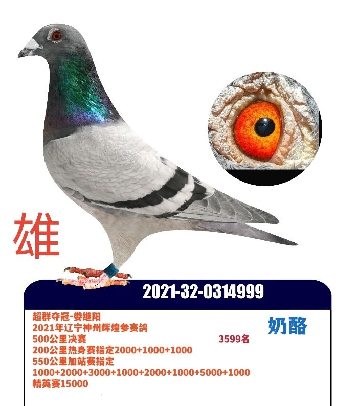 2021年遼寧繼陽鴿業(yè)-婁繼陽,環(huán)號(hào)豹子999,送遼寧神州輝煌賽鴿公棚,參賽費(fèi)11800元,550公里加站賽純網(wǎng)鴿,200公里1000+2000+1000指定,550公里加站賽,1000+2000+3000+2000+1000+1000+5000+1000,帶精英賽15000,總參賽費(fèi)46800元,雄,自身質(zhì)量非常高級(jí),全平輩神州決賽132名,589名,血統(tǒng),奶酪。