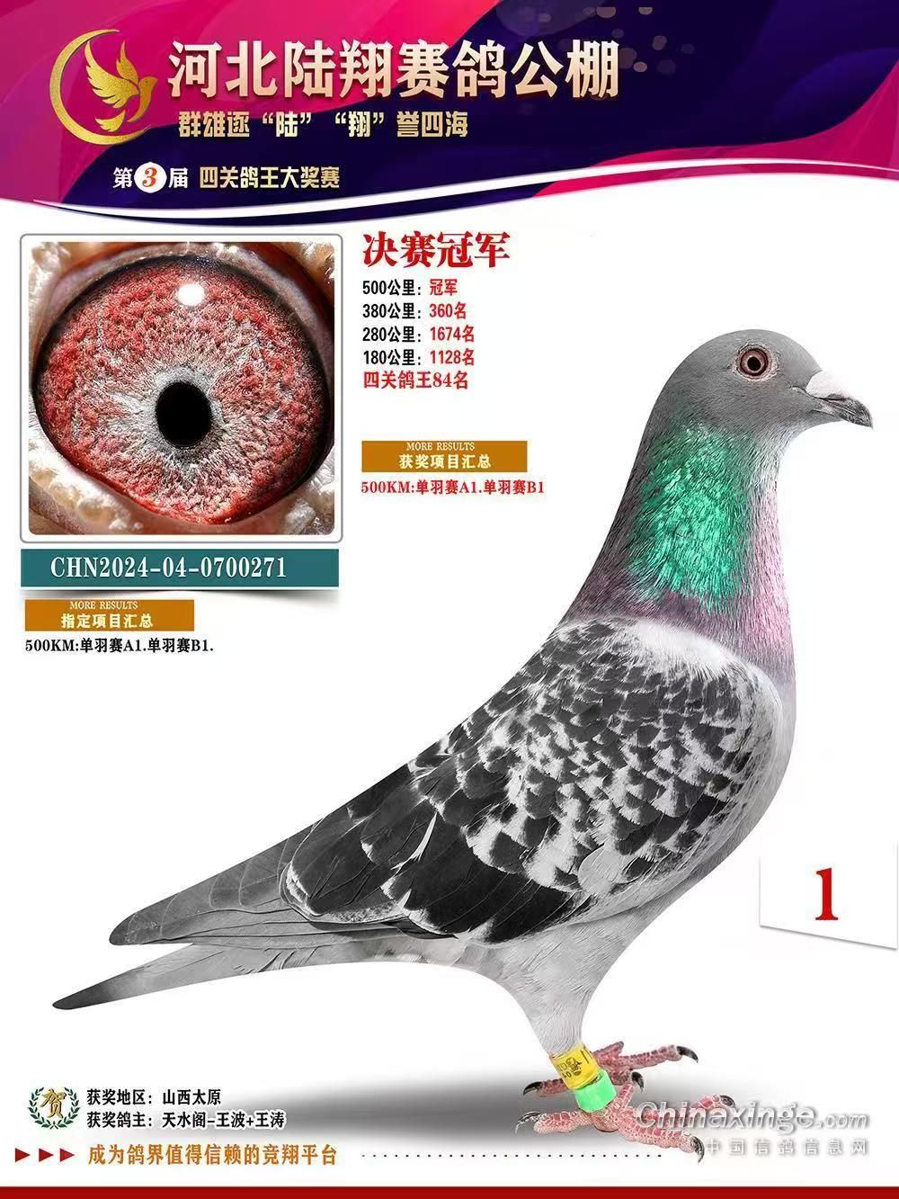 父系:不敗武器配天水閣母牛號直孫,本身太原鐵翔賽鴿俱樂部五關(guān)綜合鴿王28名, 母系:不敗王子曾孫配喬斯庫爾斯雌