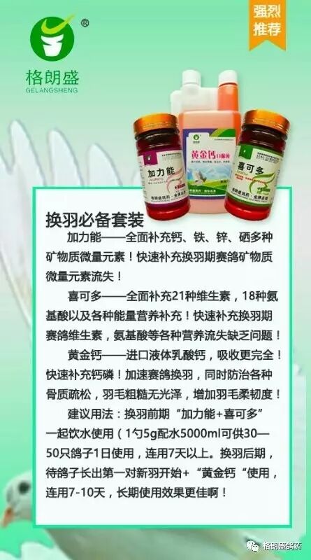二、換羽期賽鴿飼養(yǎng)管理要點。脫羽前7-10天采用低能量、低蛋白、低脂肪的營養(yǎng)鴿糧,當(dāng)進(jìn)入大量脫羽期時,開始喂食常規(guī)鴿糧。再換羽中后期開始營養(yǎng)補充,每天補充菜籽、芝麻、亞麻籽、紅花籽等營養(yǎng)成分。換羽期應(yīng)減少訓(xùn)放活動量,甚至停止訓(xùn)放,減少陰雨天氣的訓(xùn)放?山o賽鴿洗澡,不但加速脫羽,而且能加速新羽的長出。及時補充:礦物質(zhì)、微量元素、氨基酸、維生素的補充。