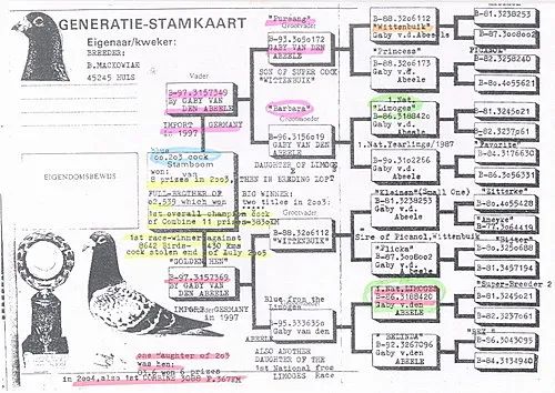 當Groten的所有兒子都在展示自身的飛行能力時,“花花公子”已經作為種鴿在種鴿舍中找到了自己的位置,像它這樣的種鴿,即使在蓋比的鴿系中也很難找。蓋比讓“花花公子”作為種鴿是根據直覺或一種特別的感覺,但決不是僅僅靠運氣。無論怎樣,它一到種鴿舍就顯示出了優(yōu)秀的品質。與“嬌小號”孫女“弗蘭克斯”(Francoise,B86-3046205)的結合,它育出了一對姐妹:B91-3024035和B91-3204036。令人不可置信的是這對姐妹在出生的第一年就取得非凡的成就。