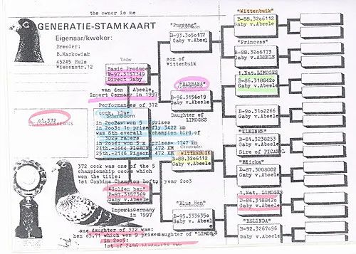 根據蓋比的一般原則,Groten的另一個成績優(yōu)異的兒子也應該被送到種鴿舍。下面我們就來看一下賽鴿精英Argenton,B89-3119047。它的母親是Anneke,B88-3206001,是Picanol和Bontje065育出的。Argenton還是幼鴿時就飛出了7個好名次,其中異常優(yōu)秀的是一次有24300羽賽鴿參賽的Argenton(506km)賽上,它取得了全國的第11名,考慮一下它這次取得的優(yōu)異成績就不難想象它的名字為什么叫Argenton了。還是一歲鴿時它飛出了8個靠前的名次,現在就來看一下它的成績:艾瑞斯(Arras)18位/122羽,Clermont第13位/146羽,Dourdan第15位/626羽,Orleans第4位/771羽,Orleans第8位/1337羽,Chateauroux第3位/6683羽,波提爾(Poitiers)第77位/4830羽,利蒙治(Limoges)全國賽第182位/22435羽。1992年在獲得6次非常突出的成績后,它就去了種鴿舍。我想蓋比·凡德納比鴿系獲得成功的秘訣就是:過早讓成績優(yōu)異的賽鴿進入種鴿舍育種。