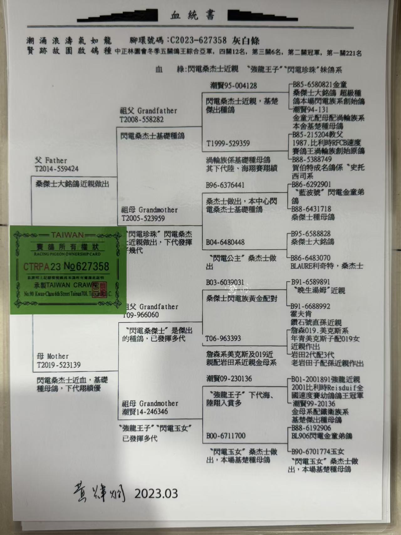 1597581 | 楊歐瓦克483近親 本身成績1000公里亞軍 | ¥200元 | 1次 |