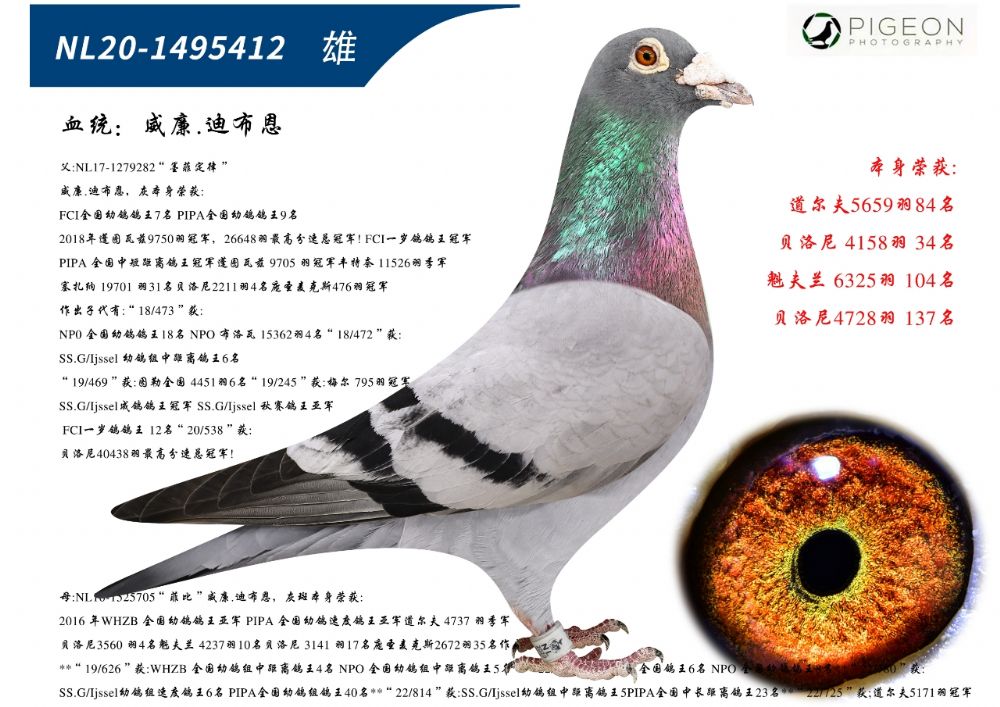 晟捷國際鴿業(yè):鴿主養(yǎng)鴿30余載,引進世界銘鴿,公棚鴿王,地方賽鴿王,前名次鴿多羽。鴿舍主血:利奧賀爾曼斯,楊胡曼斯哈利,奶酪,胡本,克拉克,詹森紅狐,麥克斯,51次,019,桑杰士,馬克羅森斯,戈馬力,速霸龍,東方不敗,喬斯佛卡門,小迪迪,,甘納斯,芬妮卡5000 晟捷國際鴿業(yè):代表成績:2009年獲得惠翔3名,團體冠軍, 2006年大鵝島公棚預(yù)賽21名,決賽84名。 2007年盛世公棚500公里決賽182名296名425名。 2008年盛世公棚500公里決賽61名,276名。 2009年獲得千山公棚決賽9名,鴿王10名.... 2011年獲得祺陽牧業(yè)決賽17名37名243名,團體5名。 2014年獲得丹東祺陽牧業(yè)決賽138名 2015年海逸國際公棚393名鴿王11名 2016年北戴河六藝國際公棚預(yù)賽26名,決賽51名。 藍湖欲鴿決賽73名,精英賽冠軍。 2017年大安信和公棚決賽233名300名414名。 北戴河六藝國際公棚預(yù)賽151名決賽145名 2018年春潮公棚決賽195名,376名 2019年綏中縱誠公棚500公里決賽59名 大慶臻翔公棚500公里決賽43名 海逸國際公棚四關(guān)鴿王13名 。