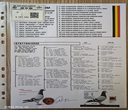 晟捷國際鴿業(yè):鴿主養(yǎng)鴿30余載,引進世界銘鴿,公棚鴿王,地方賽鴿王,前名次鴿多羽。鴿舍主血:利奧賀爾曼斯,楊胡曼斯哈利,奶酪,胡本,克拉克,詹森紅狐,麥克斯,51次,019,桑杰士,馬克羅森斯,戈馬力,速霸龍,東方不敗,喬斯佛卡門,小迪迪,,甘納斯,芬妮卡5000 晟捷國際鴿業(yè):代表成績:2009年獲得惠翔3名,團體冠軍, 2006年大鵝島公棚預賽21名,決賽84名。 2007年盛世公棚500公里決賽182名296名425名。 2008年盛世公棚500公里決賽61名,276名。 2009年獲得千山公棚決賽9名,鴿王10名.... 2011年獲得祺陽牧業(yè)決賽17名37名243名,團體5名。 2014年獲得丹東祺陽牧業(yè)決賽138名 2015年海逸國際公棚393名鴿王11名 2016年北戴河六藝國際公棚預賽26名,決賽51名。 藍湖欲鴿決賽73名,精英賽冠軍。 2017年大安信和公棚決賽233名300名414名。 北戴河六藝國際公棚預賽151名決賽145名 2018年春潮公棚決賽195名,376名 2019年綏中縱誠公棚500公里決賽59名 大慶臻翔公棚500公里決賽43名 海逸國際公棚四關鴿王13名 。