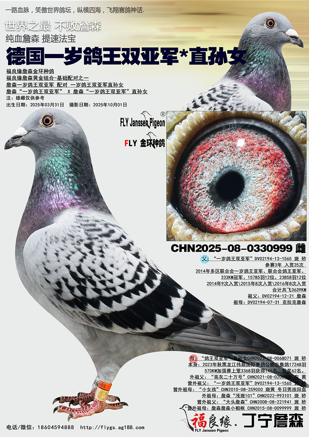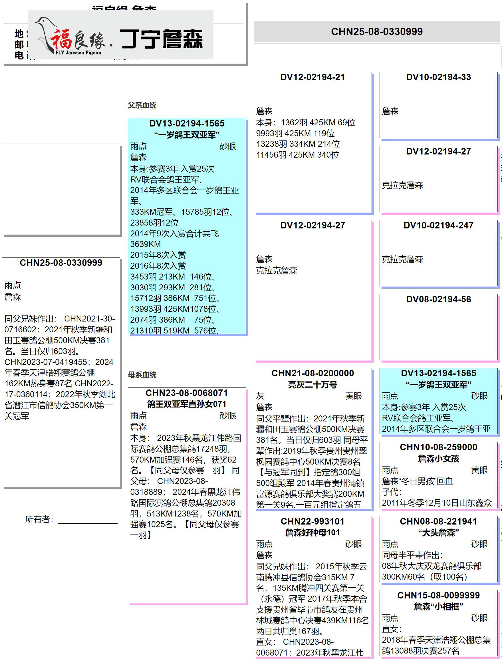 本身:參賽3年 入賞25次 RV聯(lián)合會鴿王亞軍、2014年多區(qū)聯(lián)合會一歲鴿王亞軍、333KM冠軍、15785羽12位、23858羽12位