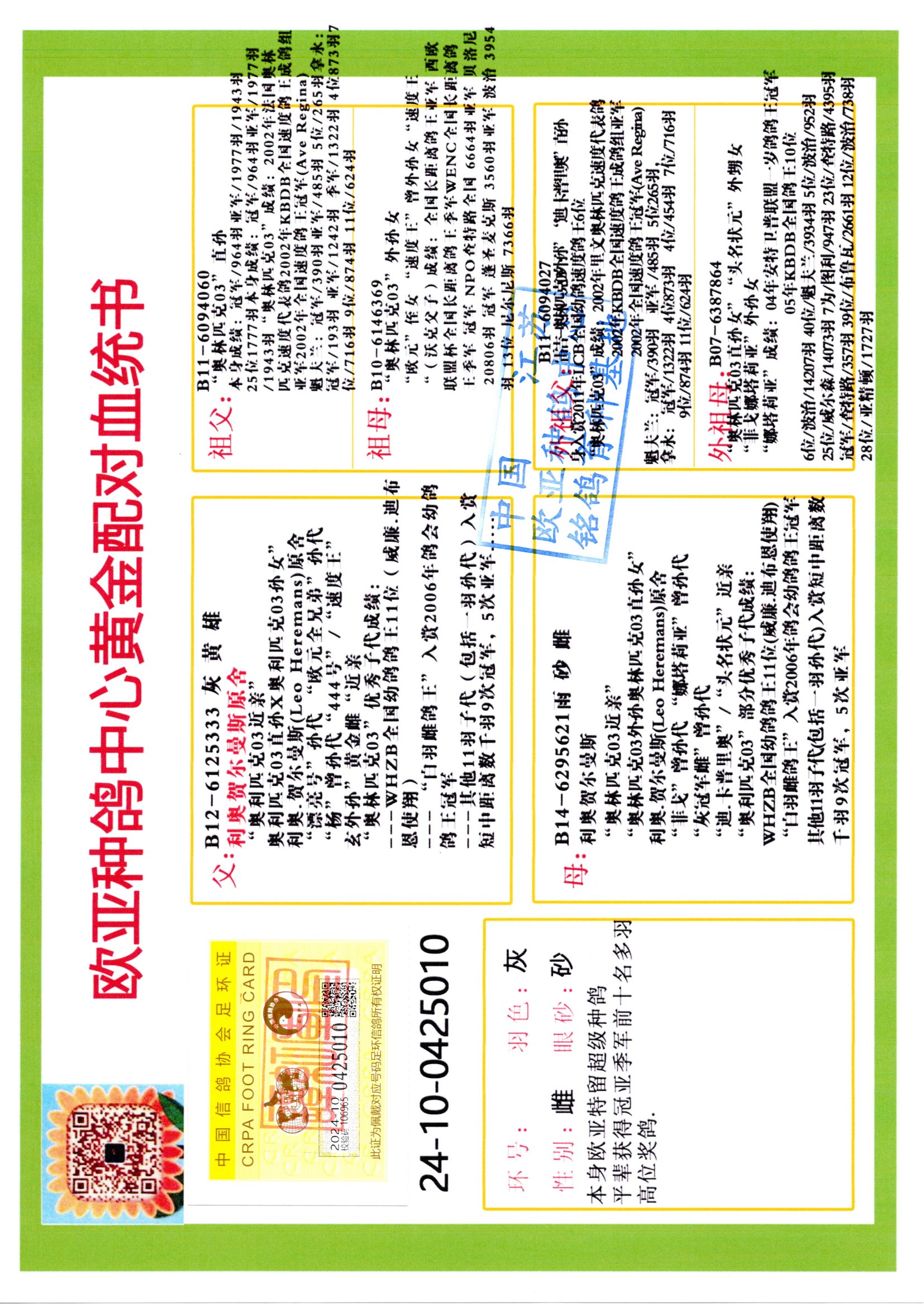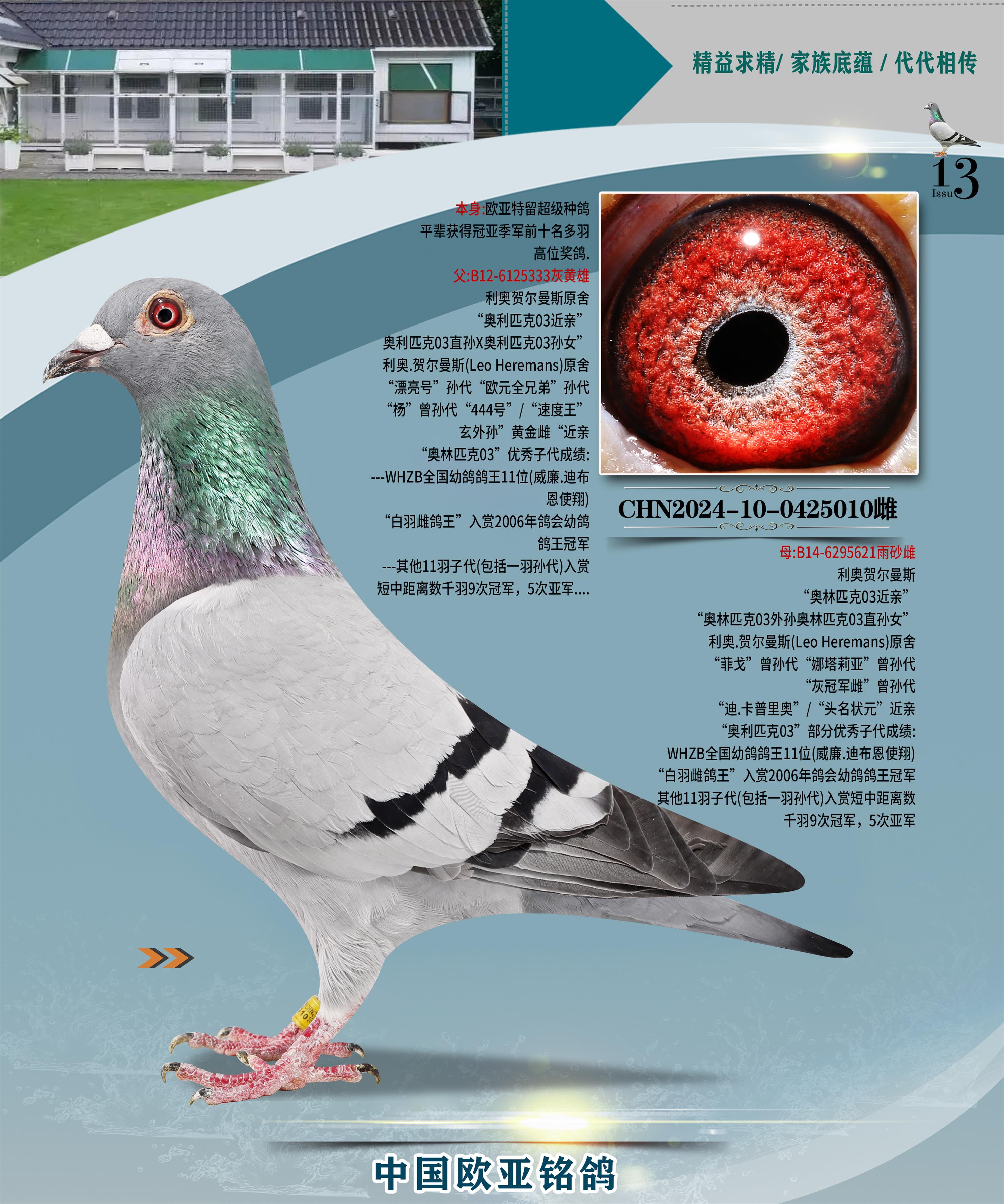 24年秋南京特比環(huán)歐亞榮獲大團(tuán)體冠軍.小團(tuán)體冠軍551公里大特比13名.14名.16名.19名.20名.21名.24名.26名.27名.28名.42名.52名.54名.57名.65名.66名.68名.70名.71名.72名.74名.76名.80名.82名.83名.84名.85名.86名.90名.92名.110名.116名.121名.122名.128名.131名.158名.161名.164名.165名.166名.172名.174名.177名.182名.195名.196名.201名.205名.208名.210名.216名.253名.269名.275名.276名.294名.296名.299名,,24年秋云南天南銅都公棚決賽415名.天南銅都小棚決賽409名.云南玉活公棚決賽102名.490名.團(tuán)體32名上籠二羽進(jìn)二羽,天南銅都大棚506公里決賽445名。熱烈祝賀河北省巨鹿縣李蘭生老師用歐亞泰山號(hào)血系連續(xù)十一年奪冠軍,河北省國(guó)家賽冠軍.全國(guó)季軍等多次前十名高位,揚(yáng)州王軍王總用歐亞利奧24年春季獲山東翔宇公棚決賽33名蓋比53名。南京劉正龍劉總用歐亞蓋比獲得24年秋山東濰坊國(guó)際公棚決賽42名.精英賽30名.三關(guān)鴿王71名.決賽86名.加站賽16名.南京市特比環(huán)A組鴿王9名.B組鴿王5名.6名.C組鴿王5名.精英賽冠軍4名.技能賽A組冠軍4名.5名.秦淮區(qū)特比環(huán)榮獲15名.46名.48名.87名。四川西昌徐亮徐總用歐亞利奧獲得涼山州聚友決賽177名.第二關(guān)亞軍雙關(guān)鴿王19名.三關(guān)鴿王105名.云南豪庭公棚決賽603名。熱烈祝賀24年四川重慶翔園鴿舍用歐亞泰山號(hào)榮獲春季400公里冠軍.秋季500公里冠軍,河北王總用詹森X利奧獲得千羽千翔公棚400公里冠軍,廣東蔡楷煥榮獲24年秋愛好者 賽鴿俱樂部三關(guān)鴿王季軍.一關(guān)420公里99名.二關(guān)450公里11名.三關(guān)520公里32名.單關(guān)季軍.7名.12名,江西李衛(wèi)興榮獲貴州紅楓公棚8名.共翔俱樂部寄養(yǎng)棚四關(guān)綜合鴿王30名.一關(guān)400公里78名.二關(guān)500公里55名.三關(guān)520公里37名.四關(guān)500公里57名.同父母獲公棚18名.雷鳴獲得武漢黃浦育翔中心冠軍,四川陳文獲得四川明鴻俱樂部300公里夢(mèng)幻2名.3名.4名.9名.10名.13名.14名.15名.31名.34名.40名.41名.42名.43名.69名.71名.72名.73名.74名.94名.95名.97名.98名.99名.419公里決賽榮獲總冠軍7名.總共歸巢9羽,四川徐亮獲豪庭決賽603名,山西鄭勇獲得山西泰鑫公棚決賽255名詹森紅狐,熱烈祝賀馬總獲得開爾(飛躍隊(duì))決賽9名獲獎(jiǎng)金1310000萬元.第一關(guān)52名,天津津福資賽180公里96名.獲獎(jiǎng)金429543萬元,歐亞支持全國(guó)鴿友24年秋多人報(bào)喜 祝大家取得更好成績(jī),給歐亞報(bào)喜鴿友歐亞決定給每人贈(zèng)送一羽超級(jí)種鴿。歐亞俱樂部特比環(huán)多關(guān)鴿王成績(jī):15年秋淮安特比環(huán)黑色星期一全會(huì)上籠9700多羽,當(dāng)天無鴿歸巢,第二天全會(huì)歸巢357羽,本舍歸巢158羽.前十名八羽.前一百名歸巢57羽,16年春季獲五關(guān)鴿王總冠軍,總亞軍四名.六名.七名.九名.十名.晶藝俱樂部520公里冠亞季軍5名.6名.7名.9名.11名等,火車頭冠軍.季軍6名.8名.9名.10名,16年秋晶藝俱樂部特比環(huán)520公里亞軍.季軍4名.6名.7名.9名,15年春南京白下特比環(huán)冠軍.亞軍.季軍6名.7名.8名.9名.10名.指定鴿A B組獲得冠軍.亞軍.季軍4名.5名.,17年淮安特比環(huán)亞軍.4名.5名.7名.8名.10名.六關(guān)鴿王總冠軍.4名.6名.9名.10名,寄養(yǎng)棚宿遷劉總20羽特比環(huán)獲冠軍.季軍.4名.7名.8名.9名等。18年榮獲萬羽特比環(huán)六關(guān)鴿王總冠軍.總亞軍.總季軍.6名.8名.十名.單關(guān)四羽冠軍.二羽亞軍.四羽季軍.前十名27羽。19年秋萬羽特比環(huán)六關(guān)鴿王總亞軍.總季軍.5名.8名等,單關(guān)二羽冠軍.三羽亞軍.一羽季軍前十名31羽。20年秋淮安市鴿會(huì)四關(guān)特比環(huán)大賽風(fēng)雨無阻鴿王亞軍.鴿王六名,金品俱樂部萬羽特比環(huán)六關(guān)鴿王總冠軍,總亞軍.四名.五名.六名.七名.八名.十名.前二百名鴿王35羽,單關(guān)冠亞季軍前十名四十多羽,火車頭五關(guān)鴿王季軍.六名.八名.前二百名鴿王十七羽。20年春榮獲淮安五區(qū)一市四關(guān)鴿王總冠軍.亞軍.四名.八名.九名。21年秋榮獲金品萬羽特比環(huán)大賽六關(guān)鴿王總亞軍.總季軍.四名.七名.九名.十名.單關(guān)冠亞軍季軍前十名三十多羽;疖囶^協(xié)會(huì)鴿王六名.七名.十名.單關(guān)前十名十七羽。22年秋榮獲鴿王總冠軍.總亞軍.5名.7名.8名.9名.11名.單關(guān)冠亞季軍前十名三十多羽,第一關(guān)單關(guān)前二百名四十多羽,第二關(guān)前二百名三十多羽,第三關(guān)前二百名四十多羽,第四關(guān)前二百名四十多羽,第五關(guān)前一百名53羽。23年秋榮獲鴿王季軍.五名.八名.十名.13名.17名.20名.27名等多羽鴿王.單關(guān)前十名二十多羽。公棚.寄養(yǎng)棚部分成績(jī):16年秋寧夏黃河公棚總冠軍電腦戈馬力指定通炮冠軍,17年送八羽參賽獲得鴿王八名進(jìn)獎(jiǎng)四名,支持韓總榮獲八名。支持鴿友榮獲寧夏中衛(wèi)公棚決賽總冠軍.精英賽冠軍,支持18年寧夏黃河公棚決賽冠軍詹森X泰山。安徽鼎博寄養(yǎng)棚院內(nèi)外四關(guān)鴿王總冠軍.鴿王十七名.三十七名同窩,鴿王39名.42名.58名.67名。18年山東公棚預(yù)賽冠軍.決賽65名.送八羽進(jìn)獎(jiǎng)五羽.指定獲奔馳汽車一輛。支持鴿友獲得云南藍(lán)云公棚冠軍.蓋比X佛卡門。支持鴿友榮獲云南銀集公棚決賽冠軍 詹森427X520血系 速度賽6700羽冠軍。17年榮獲金馬俱樂部寄養(y