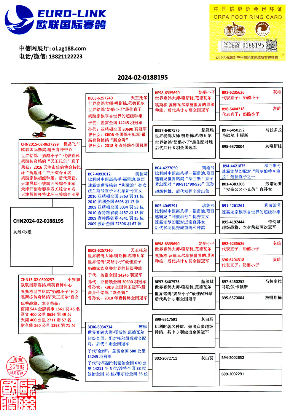 1598657 | 世界銘鴿“保時捷911”孫女/全國冠軍平輩 | ¥3600元 | 3次 |