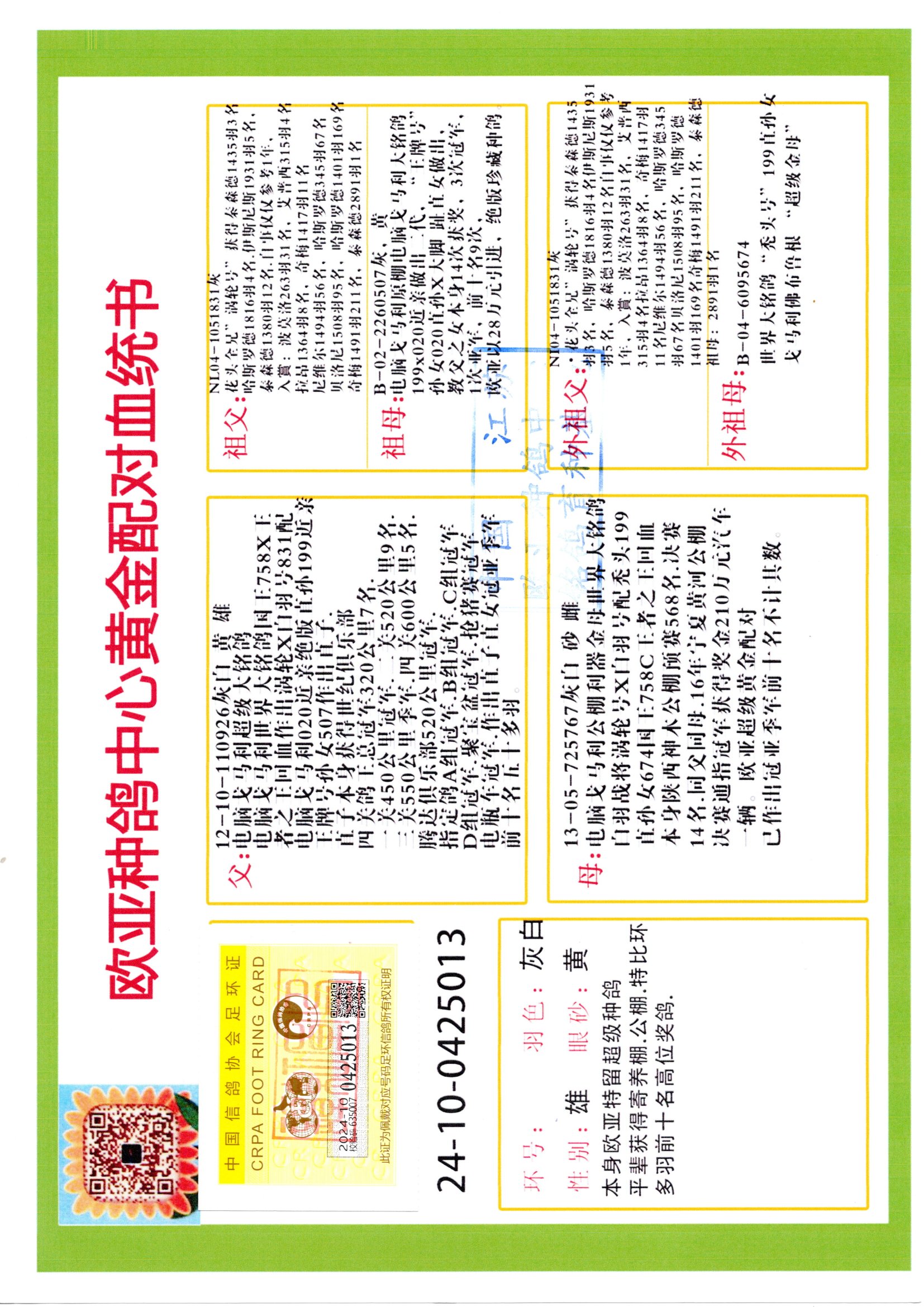 24年秋南京特比環(huán)歐亞榮獲大團(tuán)體冠軍.小團(tuán)體冠軍551公里大特比13名.14名.16名.19名.20名.21名.24名.26名.27名.28名.42名.52名.54名.57名.65名.66名.68名.70名.71名.72名.74名.76名.80名.82名.83名.84名.85名.86名.90名.92名.110名.116名.121名.122名.128名.131名.158名.161名.164名.165名.166名.172名.174名.177名.182名.195名.196名.201名.205名.208名.210名.216名.253名.269名.275名.276名.294名.296名.299名,,24年秋云南天南銅都公棚決賽415名.天南銅都小棚決賽409名.云南玉活公棚決賽102名.490名.團(tuán)體32名上籠二羽進(jìn)二羽,天南銅都大棚506公里決賽445名。熱烈祝賀河北省巨鹿縣李蘭生老師用歐亞泰山號血系連續(xù)十一年奪冠軍,河北省國家賽冠軍.全國季軍等多次前十名高位,揚(yáng)州王軍王總用歐亞利奧24年春季獲山東翔宇公棚決賽33名蓋比53名。南京劉正龍劉總用歐亞蓋比獲得24年秋山東濰坊國際公棚決賽42名.精英賽30名.三關(guān)鴿王71名.決賽86名.加站賽16名.南京市特比環(huán)A組鴿王9名.B組鴿王5名.6名.C組鴿王5名.精英賽冠軍4名.技能賽A組冠軍4名.5名.秦淮區(qū)特比環(huán)榮獲15名.46名.48名.87名。四川西昌徐亮徐總用歐亞利奧獲得涼山州聚友決賽177名.第二關(guān)亞軍雙關(guān)鴿王19名.三關(guān)鴿王105名.云南豪庭公棚決賽603名。熱烈祝賀24年四川重慶翔園鴿舍用歐亞泰山號榮獲春季400公里冠軍.秋季500公里冠軍,河北王總用詹森X利奧獲得千羽千翔公棚400公里冠軍,廣東蔡楷煥榮獲24年秋愛好者 賽鴿俱樂部三關(guān)鴿王季軍.一關(guān)420公里99名.二關(guān)450公里11名.三關(guān)520公里32名.單關(guān)季軍.7名.12名,江西李衛(wèi)興榮獲貴州紅楓公棚8名.共翔俱樂部寄養(yǎng)棚四關(guān)綜合鴿王30名.一關(guān)400公里78名.二關(guān)500公里55名.三關(guān)520公里37名.四關(guān)500公里57名.同父母獲公棚18名.雷鳴獲得武漢黃浦育翔中心冠軍,四川陳文獲得四川明鴻俱樂部300公里夢幻2名.3名.4名.9名.10名.13名.14名.15名.31名.34名.40名.41名.42名.43名.69名.71名.72名.73名.74名.94名.95名.97名.98名.99名.419公里決賽榮獲總冠軍7名.總共歸巢9羽,四川徐亮獲豪庭決賽603名,山西鄭勇獲得山西泰鑫公棚決賽255名詹森紅狐,熱烈祝賀馬總獲得開爾(飛躍隊)決賽9名獲獎金1310000萬元.第一關(guān)52名,天津津福資賽180公里96名.獲獎金429543萬元,歐亞支持全國鴿友24年秋多人報喜 祝大家取得更好成績,給歐亞報喜鴿友歐亞決定給每人贈送一羽超級種鴿。歐亞俱樂部特比環(huán)多關(guān)鴿王成績:15年秋淮安特比環(huán)黑色星期一全會上籠9700多羽,當(dāng)天無鴿歸巢,第二天全會歸巢357羽,本舍歸巢158羽.前十名八羽.前一百名歸巢57羽,16年春季獲五關(guān)鴿王總冠軍,總亞軍四名.六名.七名.九名.十名.晶藝俱樂部520公里冠亞季軍5名.6名.7名.9名.11名等,火車頭冠軍.季軍6名.8名.9名.10名,16年秋晶藝俱樂部特比環(huán)520公里亞軍.季軍4名.6名.7名.9名,15年春南京白下特比環(huán)冠軍.亞軍.季軍6名.7名.8名.9名.10名.指定鴿A B組獲得冠軍.亞軍.季軍4名.5名.,17年淮安特比環(huán)亞軍.4名.5名.7名.8名.10名.六關(guān)鴿王總冠軍.4名.6名.9名.10名,寄養(yǎng)棚宿遷劉總20羽特比環(huán)獲冠軍.季軍.4名.7名.8名.9名等。18年榮獲萬羽特比環(huán)六關(guān)鴿王總冠軍.總亞軍.總季軍.6名.8名.十名.單關(guān)四羽冠軍.二羽亞軍.四羽季軍.前十名27羽。19年秋萬羽特比環(huán)六關(guān)鴿王總亞軍.總季軍.5名.8名等,單關(guān)二羽冠軍.三羽亞軍.一羽季軍前十名31羽。20年秋淮安市鴿會四關(guān)特比環(huán)大賽風(fēng)雨無阻鴿王亞軍.鴿王六名,金品俱樂部萬羽特比環(huán)六關(guān)鴿王總冠軍,總亞軍.四名.五名.六名.七名.八名.十名.前二百名鴿王35羽,單關(guān)冠亞季軍前十名四十多羽,火車頭五關(guān)鴿王季軍.六名.八名.前二百名鴿王十七羽。20年春榮獲淮安五區(qū)一市四關(guān)鴿王總冠軍.亞軍.四名.八名.九名。21年秋榮獲金品萬羽特比環(huán)大賽六關(guān)鴿王總亞軍.總季軍.四名.七名.九名.十名.單關(guān)冠亞軍季軍前十名三十多羽。火車頭協(xié)會鴿王六名.七名.十名.單關(guān)前十名十七羽。22年秋榮獲鴿王總冠軍.總亞軍.5名.7名.8名.9名.11名.單關(guān)冠亞季軍前十名三十多羽,第一關(guān)單關(guān)前二百名四十多羽,第二關(guān)前二百名三十多羽,第三關(guān)前二百名四十多羽,第四關(guān)前二百名四十多羽,第五關(guān)前一百名53羽。23年秋榮獲鴿王季軍.五名.八名.十名.13名.17名.20名.27名等多羽鴿王.單關(guān)前十名二十多羽。公棚.寄養(yǎng)棚部分成績:16年秋寧夏黃河公棚總冠軍電腦戈馬力指定通炮冠軍,17年送八羽參賽獲得鴿王八名進(jìn)獎四名,支持韓總榮獲八名。支持鴿友榮獲寧夏中衛(wèi)公棚決賽總冠軍.精英賽冠軍,支持18年寧夏黃河公棚決賽冠軍詹森X泰山。安徽鼎博寄養(yǎng)棚院內(nèi)外四關(guān)鴿王總冠軍.鴿王十七名.三十七名同窩,鴿王39名.42名.58名.67名。18年山東公棚預(yù)賽冠軍.決賽65名.送八羽進(jìn)獎五羽.指定獲奔馳汽車一輛。支持鴿友獲得云南藍(lán)云公棚冠軍.蓋比X佛卡門。支持鴿友榮獲云南銀集公棚決賽冠軍 詹森427X520血系 速度賽6700羽冠軍。17年榮獲金馬俱樂部寄養(yǎng)棚四關(guān)鴿王總冠軍.季軍.六名.八名.第一關(guān)冠軍.亞軍.季軍四名.七名.十一名.金牌教練獎。支