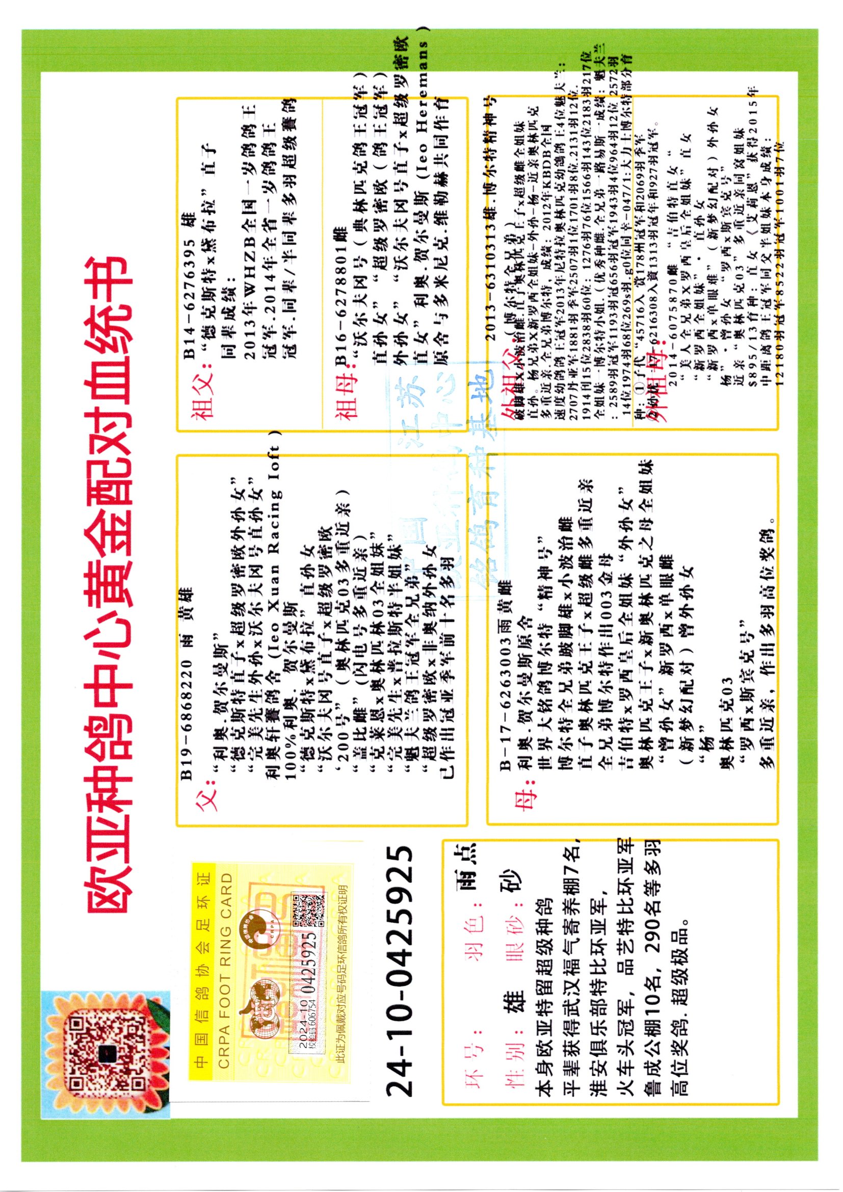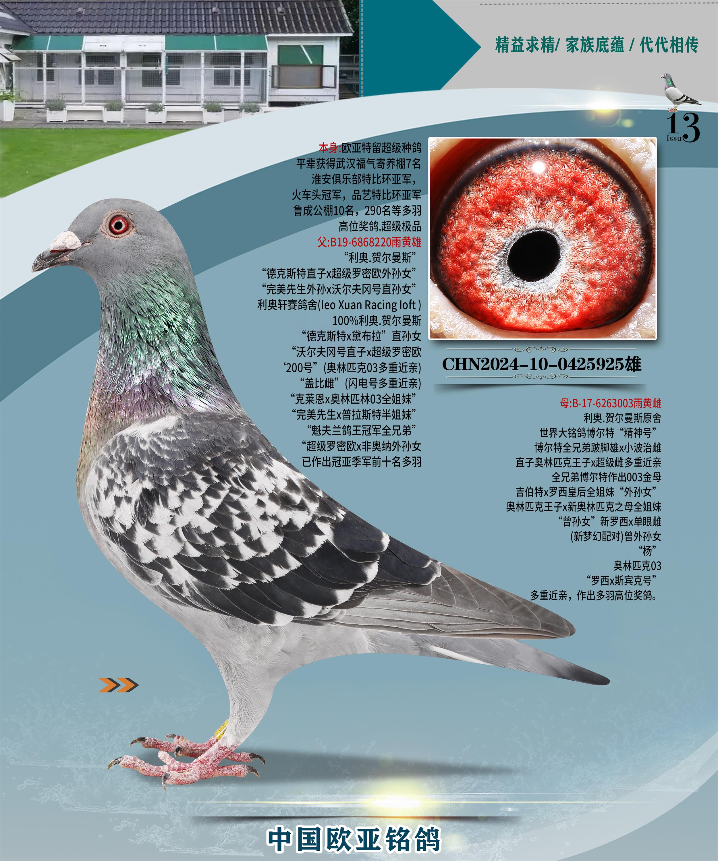 24年秋南京特比環(huán)歐亞榮獲大團(tuán)體冠軍.小團(tuán)體冠軍551公里大特比13名.14名.16名.19名.20名.21名.24名.26名.27名.28名.42名.52名.54名.57名.65名.66名.68名.70名.71名.72名.74名.76名.80名.82名.83名.84名.85名.86名.90名.92名.110名.116名.121名.122名.128名.131名.158名.161名.164名.165名.166名.172名.174名.177名.182名.195名.196名.201名.205名.208名.210名.216名.253名.269名.275名.276名.294名.296名.299名,,24年秋云南天南銅都公棚決賽415名.天南銅都小棚決賽409名.云南玉活公棚決賽102名.490名.團(tuán)體32名上籠二羽進(jìn)二羽,天南銅都大棚506公里決賽445名。熱烈祝賀河北省巨鹿縣李蘭生老師用歐亞泰山號血系連續(xù)十一年奪冠軍,河北省國家賽冠軍.全國季軍等多次前十名高位,揚州王軍王總用歐亞利奧24年春季獲山東翔宇公棚決賽33名蓋比53名。南京劉正龍劉總用歐亞蓋比獲得24年秋山東濰坊國際公棚決賽42名.精英賽30名.三關(guān)鴿王71名.決賽86名.加站賽16名.南京市特比環(huán)A組鴿王9名.B組鴿王5名.6名.C組鴿王5名.精英賽冠軍4名.技能賽A組冠軍4名.5名.秦淮區(qū)特比環(huán)榮獲15名.46名.48名.87名。四川西昌徐亮徐總用歐亞利奧獲得涼山州聚友決賽177名.第二關(guān)亞軍雙關(guān)鴿王19名.三關(guān)鴿王105名.云南豪庭公棚決賽603名。熱烈祝賀24年四川重慶翔園鴿舍用歐亞泰山號榮獲春季400公里冠軍.秋季500公里冠軍,河北王總用詹森X利奧獲得千羽千翔公棚400公里冠軍,廣東蔡楷煥榮獲24年秋愛好者 賽鴿俱樂部三關(guān)鴿王季軍.一關(guān)420公里99名.二關(guān)450公里11名.三關(guān)520公里32名.單關(guān)季軍.7名.12名,江西李衛(wèi)興榮獲貴州紅楓公棚8名.共翔俱樂部寄養(yǎng)棚四關(guān)綜合鴿王30名.一關(guān)400公里78名.二關(guān)500公里55名.三關(guān)520公里37名.四關(guān)500公里57名.同父母獲公棚18名.雷鳴獲得武漢黃浦育翔中心冠軍,四川陳文獲得四川明鴻俱樂部300公里夢幻2名.3名.4名.9名.10名.13名.14名.15名.31名.34名.40名.41名.42名.43名.69名.71名.72名.73名.74名.94名.95名.97名.98名.99名.419公里決賽榮獲總冠軍7名.總共歸巢9羽,四川徐亮獲豪庭決賽603名,山西鄭勇獲得山西泰鑫公棚決賽255名詹森紅狐,熱烈祝賀馬總獲得開爾(飛躍隊)決賽9名獲獎金1310000萬元.第一關(guān)52名,天津津福資賽180公里96名.獲獎金429543萬元,歐亞支持全國鴿友24年秋多人報喜 祝大家取得更好成績,給歐亞報喜鴿友歐亞決定給每人贈送一羽超級種鴿。歐亞俱樂部特比環(huán)多關(guān)鴿王成績:15年秋淮安特比環(huán)黑色星期一全會上籠9700多羽,當(dāng)天無鴿歸巢,第二天全會歸巢357羽,本舍歸巢158羽.前十名八羽.前一百名歸巢57羽,16年春季獲五關(guān)鴿王總冠軍,總亞軍四名.六名.七名.九名.十名.晶藝俱樂部520公里冠亞季軍5名.6名.7名.9名.11名等,火車頭冠軍.季軍6名.8名.9名.10名,16年秋晶藝俱樂部特比環(huán)520公里亞軍.季軍4名.6名.7名.9名,15年春南京白下特比環(huán)冠軍.亞軍.季軍6名.7名.8名.9名.10名.指定鴿A B組獲得冠軍.亞軍.季軍4名.5名.,17年淮安特比環(huán)亞軍.4名.5名.7名.8名.10名.六關(guān)鴿王總冠軍.4名.6名.9名.10名,寄養(yǎng)棚宿遷劉總20羽特比環(huán)獲冠軍.季軍.4名.7名.8名.9名等。18年榮獲萬羽特比環(huán)六關(guān)鴿王總冠軍.總亞軍.總季軍.6名.8名.十名.單關(guān)四羽冠軍.二羽亞軍.四羽季軍.前十名27羽。19年秋萬羽特比環(huán)六關(guān)鴿王總亞軍.總季軍.5名.8名等,單關(guān)二羽冠軍.三羽亞軍.一羽季軍前十名31羽。20年秋淮安市鴿會四關(guān)特比環(huán)大賽風(fēng)雨無阻鴿王亞軍.鴿王六名,金品俱樂部萬羽特比環(huán)六關(guān)鴿王總冠軍,總亞軍.四名.五名.六名.七名.八名.十名.前二百名鴿王35羽,單關(guān)冠亞季軍前十名四十多羽,火車頭五關(guān)鴿王季軍.六名.八名.前二百名鴿王十七羽。20年春榮獲淮安五區(qū)一市四關(guān)鴿王總冠軍.亞軍.四名.八名.九名。21年秋榮獲金品萬羽特比環(huán)大賽六關(guān)鴿王總亞軍.總季軍.四名.七名.九名.十名.單關(guān)冠亞軍季軍前十名三十多羽;疖囶^協(xié)會鴿王六名.七名.十名.單關(guān)前十名十七羽。22年秋榮獲鴿王總冠軍.總亞軍.5名.7名.8名.9名.11名.單關(guān)冠亞季軍前十名三十多羽,第一關(guān)單關(guān)前二百名四十多羽,第二關(guān)前二百名三十多羽,第三關(guān)前二百名四十多羽,第四關(guān)前二百名四十多羽,第五關(guān)前一百名53羽。23年秋榮獲鴿王季軍.五名.八名.十名.13名.17名.20名.27名等多羽鴿王.單關(guān)前十名二十多羽。公棚.寄養(yǎng)棚部分成績:16年秋寧夏黃河公棚總冠軍電腦戈馬力指定通炮冠軍,17年送八羽參賽獲得鴿王八名進(jìn)獎四名,支持韓總榮獲八名。支持鴿友榮獲寧夏中衛(wèi)公棚決賽總冠軍.精英賽冠軍,支持18年寧夏黃河公棚決賽冠軍詹森X泰山。安徽鼎博寄養(yǎng)棚院內(nèi)外四關(guān)鴿王總冠軍.鴿王十七名.三十七名同窩,鴿王39名.42名.58名.67名。18年山東公棚預(yù)賽冠軍.決賽65名.送八羽進(jìn)獎五羽.指定獲奔馳汽車一輛。支持鴿友獲得云南藍(lán)云公棚冠軍.蓋比X佛卡門。支持鴿友榮獲云南銀集公棚決賽冠軍 詹森427X520血系 速度賽6700羽冠軍。17年榮獲金馬俱樂部寄養(yǎng)棚四關(guān)鴿王總冠軍.季軍.六名.八名.第一關(guān)冠軍.亞軍.季軍四名.七名.十一名.金牌教練獎。支持鴿友18