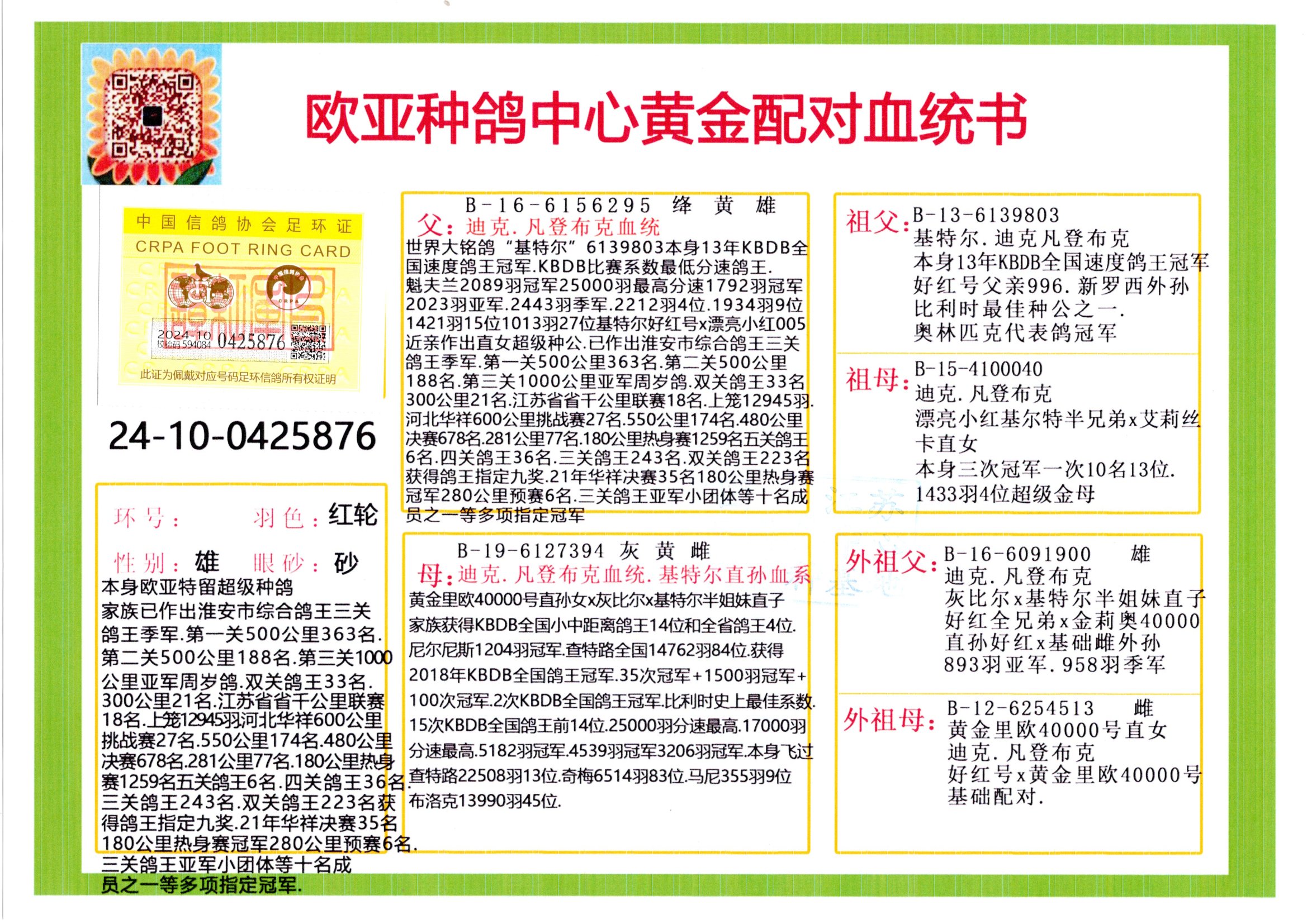 24年秋南京特比環(huán)歐亞榮獲大團體冠軍.小團體冠軍551公里大特比13名.14名.16名.19名.20名.21名.24名.26名.27名.28名.42名.52名.54名.57名.65名.66名.68名.70名.71名.72名.74名.76名.80名.82名.83名.84名.85名.86名.90名.92名.110名.116名.121名.122名.128名.131名.158名.161名.164名.165名.166名.172名.174名.177名.182名.195名.196名.201名.205名.208名.210名.216名.253名.269名.275名.276名.294名.296名.299名,,24年秋云南天南銅都公棚決賽415名.天南銅都小棚決賽409名.云南玉活公棚決賽102名.490名.團體32名上籠二羽進二羽,天南銅都大棚506公里決賽445名。熱烈祝賀河北省巨鹿縣李蘭生老師用歐亞泰山號血系連續(xù)十一年奪冠軍,河北省國家賽冠軍.全國季軍等多次前十名高位,揚州王軍王總用歐亞利奧24年春季獲山東翔宇公棚決賽33名蓋比53名。南京劉正龍劉總用歐亞蓋比獲得24年秋山東濰坊國際公棚決賽42名.精英賽30名.三關鴿王71名.決賽86名.加站賽16名.南京市特比環(huán)A組鴿王9名.B組鴿王5名.6名.C組鴿王5名.精英賽冠軍4名.技能賽A組冠軍4名.5名.秦淮區(qū)特比環(huán)榮獲15名.46名.48名.87名。四川西昌徐亮徐總用歐亞利奧獲得涼山州聚友決賽177名.第二關亞軍雙關鴿王19名.三關鴿王105名.云南豪庭公棚決賽603名。熱烈祝賀24年四川重慶翔園鴿舍用歐亞泰山號榮獲春季400公里冠軍.秋季500公里冠軍,河北王總用詹森X利奧獲得千羽千翔公棚400公里冠軍,廣東蔡楷煥榮獲24年秋愛好者 賽鴿俱樂部三關鴿王季軍.一關420公里99名.二關450公里11名.三關520公里32名.單關季軍.7名.12名,江西李衛(wèi)興榮獲貴州紅楓公棚8名.共翔俱樂部寄養(yǎng)棚四關綜合鴿王30名.一關400公里78名.二關500公里55名.三關520公里37名.四關500公里57名.同父母獲公棚18名.雷鳴獲得武漢黃浦育翔中心冠軍,四川陳文獲得四川明鴻俱樂部300公里夢幻2名.3名.4名.9名.10名.13名.14名.15名.31名.34名.40名.41名.42名.43名.69名.71名.72名.73名.74名.94名.95名.97名.98名.99名.419公里決賽榮獲總冠軍7名.總共歸巢9羽,四川徐亮獲豪庭決賽603名,山西鄭勇獲得山西泰鑫公棚決賽255名詹森紅狐,熱烈祝賀馬總獲得開爾(飛躍隊)決賽9名獲獎金1310000萬元.第一關52名,天津津福資賽180公里96名.獲獎金429543萬元,歐亞支持全國鴿友24年秋多人報喜 祝大家取得更好成績,給歐亞報喜鴿友歐亞決定給每人贈送一羽超級種鴿。歐亞俱樂部特比環(huán)多關鴿王成績:15年秋淮安特比環(huán)黑色星期一全會上籠9700多羽,當天無鴿歸巢,第二天全會歸巢357羽,本舍歸巢158羽.前十名八羽.前一百名歸巢57羽,16年春季獲五關鴿王總冠軍,總亞軍四名.六名.七名.九名.十名.晶藝俱樂部520公里冠亞季軍5名.6名.7名.9名.11名等,火車頭冠軍.季軍6名.8名.9名.10名,16年秋晶藝俱樂部特比環(huán)520公里亞軍.季軍4名.6名.7名.9名,15年春南京白下特比環(huán)冠軍.亞軍.季軍6名.7名.8名.9名.10名.指定鴿A B組獲得冠軍.亞軍.季軍4名.5名.,17年淮安特比環(huán)亞軍.4名.5名.7名.8名.10名.六關鴿王總冠軍.4名.6名.9名.10名,寄養(yǎng)棚宿遷劉總20羽特比環(huán)獲冠軍.季軍.4名.7名.8名.9名等。18年榮獲萬羽特比環(huán)六關鴿王總冠軍.總亞軍.總季軍.6名.8名.十名.單關四羽冠軍.二羽亞軍.四羽季軍.前十名27羽。19年秋萬羽特比環(huán)六關鴿王總亞軍.總季軍.5名.8名等,單關二羽冠軍.三羽亞軍.一羽季軍前十名31羽。20年秋淮安市鴿會四關特比環(huán)大賽風雨無阻鴿王亞軍.鴿王六名,金品俱樂部萬羽特比環(huán)六關鴿王總冠軍,總亞軍.四名.五名.六名.七名.八名.十名.前二百名鴿王35羽,單關冠亞季軍前十名四十多羽,火車頭五關鴿王季軍.六名.八名.前二百名鴿王十七羽。20年春榮獲淮安五區(qū)一市四關鴿王總冠軍.亞軍.四名.八名.九名。21年秋榮獲金品萬羽特比環(huán)大賽六關鴿王總亞軍.總季軍.四名.七名.九名.十名.單關冠亞軍季軍前十名三十多羽;疖囶^協(xié)會鴿王六名.七名.十名.單關前十名十七羽。22年秋榮獲鴿王總冠軍.總亞軍.5名.7名.8名.9名.11名.單關冠亞季軍前十名三十多羽,第一關單關前二百名四十多羽,第二關前二百名三十多羽,第三關前二百名四十多羽,第四關前二百名四十多羽,第五關前一百名53羽。23年秋榮獲鴿王季軍.五名.八名.十名.13名.17名.20名.27名等多羽鴿王.單關前十名二十多羽。公棚.寄養(yǎng)棚部分成績:16年秋寧夏黃河公棚總冠軍電腦戈馬力指定通炮冠軍,17年送八羽參賽獲得鴿王八名進獎四名,支持韓總榮獲八名。支持鴿友榮獲寧夏中衛(wèi)公棚決賽總冠軍.精英賽冠軍,支持18年寧夏黃河公棚決賽冠軍詹森X泰山。安徽鼎博寄養(yǎng)棚院內外四關鴿王總冠軍.鴿王十七名.三十七名同窩,鴿王39名.42名.58名.67名。18年山東公棚預賽冠軍.決賽65名.送八羽進獎五羽.指定獲奔馳汽車一輛。支持鴿友獲得云南藍云公棚冠軍.蓋比X佛卡門。支持鴿友榮獲云南銀集公棚決賽冠軍 詹森427X520血系 速度賽6700羽冠軍。17年榮獲金馬俱樂部寄養(yǎng)棚四關鴿王總冠軍.季軍.六名.八名.第一關冠軍.亞軍.季軍四名.七名.十一名.金牌教練獎。支持鴿友18年北京費翔公棚預賽九名電腦X桑杰士,支持鴿友榮獲陜西威力公棚決賽11名.內蒙古臨河寄養(yǎng)棚四關鴿王六名.詹森配泰山,支持河北王總用歐亞詹森427配胡本喜獲20年秋開爾青年棚季軍。云南東榮公棚16年預賽冠軍.決賽77名.17年決賽12名.詹森紅狐X泰山,17年平安公棚決賽4名