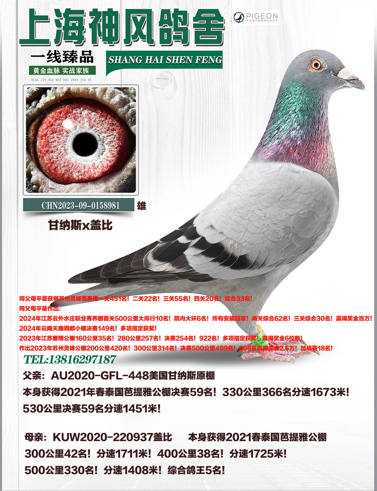 祖父:AU205-GFL-80甘納斯三大種鴿“銀紡訴說”同父母兄弟。銀紡訴說獲得2013年南非百萬美金公棚決賽亞軍!