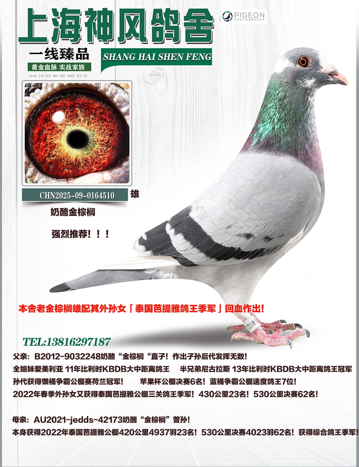 自身獲得蘋果杯公棚賽鴿王冠軍!作出子代獲得蘋果杯公棚決賽8名!綜合7名!尼亞拉加公棚賽鴿王4位!2022年泰國(guó)芭提雅公棚420公里4937羽23名!530公里決賽4023羽62名!獲得綜合鴿王季軍!