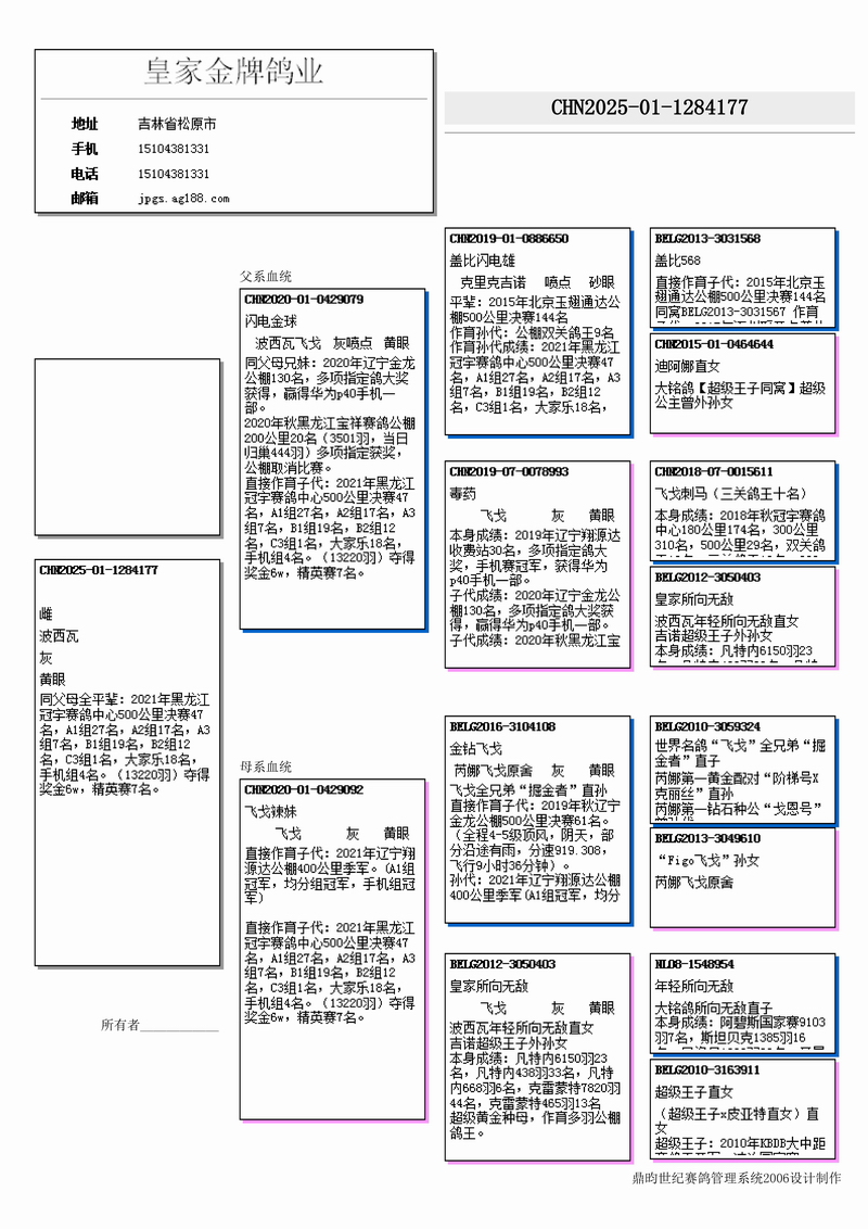直接作育子代:2021年遼寧翔源達公棚400公里季軍。(A1組冠軍,均分組冠軍,手機組冠軍)