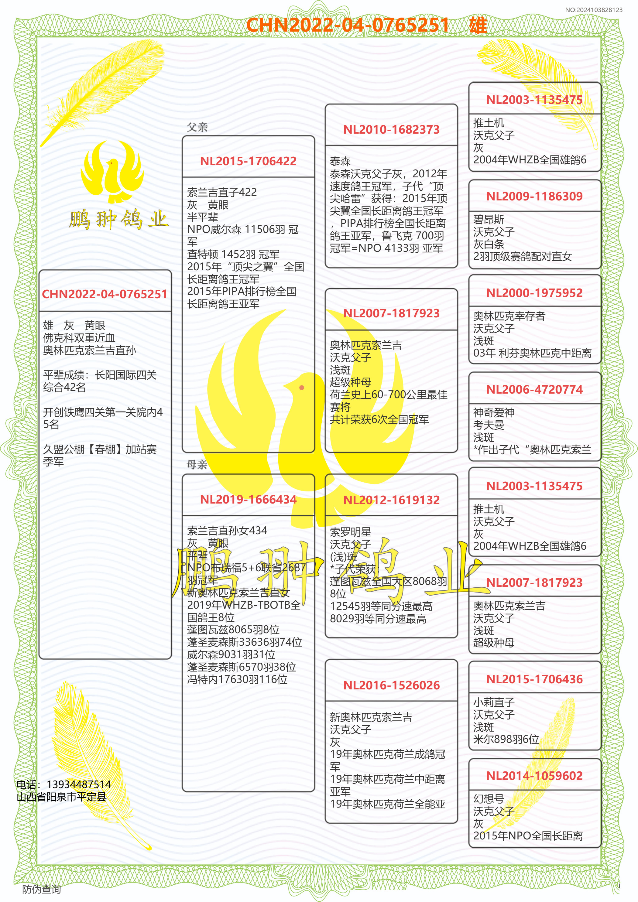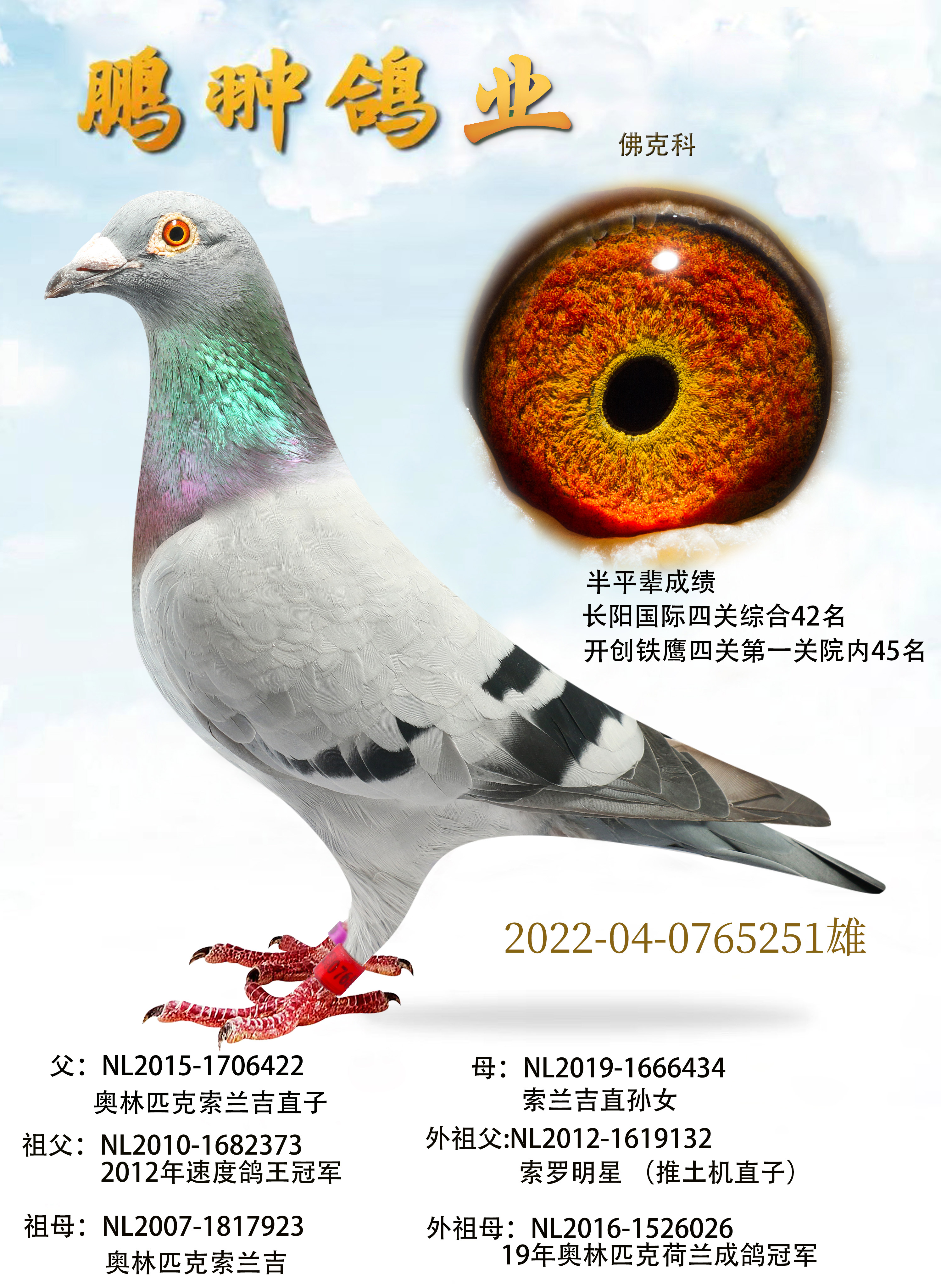 2012年速度鴿王冠軍,子代“頂尖哈雷”獲得:2015年頂尖翼全國(guó)長(zhǎng)距離鴿王冠軍,PIPA排行榜全國(guó)長(zhǎng)距離鴿王亞軍,魯飛克 700羽 冠軍=NPO 4133羽 亞軍,NPO威爾森 11506羽 18位,NPO布洛瓦 15515羽 21位,NPO波治 9742羽 33位,尼威爾 5616羽 5位,