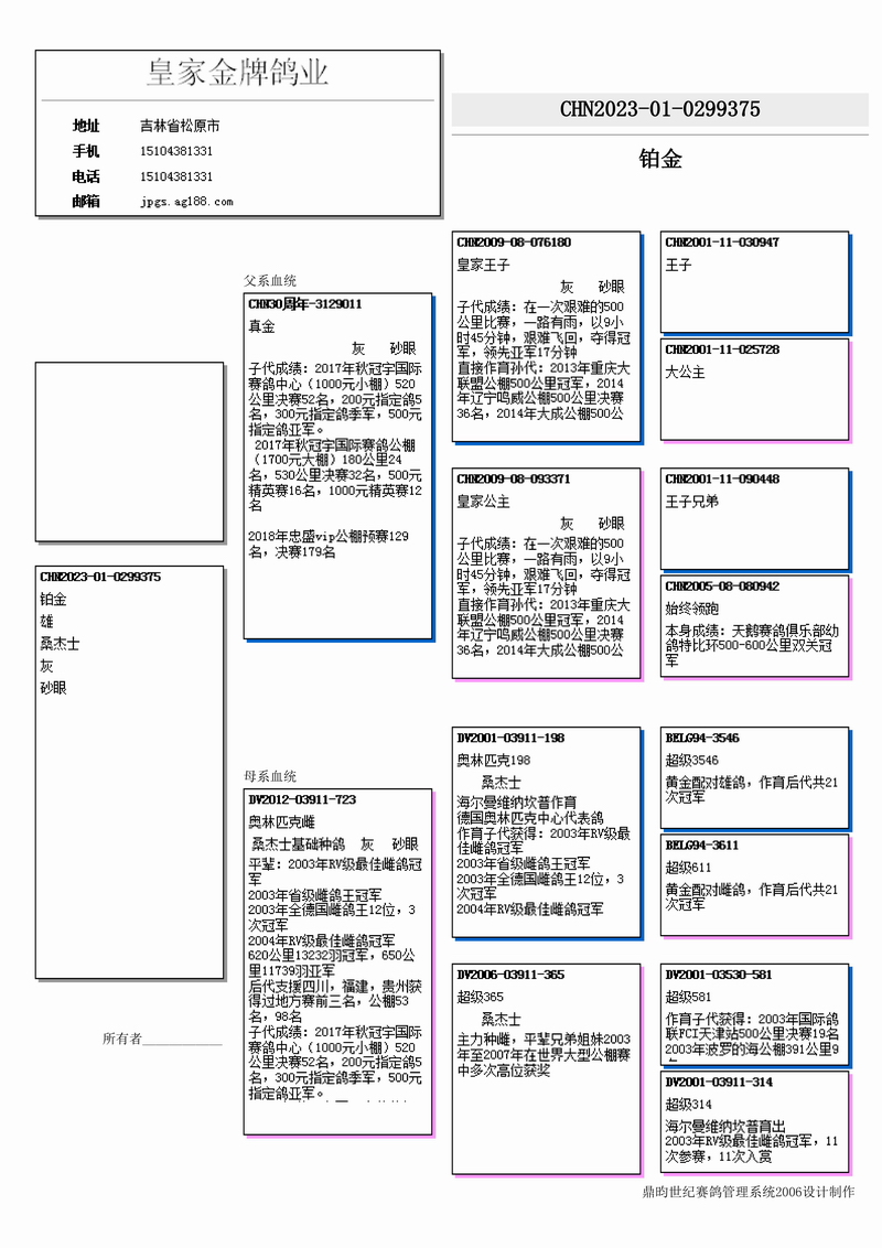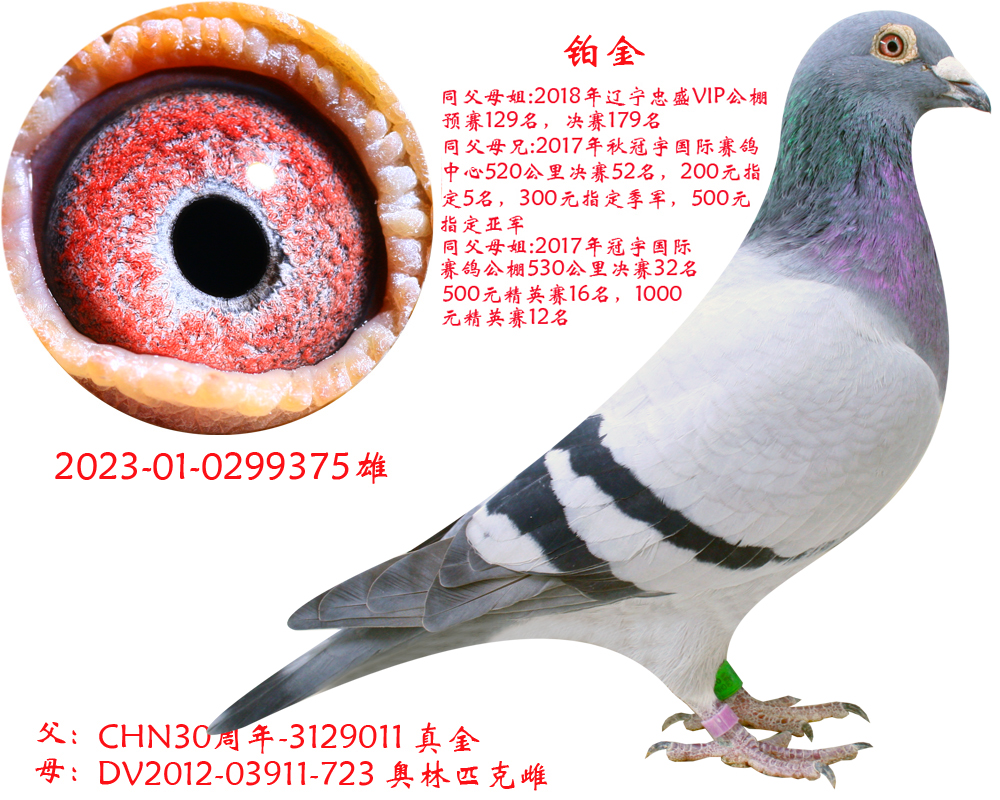 子代成績:2017年秋冠宇國際賽鴿中心(1000元小棚)520公里決賽52名,200元指定鴿5名,300元指定鴿季軍,500元指定鴿亞軍。