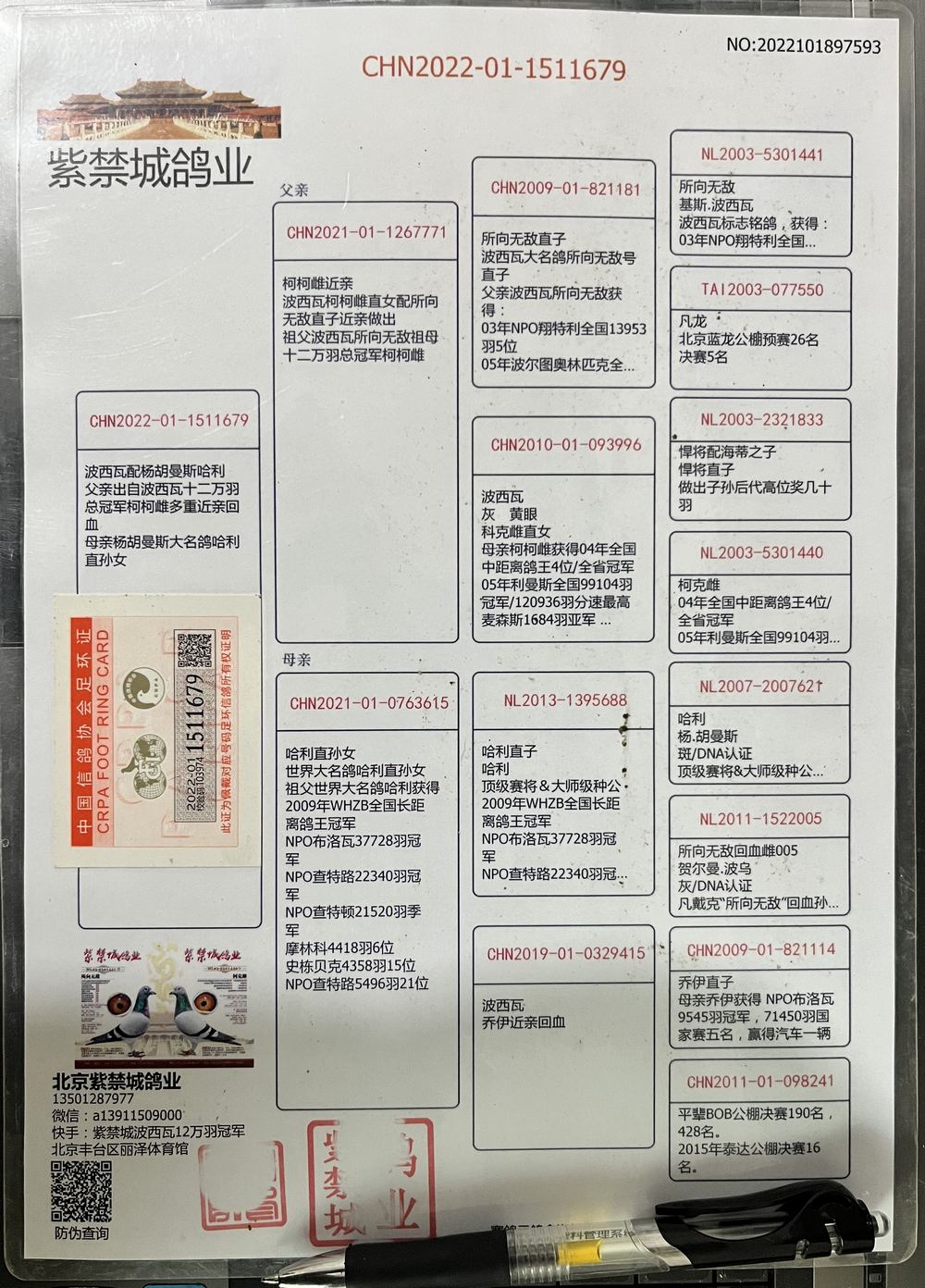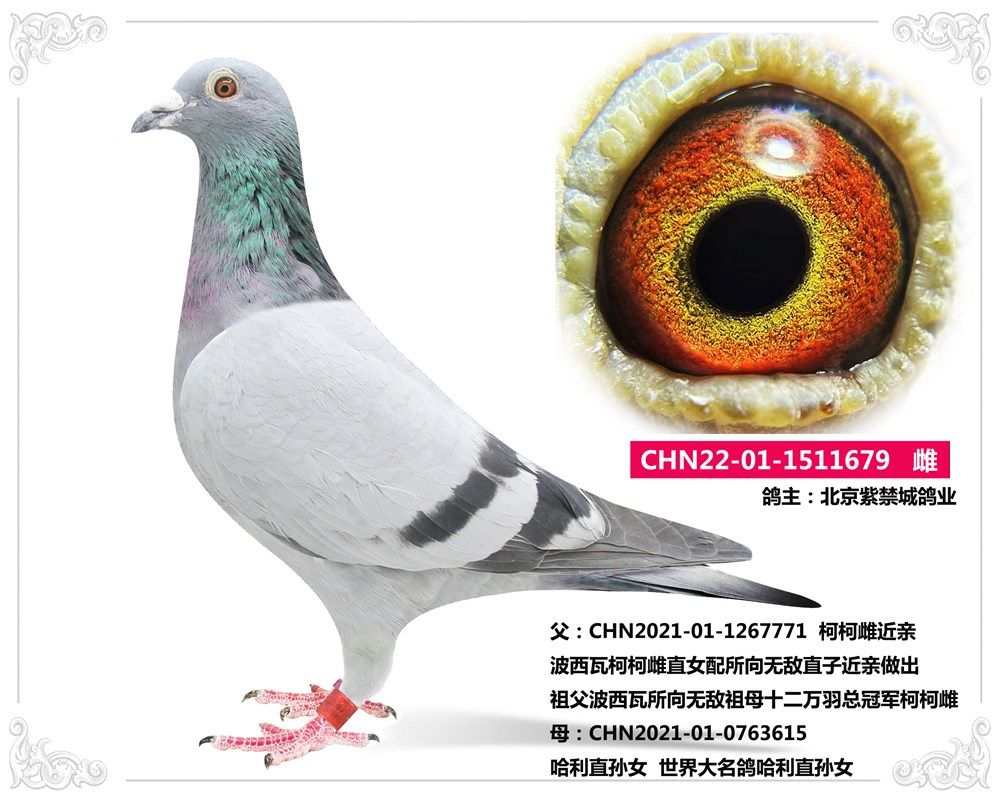 母:CHN2021-01-0763615 哈利直孫女 世界大名鴿哈利直孫女 祖父世界大名鴿哈利獲得2009年WHZB全國長距離鴿王冠軍;NPO布洛瓦37728羽冠軍;NPO查特路22340羽冠軍;NPO查特頓21520羽季軍;摩林科4418羽6位;史棟貝克4358羽15位;NPO查特路5496羽21位;