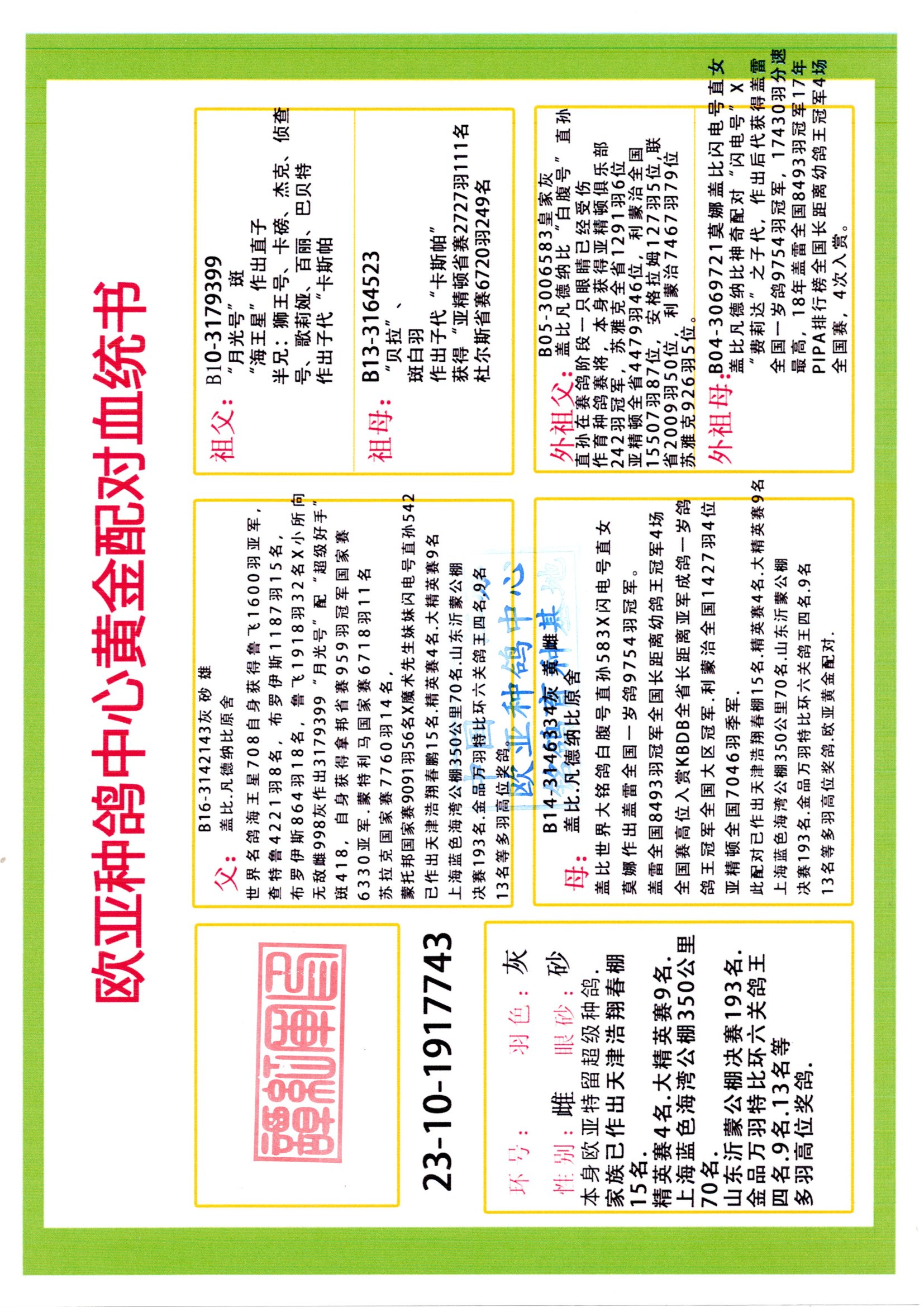 24年秋南京特比環(huán)歐亞榮獲大團(tuán)體冠軍.小團(tuán)體冠軍551公里大特比13名.14名.16名.19名.20名.21名.24名.26名.27名.28名.42名.52名.54名.57名.65名.66名.68名.70名.71名.72名.74名.76名.80名.82名.83名.84名.85名.86名.90名.92名.110名.116名.121名.122名.128名.131名.158名.161名.164名.165名.166名.172名.174名.177名.182名.195名.196名.201名.205名.208名.210名.216名.253名.269名.275名.276名.294名.296名.299名,,24年秋云南天南銅都公棚決賽415名.天南銅都小棚決賽409名.云南玉活公棚決賽102名.490名.團(tuán)體32名上籠二羽進(jìn)二羽,天南銅都大棚506公里決賽445名。熱烈祝賀河北省巨鹿縣李蘭生老師用歐亞泰山號血系連續(xù)十一年奪冠軍,河北省國家賽冠軍.全國季軍等多次前十名高位,揚(yáng)州王軍王總用歐亞利奧24年春季獲山東翔宇公棚決賽33名蓋比53名。南京劉正龍劉總用歐亞蓋比獲得24年秋山東濰坊國際公棚決賽42名.精英賽30名.三關(guān)鴿王71名.決賽86名.加站賽16名.南京市特比環(huán)A組鴿王9名.B組鴿王5名.6名.C組鴿王5名.精英賽冠軍4名.技能賽A組冠軍4名.5名.秦淮區(qū)特比環(huán)榮獲15名.46名.48名.87名。四川西昌徐亮徐總用歐亞利奧獲得涼山州聚友決賽177名.第二關(guān)亞軍雙關(guān)鴿王19名.三關(guān)鴿王105名.云南豪庭公棚決賽603名。熱烈祝賀24年四川重慶翔園鴿舍用歐亞泰山號榮獲春季400公里冠軍.秋季500公里冠軍,河北王總用詹森X利奧獲得千羽千翔公棚400公里冠軍,廣東蔡楷煥榮獲24年秋愛好者 賽鴿俱樂部三關(guān)鴿王季軍.一關(guān)420公里99名.二關(guān)450公里11名.三關(guān)520公里32名.單關(guān)季軍.7名.12名,江西李衛(wèi)興榮獲貴州紅楓公棚8名.共翔俱樂部寄養(yǎng)棚四關(guān)綜合鴿王30名.一關(guān)400公里78名.二關(guān)500公里55名.三關(guān)520公里37名.四關(guān)500公里57名.同父母獲公棚18名.雷鳴獲得武漢黃浦育翔中心冠軍,四川陳文獲得四川明鴻俱樂部300公里夢幻2名.3名.4名.9名.10名.13名.14名.15名.31名.34名.40名.41名.42名.43名.69名.71名.72名.73名.74名.94名.95名.97名.98名.99名.419公里決賽榮獲總冠軍7名.總共歸巢9羽,四川徐亮獲豪庭決賽603名,山西鄭勇獲得山西泰鑫公棚決賽255名詹森紅狐,熱烈祝賀馬總獲得開爾(飛躍隊(duì))決賽9名獲獎金1310000萬元.第一關(guān)52名,天津津福資賽180公里96名.獲獎金429543萬元,歐亞支持全國鴿友24年秋多人報(bào)喜 祝大家取得更好成績,給歐亞報(bào)喜鴿友歐亞決定給每人贈送一羽超級種鴿。歐亞俱樂部特比環(huán)多關(guān)鴿王成績:15年秋淮安特比環(huán)黑色星期一全會上籠9700多羽,當(dāng)天無鴿歸巢,第二天全會歸巢357羽,本舍歸巢158羽.前十名八羽.前一百名歸巢57羽,16年春季獲五關(guān)鴿王總冠軍,總亞軍四名.六名.七名.九名.十名.晶藝俱樂部520公里冠亞季軍5名.6名.7名.9名.11名等,火車頭冠軍.季軍6名.8名.9名.10名,16年秋晶藝俱樂部特比環(huán)520公里亞軍.季軍4名.6名.7名.9名,15年春南京白下特比環(huán)冠軍.亞軍.季軍6名.7名.8名.9名.10名.指定鴿A B組獲得冠軍.亞軍.季軍4名.5名.,17年淮安特比環(huán)亞軍.4名.5名.7名.8名.10名.六關(guān)鴿王總冠軍.4名.6名.9名.10名,寄養(yǎng)棚宿遷劉總20羽特比環(huán)獲冠軍.季軍.4名.7名.8名.9名等。18年榮獲萬羽特比環(huán)六關(guān)鴿王總冠軍.總亞軍.總季軍.6名.8名.十名.單關(guān)四羽冠軍.二羽亞軍.四羽季軍.前十名27羽。19年秋萬羽特比環(huán)六關(guān)鴿王總亞軍.總季軍.5名.8名等,單關(guān)二羽冠軍.三羽亞軍.一羽季軍前十名31羽。20年秋淮安市鴿會四關(guān)特比環(huán)大賽風(fēng)雨無阻鴿王亞軍.鴿王六名,金品俱樂部萬羽特比環(huán)六關(guān)鴿王總冠軍,總亞軍.四名.五名.六名.七名.八名.十名.前二百名鴿王35羽,單關(guān)冠亞季軍前十名四十多羽,火車頭五關(guān)鴿王季軍.六名.八名.前二百名鴿王十七羽。20年春榮獲淮安五區(qū)一市四關(guān)鴿王總冠軍.亞軍.四名.八名.九名。21年秋榮獲金品萬羽特比環(huán)大賽六關(guān)鴿王總亞軍.總季軍.四名.七名.九名.十名.單關(guān)冠亞軍季軍前十名三十多羽;疖囶^協(xié)會鴿王六名.七名.十名.單關(guān)前十名十七羽。22年秋榮獲鴿王總冠軍.總亞軍.5名.7名.8名.9名.11名.單關(guān)冠亞季軍前十名三十多羽,第一關(guān)單關(guān)前二百名四十多羽,第二關(guān)前二百名三十多羽,第三關(guān)前二百名四十多羽,第四關(guān)前二百名四十多羽,第五關(guān)前一百名53羽。23年秋榮獲鴿王季軍.五名.八名.十名.13名.17名.20名.27名等多羽鴿王.單關(guān)前十名二十多羽。公棚.寄養(yǎng)棚部分成績:16年秋寧夏黃河公棚總冠軍電腦戈馬力指定通炮冠軍,17年送八羽參賽獲得鴿王八名進(jìn)獎四名,支持韓總榮獲八名。支持鴿友榮獲寧夏中衛(wèi)公棚決賽總冠軍.精英賽冠軍,支持18年寧夏黃河公棚決賽冠軍詹森X泰山。安徽鼎博寄養(yǎng)棚院內(nèi)外四關(guān)鴿王總冠軍.鴿王十七名.三十七名同窩,鴿王39名.42名.58名.67名。18年山東公棚預(yù)賽冠軍.決賽65名.送八羽進(jìn)獎五羽.指定獲奔馳汽車一輛。支持鴿友獲得云南藍(lán)云公棚冠軍.蓋比X佛卡門。支持鴿友榮獲云南銀集公棚決賽冠軍 詹森427X520血系 速度賽6700羽冠軍。17年榮獲金馬俱樂部寄養(yǎng)棚四關(guān)鴿王總冠軍.季軍.六名.八名.第一關(guān)冠軍.亞軍.季軍四名.七名.十一名.金牌教