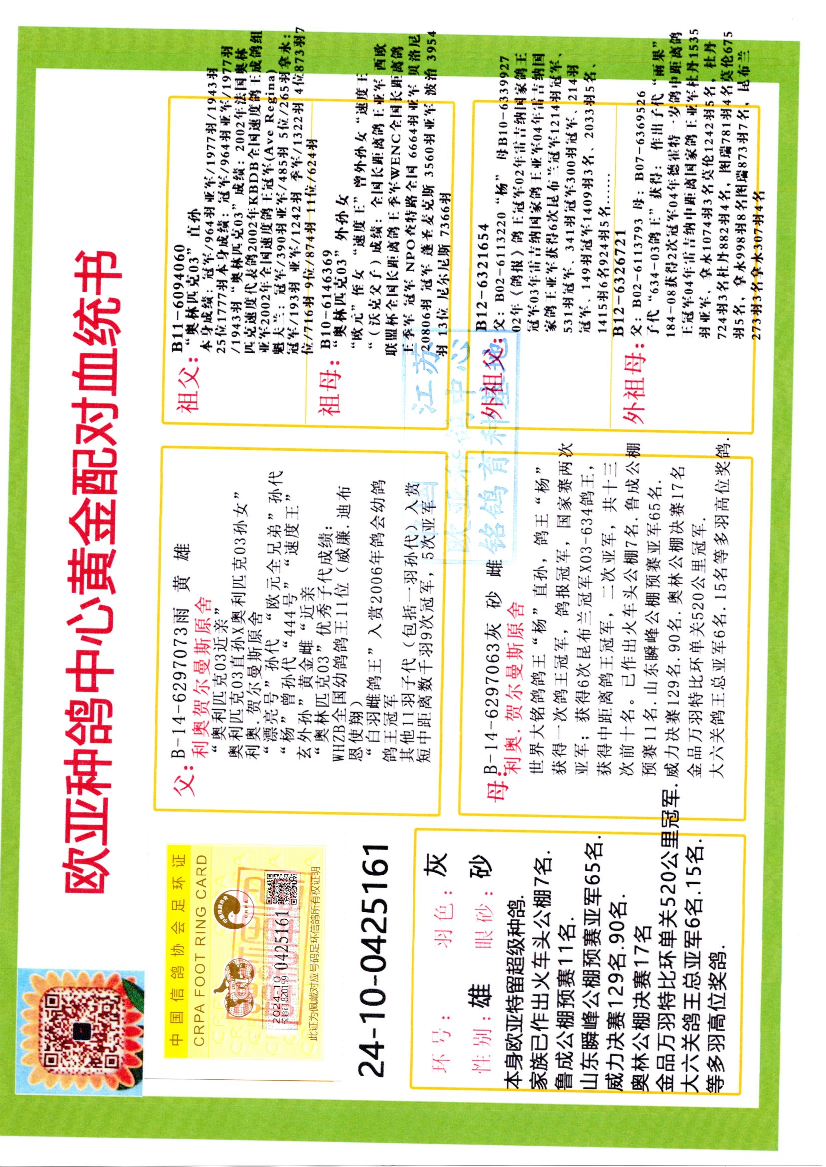 24年秋南京特比環(huán)歐亞榮獲大團體冠軍.小團體冠軍551公里大特比13名.14名.16名.19名.20名.21名.24名.26名.27名.28名.42名.52名.54名.57名.65名.66名.68名.70名.71名.72名.74名.76名.80名.82名.83名.84名.85名.86名.90名.92名.110名.116名.121名.122名.128名.131名.158名.161名.164名.165名.166名.172名.174名.177名.182名.195名.196名.201名.205名.208名.210名.216名.253名.269名.275名.276名.294名.296名.299名,,24年秋云南天南銅都公棚決賽415名.天南銅都小棚決賽409名.云南玉活公棚決賽102名.490名.團體32名上籠二羽進二羽,天南銅都大棚506公里決賽445名。熱烈祝賀河北省巨鹿縣李蘭生老師用歐亞泰山號血系連續(xù)十一年奪冠軍,河北省國家賽冠軍.全國季軍等多次前十名高位,揚州王軍王總用歐亞利奧24年春季獲山東翔宇公棚決賽33名蓋比53名。南京劉正龍劉總用歐亞蓋比獲得24年秋山東濰坊國際公棚決賽42名.精英賽30名.三關鴿王71名.決賽86名.加站賽16名.南京市特比環(huán)A組鴿王9名.B組鴿王5名.6名.C組鴿王5名.精英賽冠軍4名.技能賽A組冠軍4名.5名.秦淮區(qū)特比環(huán)榮獲15名.46名.48名.87名。四川西昌徐亮徐總用歐亞利奧獲得涼山州聚友決賽177名.第二關亞軍雙關鴿王19名.三關鴿王105名.云南豪庭公棚決賽603名。熱烈祝賀24年四川重慶翔園鴿舍用歐亞泰山號榮獲春季400公里冠軍.秋季500公里冠軍,河北王總用詹森X利奧獲得千羽千翔公棚400公里冠軍,廣東蔡楷煥榮獲24年秋愛好者 賽鴿俱樂部三關鴿王季軍.一關420公里99名.二關450公里11名.三關520公里32名.單關季軍.7名.12名,江西李衛(wèi)興榮獲貴州紅楓公棚8名.共翔俱樂部寄養(yǎng)棚四關綜合鴿王30名.一關400公里78名.二關500公里55名.三關520公里37名.四關500公里57名.同父母獲公棚18名.雷鳴獲得武漢黃浦育翔中心冠軍,四川陳文獲得四川明鴻俱樂部300公里夢幻2名.3名.4名.9名.10名.13名.14名.15名.31名.34名.40名.41名.42名.43名.69名.71名.72名.73名.74名.94名.95名.97名.98名.99名.419公里決賽榮獲總冠軍7名.總共歸巢9羽,四川徐亮獲豪庭決賽603名,山西鄭勇獲得山西泰鑫公棚決賽255名詹森紅狐,熱烈祝賀馬總獲得開爾(飛躍隊)決賽9名獲獎金1310000萬元.第一關52名,天津津福資賽180公里96名.獲獎金429543萬元,歐亞支持全國鴿友24年秋多人報喜 祝大家取得更好成績,給歐亞報喜鴿友歐亞決定給每人贈送一羽超級種鴿。歐亞俱樂部特比環(huán)多關鴿王成績:15年秋淮安特比環(huán)黑色星期一全會上籠9700多羽,當天無鴿歸巢,第二天全會歸巢357羽,本舍歸巢158羽.前十名八羽.前一百名歸巢57羽,16年春季獲五關鴿王總冠軍,總亞軍四名.六名.七名.九名.十名.晶藝俱樂部520公里冠亞季軍5名.6名.7名.9名.11名等,火車頭冠軍.季軍6名.8名.9名.10名,16年秋晶藝俱樂部特比環(huán)520公里亞軍.季軍4名.6名.7名.9名,15年春南京白下特比環(huán)冠軍.亞軍.季軍6名.7名.8名.9名.10名.指定鴿A B組獲得冠軍.亞軍.季軍4名.5名.,17年淮安特比環(huán)亞軍.4名.5名.7名.8名.10名.六關鴿王總冠軍.4名.6名.9名.10名,寄養(yǎng)棚宿遷劉總20羽特比環(huán)獲冠軍.季軍.4名.7名.8名.9名等。18年榮獲萬羽特比環(huán)六關鴿王總冠軍.總亞軍.總季軍.6名.8名.十名.單關四羽冠軍.二羽亞軍.四羽季軍.前十名27羽。19年秋萬羽特比環(huán)六關鴿王總亞軍.總季軍.5名.8名等,單關二羽冠軍.三羽亞軍.一羽季軍前十名31羽。20年秋淮安市鴿會四關特比環(huán)大賽風雨無阻鴿王亞軍.鴿王六名,金品俱樂部萬羽特比環(huán)六關鴿王總冠軍,總亞軍.四名.五名.六名.七名.八名.十名.前二百名鴿王35羽,單關冠亞季軍前十名四十多羽,火車頭五關鴿王季軍.六名.八名.前二百名鴿王十七羽。20年春榮獲淮安五區(qū)一市四關鴿王總冠軍.亞軍.四名.八名.九名。21年秋榮獲金品萬羽特比環(huán)大賽六關鴿王總亞軍.總季軍.四名.七名.九名.十名.單關冠亞軍季軍前十名三十多羽;疖囶^協(xié)會鴿王六名.七名.十名.單關前十名十七羽。22年秋榮獲鴿王總冠軍.總亞軍.5名.7名.8名.9名.11名.單關冠亞季軍前十名三十多羽,第一關單關前二百名四十多羽,第二關前二百名三十多羽,第三關前二百名四十多羽,第四關前二百名四十多羽,第五關前一百名53羽。23年秋榮獲鴿王季軍.五名.八名.十名.13名.17名.20名.27名等多羽鴿王.單關前十名二十多羽。公棚.寄養(yǎng)棚部分成績:16年秋寧夏黃河公棚總冠軍電腦戈馬力指定通炮冠軍,17年送八羽參賽獲得鴿王八名進獎四名,支持韓總榮獲八名。支持鴿友榮獲寧夏中衛(wèi)公棚決賽總冠軍.精英賽冠軍,支持18年寧夏黃河公棚決賽冠軍詹森X泰山。安徽鼎博寄養(yǎng)棚院內外四關鴿王總冠軍.鴿王十七名.三十七名同窩,鴿王39名.42名.58名.67名。18年山東公棚預賽冠軍.決賽65名.送八羽進獎五羽.指定獲奔馳汽車一輛。支持鴿友獲得云南藍云公棚冠軍.蓋比X佛卡門。支持鴿友榮獲云南銀集公棚決賽冠軍 詹森427X520血系 速度賽6700羽冠軍。17年榮獲金馬俱樂部寄養(yǎng)棚四關鴿王總冠軍.季軍.六名.八名.第一關冠軍.亞軍.季軍四名.七名.十一名.金牌教練獎。支持鴿友18年北京費翔公棚預賽九名電腦X桑杰士,支持鴿友榮獲陜西威力公棚決賽11名.內蒙古臨河寄養(yǎng)棚四關鴿王六名.詹森配泰山,支持河北王總用歐亞詹森427配胡本喜獲20年秋開爾青年棚季軍。云南東榮公棚16年預賽冠軍.決賽77名.17年決賽12名.詹森紅狐X泰山,17年平安公棚決賽4名