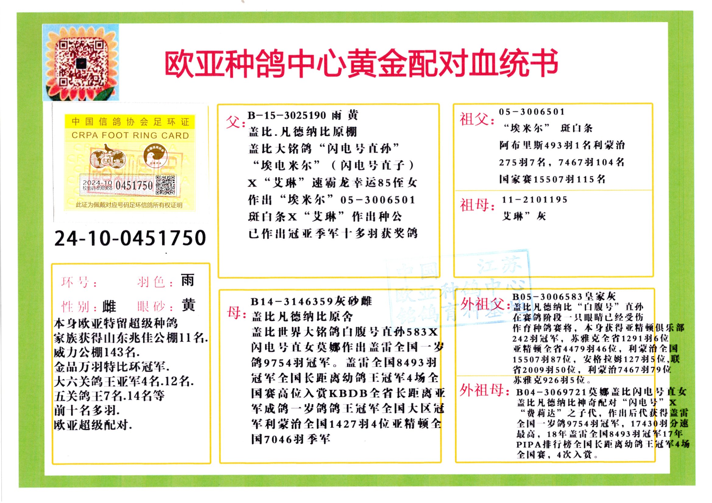 24年秋南京特比環(huán)歐亞榮獲大團(tuán)體冠軍.小團(tuán)體冠軍551公里大特比13名.14名.16名.19名.20名.21名.24名.26名.27名.28名.42名.52名.54名.57名.65名.66名.68名.70名.71名.72名.74名.76名.80名.82名.83名.84名.85名.86名.90名.92名.110名.116名.121名.122名.128名.131名.158名.161名.164名.165名.166名.172名.174名.177名.182名.195名.196名.201名.205名.208名.210名.216名.253名.269名.275名.276名.294名.296名.299名,,24年秋云南天南銅都公棚決賽415名.天南銅都小棚決賽409名.云南玉活公棚決賽102名.490名.團(tuán)體32名上籠二羽進(jìn)二羽,天南銅都大棚506公里決賽445名。熱烈祝賀河北省巨鹿縣李蘭生老師用歐亞泰山號(hào)血系連續(xù)十一年奪冠軍,河北省國(guó)家賽冠軍.全國(guó)季軍等多次前十名高位,揚(yáng)州王軍王總用歐亞利奧24年春季獲山東翔宇公棚決賽33名蓋比53名。南京劉正龍劉總用歐亞蓋比獲得24年秋山東濰坊國(guó)際公棚決賽42名.精英賽30名.三關(guān)鴿王71名.決賽86名.加站賽16名.南京市特比環(huán)A組鴿王9名.B組鴿王5名.6名.C組鴿王5名.精英賽冠軍4名.技能賽A組冠軍4名.5名.秦淮區(qū)特比環(huán)榮獲15名.46名.48名.87名。四川西昌徐亮徐總用歐亞利奧獲得涼山州聚友決賽177名.第二關(guān)亞軍雙關(guān)鴿王19名.三關(guān)鴿王105名.云南豪庭公棚決賽603名。熱烈祝賀24年四川重慶翔園鴿舍用歐亞泰山號(hào)榮獲春季400公里冠軍.秋季500公里冠軍,河北王總用詹森X利奧獲得千羽千翔公棚400公里冠軍,廣東蔡楷煥榮獲24年秋愛(ài)好者 賽鴿俱樂(lè)部三關(guān)鴿王季軍.一關(guān)420公里99名.二關(guān)450公里11名.三關(guān)520公里32名.單關(guān)季軍.7名.12名,江西李衛(wèi)興榮獲貴州紅楓公棚8名.共翔俱樂(lè)部寄養(yǎng)棚四關(guān)綜合鴿王30名.一關(guān)400公里78名.二關(guān)500公里55名.三關(guān)520公里37名.四關(guān)500公里57名.同父母獲公棚18名.雷鳴獲得武漢黃浦育翔中心冠軍,四川陳文獲得四川明鴻俱樂(lè)部300公里夢(mèng)幻2名.3名.4名.9名.10名.13名.14名.15名.31名.34名.40名.41名.42名.43名.69名.71名.72名.73名.74名.94名.95名.97名.98名.99名.419公里決賽榮獲總冠軍7名.總共歸巢9羽,四川徐亮獲豪庭決賽603名,山西鄭勇獲得山西泰鑫公棚決賽255名詹森紅狐,熱烈祝賀馬總獲得開(kāi)爾(飛躍隊(duì))決賽9名獲獎(jiǎng)金1310000萬(wàn)元.第一關(guān)52名,天津津福資賽180公里96名.獲獎(jiǎng)金429543萬(wàn)元,歐亞支持全國(guó)鴿友24年秋多人報(bào)喜 祝大家取得更好成績(jī),給歐亞報(bào)喜鴿友歐亞決定給每人贈(zèng)送一羽超級(jí)種鴿。歐亞俱樂(lè)部特比環(huán)多關(guān)鴿王成績(jī):15年秋淮安特比環(huán)黑色星期一全會(huì)上籠9700多羽,當(dāng)天無(wú)鴿歸巢,第二天全會(huì)歸巢357羽,本舍歸巢158羽.前十名八羽.前一百名歸巢57羽,16年春季獲五關(guān)鴿王總冠軍,總亞軍四名.六名.七名.九名.十名.晶藝俱樂(lè)部520公里冠亞季軍5名.6名.7名.9名.11名等,火車頭冠軍.季軍6名.8名.9名.10名,16年秋晶藝俱樂(lè)部特比環(huán)520公里亞軍.季軍4名.6名.7名.9名,15年春南京白下特比環(huán)冠軍.亞軍.季軍6名.7名.8名.9名.10名.指定鴿A B組獲得冠軍.亞軍.季軍4名.5名.,17年淮安特比環(huán)亞軍.4名.5名.7名.8名.10名.六關(guān)鴿王總冠軍.4名.6名.9名.10名,寄養(yǎng)棚宿遷劉總20羽特比環(huán)獲冠軍.季軍.4名.7名.8名.9名等。18年榮獲萬(wàn)羽特比環(huán)六關(guān)鴿王總冠軍.總亞軍.總季軍.6名.8名.十名.單關(guān)四羽冠軍.二羽亞軍.四羽季軍.前十名27羽。19年秋萬(wàn)羽特比環(huán)六關(guān)鴿王總亞軍.總季軍.5名.8名等,單關(guān)二羽冠軍.三羽亞軍.一羽季軍前十名31羽。20年秋淮安市鴿會(huì)四關(guān)特比環(huán)大賽風(fēng)雨無(wú)阻鴿王亞軍.鴿王六名,金品俱樂(lè)部萬(wàn)羽特比環(huán)六關(guān)鴿王總冠軍,總亞軍.四名.五名.六名.七名.八名.十名.前二百名鴿王35羽,單關(guān)冠亞季軍前十名四十多羽,火車頭五關(guān)鴿王季軍.六名.八名.前二百名鴿王十七羽。20年春榮獲淮安五區(qū)一市四關(guān)鴿王總冠軍.亞軍.四名.八名.九名。21年秋榮獲金品萬(wàn)羽特比環(huán)大賽六關(guān)鴿王總亞軍.總季軍.四名.七名.九名.十名.單關(guān)冠亞軍季軍前十名三十多羽。火車頭協(xié)會(huì)鴿王六名.七名.十名.單關(guān)前十名十七羽。22年秋榮獲鴿王總冠軍.總亞軍.5名.7名.8名.9名.11名.單關(guān)冠亞季軍前十名三十多羽,第一關(guān)單關(guān)前二百名四十多羽,第二關(guān)前二百名三十多羽,第三關(guān)前二百名四十多羽,第四關(guān)前二百名四十多羽,第五關(guān)前一百名53羽。23年秋榮獲鴿王季軍.五名.八名.十名.13名.17名.20名.27名等多羽鴿王.單關(guān)前十名二十多羽。公棚.寄養(yǎng)棚部分成績(jī):16年秋寧夏黃河公棚總冠軍電腦戈馬力指定通炮冠軍,17年送八羽參賽獲得鴿王八名進(jìn)獎(jiǎng)四名,支持韓總榮獲八名。支持鴿友榮獲寧夏中衛(wèi)公棚決賽總冠軍.精英賽冠軍,支持18年寧夏黃河公棚決賽冠軍詹森X泰山。安徽鼎博寄養(yǎng)棚院內(nèi)外四關(guān)鴿王總冠軍.鴿王十七名.三十七名同窩,鴿王39名.42名.58名.67名。18年山東公棚預(yù)賽冠軍.決賽65名.送八羽進(jìn)獎(jiǎng)五羽.指定獲奔馳汽車一輛。支持鴿友獲得云南藍(lán)云公棚冠軍.蓋比X佛卡門。支持鴿友榮獲云南銀集公