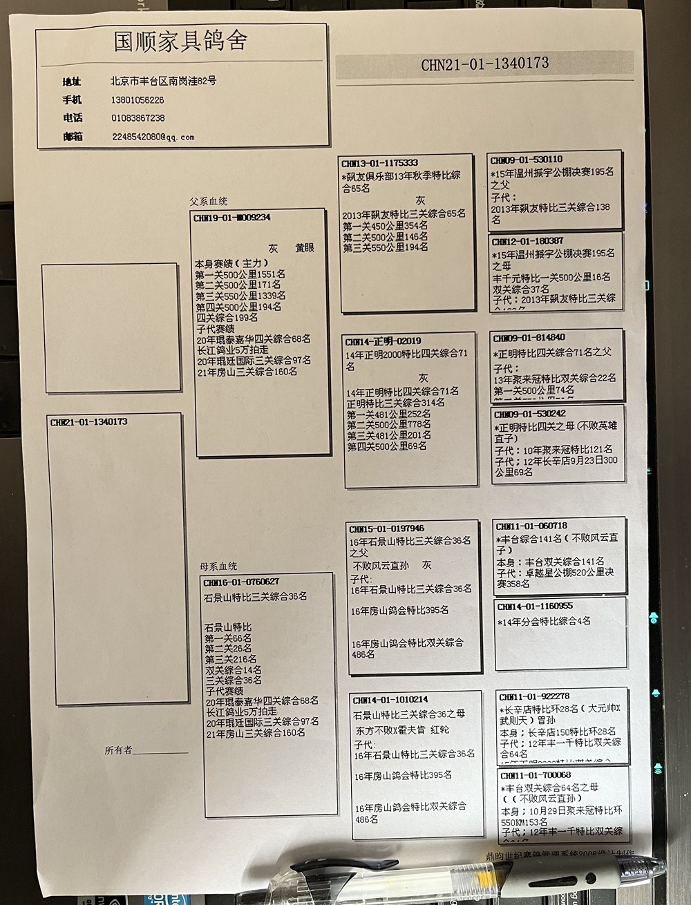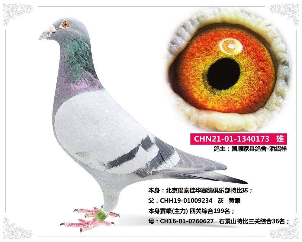 父:CHH19-01009234   灰   黃眼   本身賽績(主力) 第一關500公里1551名;第二關500公里171名;第三關550公里1339名;第四關500公里194名;四關綜合199名;子代賽績:20年琨泰嘉華四關綜合68名;長江鴿業(yè)5萬拍走;20年琨廷國際三關綜合97名;21年房山三關綜合160名