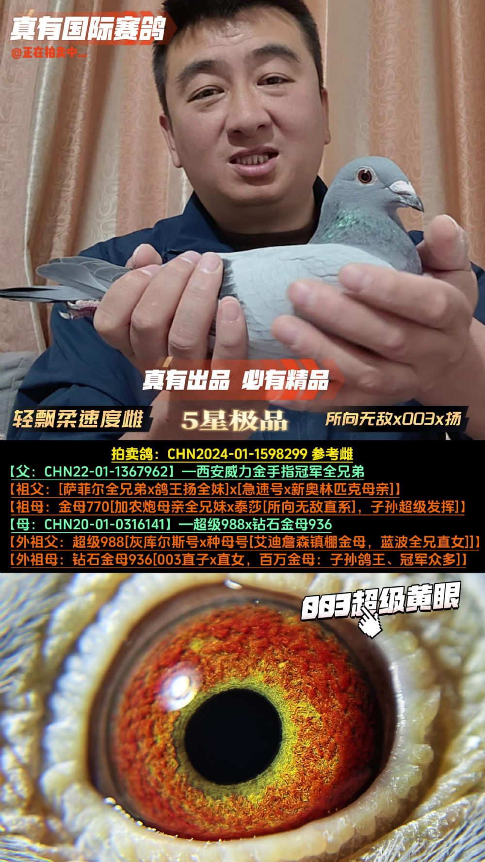 由于所有拍賣鴿均沒有作育記錄,因此無法100%保證雌雄的正確性,拍賣視頻中的雌雄僅供參考,最終以實物為主。如有雌雄特殊要求請及時聯(lián)系真有國際確認,所有拍賣鴿均享受7天免費換鴿服務(運費自理),由于拍賣形式的鴿子具備商品的唯一性,因此不支持退款服務,感謝大家的理解與支持!謝謝!