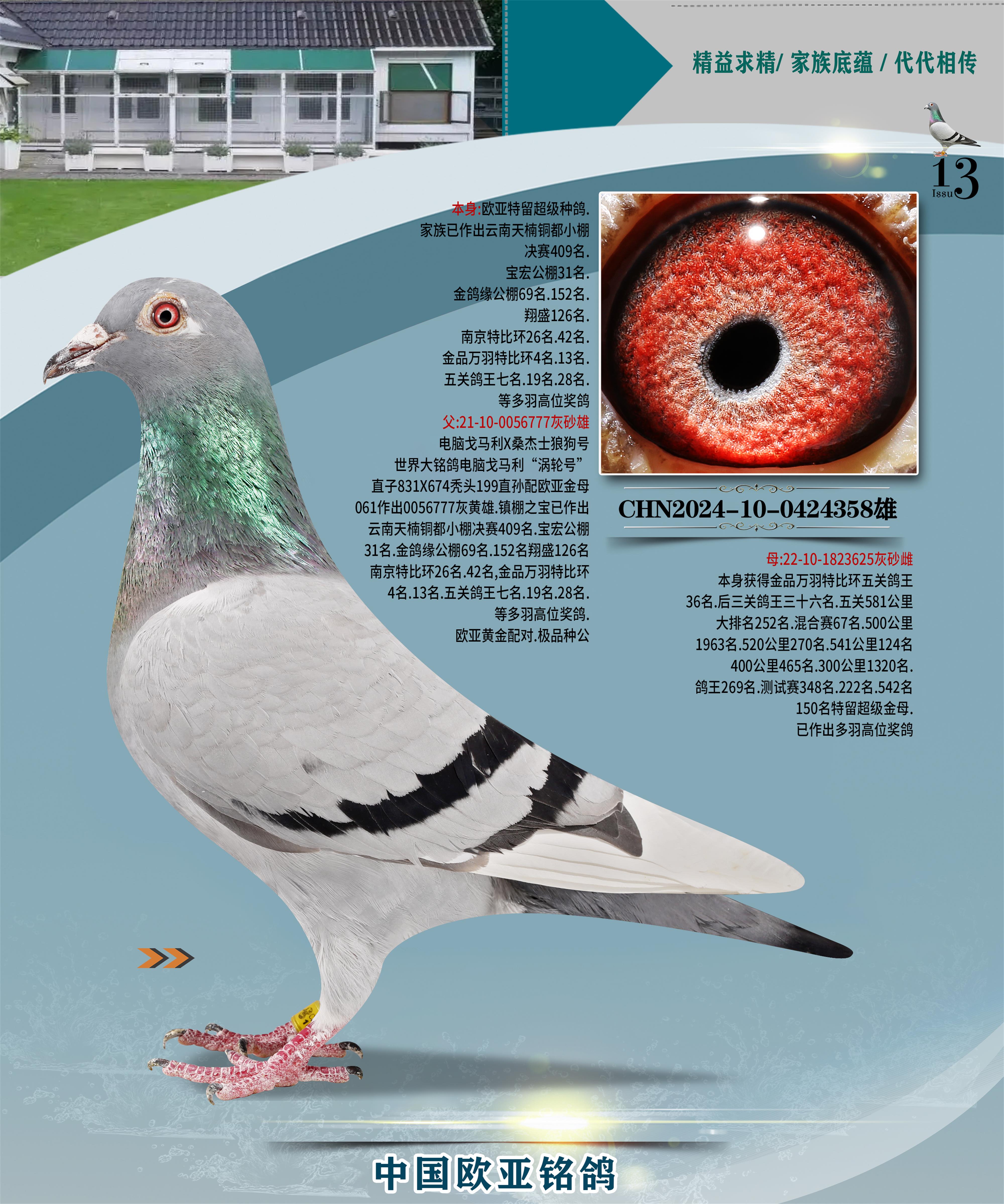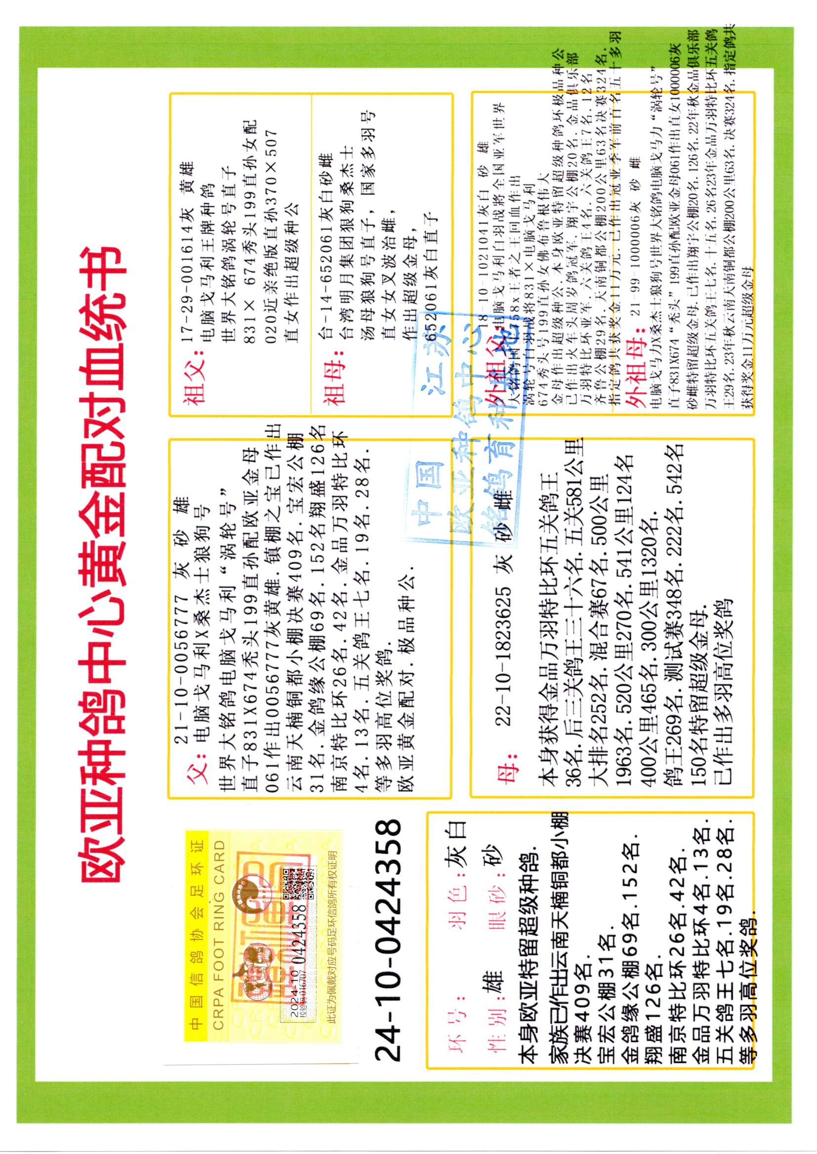24年秋南京特比環(huán)歐亞榮獲大團(tuán)體冠軍.小團(tuán)體冠軍551公里大特比13名.14名.16名.19名.20名.21名.24名.26名.27名.28名.42名.52名.54名.57名.65名.66名.68名.70名.71名.72名.74名.76名.80名.82名.83名.84名.85名.86名.90名.92名.110名.116名.121名.122名.128名.131名.158名.161名.164名.165名.166名.172名.174名.177名.182名.195名.196名.201名.205名.208名.210名.216名.253名.269名.275名.276名.294名.296名.299名,,24年秋云南天南銅都公棚決賽415名.天南銅都小棚決賽409名.云南玉活公棚決賽102名.490名.團(tuán)體32名上籠二羽進(jìn)二羽,天南銅都大棚506公里決賽445名。熱烈祝賀河北省巨鹿縣李蘭生老師用歐亞泰山號血系連續(xù)十一年奪冠軍,河北省國家賽冠軍.全國季軍等多次前十名高位,揚(yáng)州王軍王總用歐亞利奧24年春季獲山東翔宇公棚決賽33名蓋比53名。南京劉正龍劉總用歐亞蓋比獲得24年秋山東濰坊國際公棚決賽42名.精英賽30名.三關(guān)鴿王71名.決賽86名.加站賽16名.南京市特比環(huán)A組鴿王9名.B組鴿王5名.6名.C組鴿王5名.精英賽冠軍4名.技能賽A組冠軍4名.5名.秦淮區(qū)特比環(huán)榮獲15名.46名.48名.87名。四川西昌徐亮徐總用歐亞利奧獲得涼山州聚友決賽177名.第二關(guān)亞軍雙關(guān)鴿王19名.三關(guān)鴿王105名.云南豪庭公棚決賽603名。熱烈祝賀24年四川重慶翔園鴿舍用歐亞泰山號榮獲春季400公里冠軍.秋季500公里冠軍,河北王總用詹森X利奧獲得千羽千翔公棚400公里冠軍,廣東蔡楷煥榮獲24年秋愛好者 賽鴿俱樂部三關(guān)鴿王季軍.一關(guān)420公里99名.二關(guān)450公里11名.三關(guān)520公里32名.單關(guān)季軍.7名.12名,江西李衛(wèi)興榮獲貴州紅楓公棚8名.共翔俱樂部寄養(yǎng)棚四關(guān)綜合鴿王30名.一關(guān)400公里78名.二關(guān)500公里55名.三關(guān)520公里37名.四關(guān)500公里57名.同父母獲公棚18名.雷鳴獲得武漢黃浦育翔中心冠軍,四川陳文獲得四川明鴻俱樂部300公里夢幻2名.3名.4名.9名.10名.13名.14名.15名.31名.34名.40名.41名.42名.43名.69名.71名.72名.73名.74名.94名.95名.97名.98名.99名.419公里決賽榮獲總冠軍7名.總共歸巢9羽,四川徐亮獲豪庭決賽603名,山西鄭勇獲得山西泰鑫公棚決賽255名詹森紅狐,熱烈祝賀馬總獲得開爾(飛躍隊(duì))決賽9名獲獎(jiǎng)金1310000萬元.第一關(guān)52名,天津津福資賽180公里96名.獲獎(jiǎng)金429543萬元,歐亞支持全國鴿友24年秋多人報(bào)喜 祝大家取得更好成績,給歐亞報(bào)喜鴿友歐亞決定給每人贈(zèng)送一羽超級種鴿。歐亞俱樂部特比環(huán)多關(guān)鴿王成績:15年秋淮安特比環(huán)黑色星期一全會上籠9700多羽,當(dāng)天無鴿歸巢,第二天全會歸巢357羽,本舍歸巢158羽.前十名八羽.前一百名歸巢57羽,16年春季獲五關(guān)鴿王總冠軍,總亞軍四名.六名.七名.九名.十名.晶藝俱樂部520公里冠亞季軍5名.6名.7名.9名.11名等,火車頭冠軍.季軍6名.8名.9名.10名,16年秋晶藝俱樂部特比環(huán)520公里亞軍.季軍4名.6名.7名.9名,15年春南京白下特比環(huán)冠軍.亞軍.季軍6名.7名.8名.9名.10名.指定鴿A B組獲得冠軍.亞軍.季軍4名.5名.,17年淮安特比環(huán)亞軍.4名.5名.7名.8名.10名.六關(guān)鴿王總冠軍.4名.6名.9名.10名,寄養(yǎng)棚宿遷劉總20羽特比環(huán)獲冠軍.季軍.4名.7名.8名.9名等。18年榮獲萬羽特比環(huán)六關(guān)鴿王總冠軍.總亞軍.總季軍.6名.8名.十名.單關(guān)四羽冠軍.二羽亞軍.四羽季軍.前十名27羽。19年秋萬羽特比環(huán)六關(guān)鴿王總亞軍.總季軍.5名.8名等,單關(guān)二羽冠軍.三羽亞軍.一羽季軍前十名31羽。20年秋淮安市鴿會四關(guān)特比環(huán)大賽風(fēng)雨無阻鴿王亞軍.鴿王六名,金品俱樂部萬羽特比環(huán)六關(guān)鴿王總冠軍,總亞軍.四名.五名.六名.七名.八名.十名.前二百名鴿王35羽,單關(guān)冠亞季軍前十名四十多羽,火車頭五關(guān)鴿王季軍.六名.八名.前二百名鴿王十七羽。20年春榮獲淮安五區(qū)一市四關(guān)鴿王總冠軍.亞軍.四名.八名.九名。21年秋榮獲金品萬羽特比環(huán)大賽六關(guān)鴿王總亞軍.總季軍.四名.七名.九名.十名.單關(guān)冠亞軍季軍前十名三十多羽;疖囶^協(xié)會鴿王六名.七名.十名.單關(guān)前十名十七羽。22年秋榮獲鴿王總冠軍.總亞軍.5名.7名.8名.9名.11名.單關(guān)冠亞季軍前十名三十多羽,第一關(guān)單關(guān)前二百名四十多羽,第二關(guān)前二百名三十多羽,第三關(guān)前二百名四十多羽,第四關(guān)前二百名四十多羽,第五關(guān)前一百名53羽。23年秋榮獲鴿王季軍.五名.八名.十名.13名.17名.20名.27名等多羽鴿王.單關(guān)前十名二十多羽。公棚.寄養(yǎng)棚部分成績:16年秋寧夏黃河公棚總冠軍電腦戈馬力指定通炮冠軍,17年送八羽參賽獲得鴿王八名進(jìn)獎(jiǎng)四名,支持韓總榮獲八名。支持鴿友榮獲寧夏中衛(wèi)公棚決賽總冠軍.精英賽冠軍,支持18年寧夏黃河公棚決賽冠軍詹森X泰山。安徽鼎博寄養(yǎng)棚院內(nèi)外四關(guān)鴿王總冠軍.鴿王十七名.三十七名同窩,鴿王39名.42名.58名.67名。18年山東公棚預(yù)賽冠軍.決賽65名.送八羽進(jìn)獎(jiǎng)五羽.指定獲奔馳汽車一輛。支持鴿友獲得云南藍(lán)云公棚冠軍.蓋比X佛卡門。支持鴿友榮獲云南銀集公棚決賽冠軍 詹森427X520血系 速度賽6700羽冠軍。17年榮獲金馬俱樂部寄養(yǎng)棚四關(guān)鴿王總冠軍.季軍.六名.八名.第一關(guān)冠軍.亞軍.