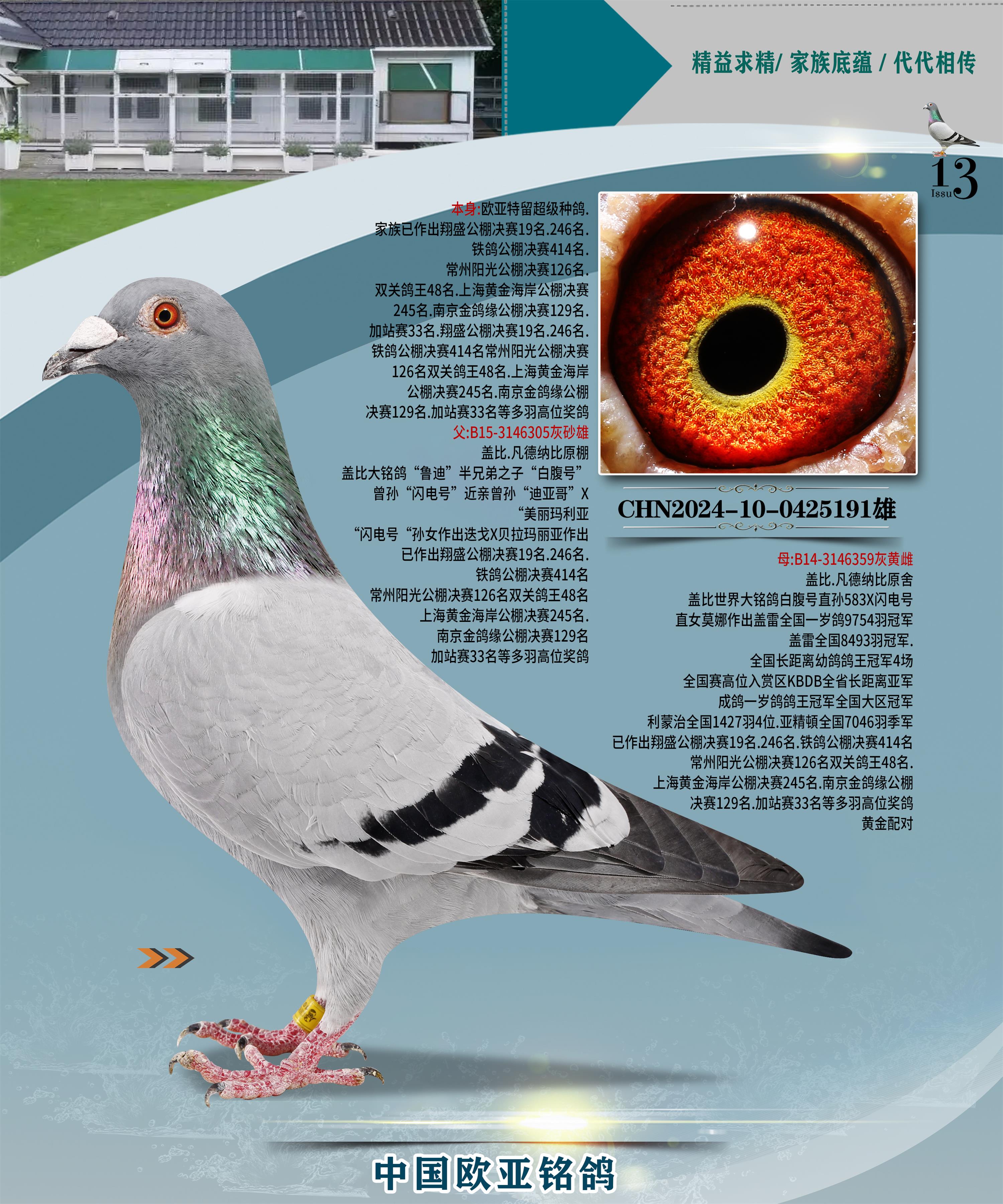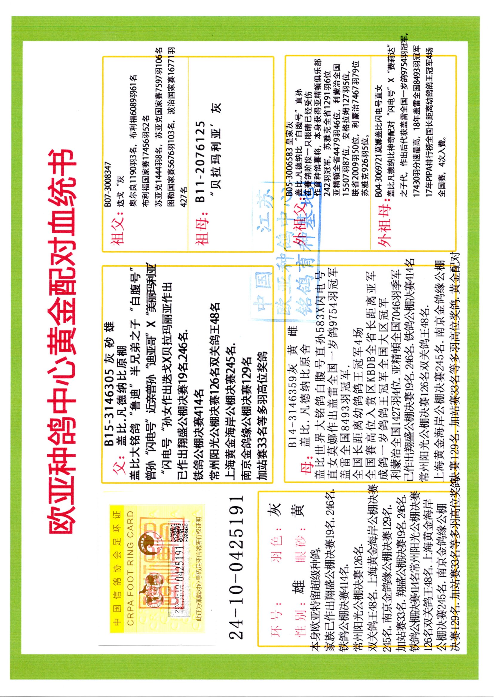 24年秋南京特比環(huán)歐亞榮獲大團(tuán)體冠軍.小團(tuán)體冠軍551公里大特比13名.14名.16名.19名.20名.21名.24名.26名.27名.28名.42名.52名.54名.57名.65名.66名.68名.70名.71名.72名.74名.76名.80名.82名.83名.84名.85名.86名.90名.92名.110名.116名.121名.122名.128名.131名.158名.161名.164名.165名.166名.172名.174名.177名.182名.195名.196名.201名.205名.208名.210名.216名.253名.269名.275名.276名.294名.296名.299名,,24年秋云南天南銅都公棚決賽415名.天南銅都小棚決賽409名.云南玉活公棚決賽102名.490名.團(tuán)體32名上籠二羽進(jìn)二羽,天南銅都大棚506公里決賽445名。熱烈祝賀河北省巨鹿縣李蘭生老師用歐亞泰山號(hào)血系連續(xù)十一年奪冠軍,河北省國家賽冠軍.全國季軍等多次前十名高位,揚(yáng)州王軍王總用歐亞利奧24年春季獲山東翔宇公棚決賽33名蓋比53名。南京劉正龍劉總用歐亞蓋比獲得24年秋山東濰坊國際公棚決賽42名.精英賽30名.三關(guān)鴿王71名.決賽86名.加站賽16名.南京市特比環(huán)A組鴿王9名.B組鴿王5名.6名.C組鴿王5名.精英賽冠軍4名.技能賽A組冠軍4名.5名.秦淮區(qū)特比環(huán)榮獲15名.46名.48名.87名。四川西昌徐亮徐總用歐亞利奧獲得涼山州聚友決賽177名.第二關(guān)亞軍雙關(guān)鴿王19名.三關(guān)鴿王105名.云南豪庭公棚決賽603名。熱烈祝賀24年四川重慶翔園鴿舍用歐亞泰山號(hào)榮獲春季400公里冠軍.秋季500公里冠軍,河北王總用詹森X利奧獲得千羽千翔公棚400公里冠軍,廣東蔡楷煥榮獲24年秋愛好者 賽鴿俱樂部三關(guān)鴿王季軍.一關(guān)420公里99名.二關(guān)450公里11名.三關(guān)520公里32名.單關(guān)季軍.7名.12名,江西李衛(wèi)興榮獲貴州紅楓公棚8名.共翔俱樂部寄養(yǎng)棚四關(guān)綜合鴿王30名.一關(guān)400公里78名.二關(guān)500公里55名.三關(guān)520公里37名.四關(guān)500公里57名.同父母獲公棚18名.雷鳴獲得武漢黃浦育翔中心冠軍,四川陳文獲得四川明鴻俱樂部300公里夢幻2名.3名.4名.9名.10名.13名.14名.15名.31名.34名.40名.41名.42名.43名.69名.71名.72名.73名.74名.94名.95名.97名.98名.99名.419公里決賽榮獲總冠軍7名.總共歸巢9羽,四川徐亮獲豪庭決賽603名,山西鄭勇獲得山西泰鑫公棚決賽255名詹森紅狐,熱烈祝賀馬總獲得開爾(飛躍隊(duì))決賽9名獲獎(jiǎng)金1310000萬元.第一關(guān)52名,天津津福資賽180公里96名.獲獎(jiǎng)金429543萬元,歐亞支持全國鴿友24年秋多人報(bào)喜 祝大家取得更好成績,給歐亞報(bào)喜鴿友歐亞決定給每人贈(zèng)送一羽超級(jí)種鴿。歐亞俱樂部特比環(huán)多關(guān)鴿王成績:15年秋淮安特比環(huán)黑色星期一全會(huì)上籠9700多羽,當(dāng)天無鴿歸巢,第二天全會(huì)歸巢357羽,本舍歸巢158羽.前十名八羽.前一百名歸巢57羽,16年春季獲五關(guān)鴿王總冠軍,總亞軍四名.六名.七名.九名.十名.晶藝俱樂部520公里冠亞季軍5名.6名.7名.9名.11名等,火車頭冠軍.季軍6名.8名.9名.10名,16年秋晶藝俱樂部特比環(huán)520公里亞軍.季軍4名.6名.7名.9名,15年春南京白下特比環(huán)冠軍.亞軍.季軍6名.7名.8名.9名.10名.指定鴿A B組獲得冠軍.亞軍.季軍4名.5名.,17年淮安特比環(huán)亞軍.4名.5名.7名.8名.10名.六關(guān)鴿王總冠軍.4名.6名.9名.10名,寄養(yǎng)棚宿遷劉總20羽特比環(huán)獲冠軍.季軍.4名.7名.8名.9名等。18年榮獲萬羽特比環(huán)六關(guān)鴿王總冠軍.總亞軍.總季軍.6名.8名.十名.單關(guān)四羽冠軍.二羽亞軍.四羽季軍.前十名27羽。19年秋萬羽特比環(huán)六關(guān)鴿王總亞軍.總季軍.5名.8名等,單關(guān)二羽冠軍.三羽亞軍.一羽季軍前十名31羽。20年秋淮安市鴿會(huì)四關(guān)特比環(huán)大賽風(fēng)雨無阻鴿王亞軍.鴿王六名,金品俱樂部萬羽特比環(huán)六關(guān)鴿王總冠軍,總亞軍.四名.五名.六名.七名.八名.十名.前二百名鴿王35羽,單關(guān)冠亞季軍前十名四十多羽,火車頭五關(guān)鴿王季軍.六名.八名.前二百名鴿王十七羽。20年春榮獲淮安五區(qū)一市四關(guān)鴿王總冠軍.亞軍.四名.八名.九名。21年秋榮獲金品萬羽特比環(huán)大賽六關(guān)鴿王總亞軍.總季軍.四名.七名.九名.十名.單關(guān)冠亞軍季軍前十名三十多羽;疖囶^協(xié)會(huì)鴿王六名.七名.十名.單關(guān)前十名十七羽。22年秋榮獲鴿王總冠軍.總亞軍.5名.7名.8名.9名.11名.單關(guān)冠亞季軍前十名三十多羽,第一關(guān)單關(guān)前二百名四十多羽,第二關(guān)前二百名三十多羽,第三關(guān)前二百名四十多羽,第四關(guān)前二百名四十多羽,第五關(guān)前一百名53羽。23年秋榮獲鴿王季軍.五名.八名.十名.13名.17名.20名.27名等多羽鴿王.單關(guān)前十名二十多羽。公棚.寄養(yǎng)棚部分成績:16年秋寧夏黃河公棚總冠軍電腦戈馬力指定通炮冠軍,17年送八羽參賽獲得鴿王八名進(jìn)獎(jiǎng)四名,支持韓總榮獲八名。支持鴿友榮獲寧夏中衛(wèi)公棚決賽總冠軍.精英賽冠軍,支持18年寧夏黃河公棚決賽冠軍詹森X泰山。安徽鼎博寄養(yǎng)棚院內(nèi)外四關(guān)鴿王總冠軍.鴿王十七名.三十七名同窩,鴿王39名.42名.58名.67名。18年山東公棚預(yù)賽冠軍.決賽65名.送八羽進(jìn)獎(jiǎng)五羽.指定獲奔馳汽車一輛。支持鴿友獲得云南藍(lán)云公棚冠軍.蓋比X佛卡門。支持鴿友榮獲云南銀集公棚決賽冠軍 詹森427X520血系 速度賽6700羽冠軍。17年榮獲金馬俱樂部寄養(yǎng)棚四關(guān)鴿王總冠軍.季軍.六