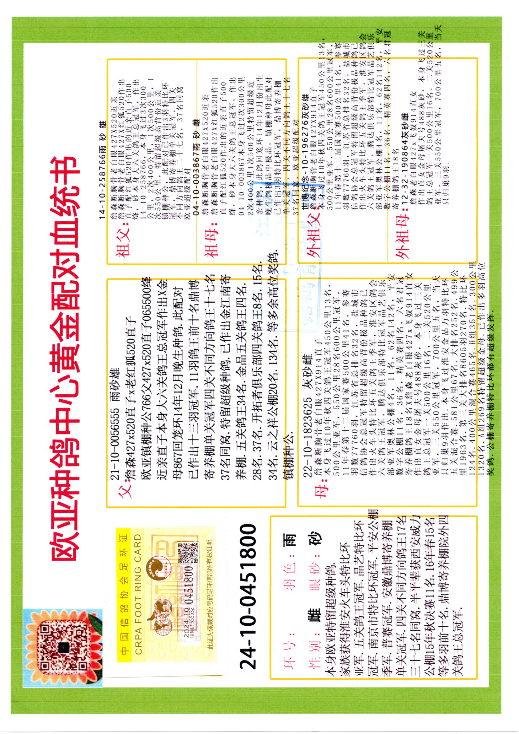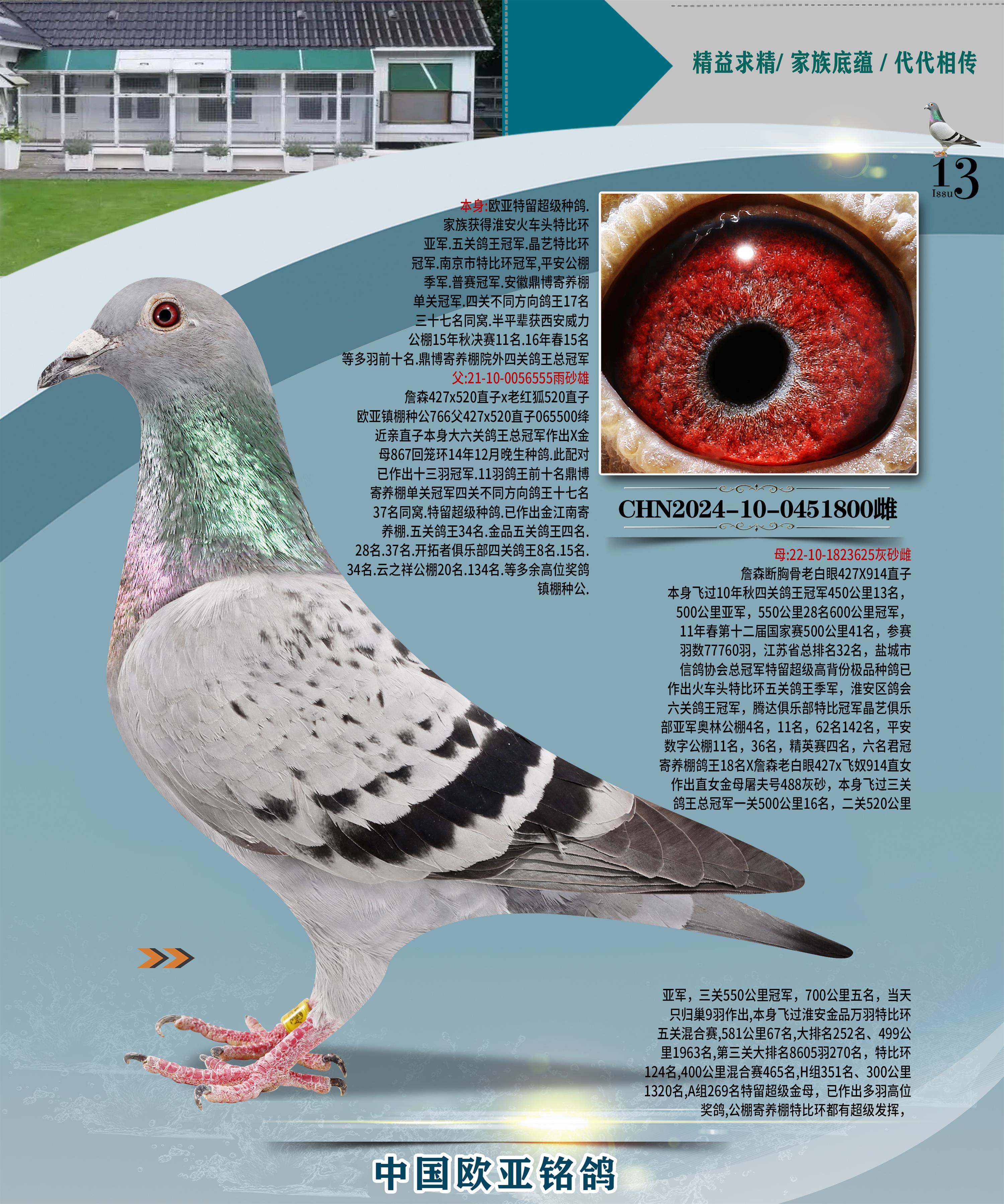 24年秋南京特比環(huán)歐亞榮獲大團體冠軍.小團體冠軍551公里大特比13名.14名.16名.19名.20名.21名.24名.26名.27名.28名.42名.52名.54名.57名.65名.66名.68名.70名.71名.72名.74名.76名.80名.82名.83名.84名.85名.86名.90名.92名.110名.116名.121名.122名.128名.131名.158名.161名.164名.165名.166名.172名.174名.177名.182名.195名.196名.201名.205名.208名.210名.216名.253名.269名.275名.276名.294名.296名.299名,,24年秋云南天南銅都公棚決賽415名.天南銅都小棚決賽409名.云南玉活公棚決賽102名.490名.團體32名上籠二羽進二羽,天南銅都大棚506公里決賽445名。熱烈祝賀河北省巨鹿縣李蘭生老師用歐亞泰山號血系連續(xù)十一年奪冠軍,河北省國家賽冠軍.全國季軍等多次前十名高位,揚州王軍王總用歐亞利奧24年春季獲山東翔宇公棚決賽33名蓋比53名。南京劉正龍劉總用歐亞蓋比獲得24年秋山東濰坊國際公棚決賽42名.精英賽30名.三關(guān)鴿王71名.決賽86名.加站賽16名.南京市特比環(huán)A組鴿王9名.B組鴿王5名.6名.C組鴿王5名.精英賽冠軍4名.技能賽A組冠軍4名.5名.秦淮區(qū)特比環(huán)榮獲15名.46名.48名.87名。四川西昌徐亮徐總用歐亞利奧獲得涼山州聚友決賽177名.第二關(guān)亞軍雙關(guān)鴿王19名.三關(guān)鴿王105名.云南豪庭公棚決賽603名。熱烈祝賀24年四川重慶翔園鴿舍用歐亞泰山號榮獲春季400公里冠軍.秋季500公里冠軍,河北王總用詹森X利奧獲得千羽千翔公棚400公里冠軍,廣東蔡楷煥榮獲24年秋愛好者 賽鴿俱樂部三關(guān)鴿王季軍.一關(guān)420公里99名.二關(guān)450公里11名.三關(guān)520公里32名.單關(guān)季軍.7名.12名,江西李衛(wèi)興榮獲貴州紅楓公棚8名.共翔俱樂部寄養(yǎng)棚四關(guān)綜合鴿王30名.一關(guān)400公里78名.二關(guān)500公里55名.三關(guān)520公里37名.四關(guān)500公里57名.同父母獲公棚18名.雷鳴獲得武漢黃浦育翔中心冠軍,四川陳文獲得四川明鴻俱樂部300公里夢幻2名.3名.4名.9名.10名.13名.14名.15名.31名.34名.40名.41名.42名.43名.69名.71名.72名.73名.74名.94名.95名.97名.98名.99名.419公里決賽榮獲總冠軍7名.總共歸巢9羽,四川徐亮獲豪庭決賽603名,山西鄭勇獲得山西泰鑫公棚決賽255名詹森紅狐,熱烈祝賀馬總獲得開爾(飛躍隊)決賽9名獲獎金1310000萬元.第一關(guān)52名,天津津福資賽180公里96名.獲獎金429543萬元,歐亞支持全國鴿友24年秋多人報喜 祝大家取得更好成績,給歐亞報喜鴿友歐亞決定給每人贈送一羽超級種鴿。歐亞俱樂部特比環(huán)多關(guān)鴿王成績:15年秋淮安特比環(huán)黑色星期一全會上籠9700多羽,當天無鴿歸巢,第二天全會歸巢357羽,本舍歸巢158羽.前十名八羽.前一百名歸巢57羽,16年春季獲五關(guān)鴿王總冠軍,總亞軍四名.六名.七名.九名.十名.晶藝俱樂部520公里冠亞季軍5名.6名.7名.9名.11名等,火車頭冠軍.季軍6名.8名.9名.10名,16年秋晶藝俱樂部特比環(huán)520公里亞軍.季軍4名.6名.7名.9名,15年春南京白下特比環(huán)冠軍.亞軍.季軍6名.7名.8名.9名.10名.指定鴿A B組獲得冠軍.亞軍.季軍4名.5名.,17年淮安特比環(huán)亞軍.4名.5名.7名.8名.10名.六關(guān)鴿王總冠軍.4名.6名.9名.10名,寄養(yǎng)棚宿遷劉總20羽特比環(huán)獲冠軍.季軍.4名.7名.8名.9名等。18年榮獲萬羽特比環(huán)六關(guān)鴿王總冠軍.總亞軍.總季軍.6名.8名.十名.單關(guān)四羽冠軍.二羽亞軍.四羽季軍.前十名27羽。19年秋萬羽特比環(huán)六關(guān)鴿王總亞軍.總季軍.5名.8名等,單關(guān)二羽冠軍.三羽亞軍.一羽季軍前十名31羽。20年秋淮安市鴿會四關(guān)特比環(huán)大賽風雨無阻鴿王亞軍.鴿王六名,金品俱樂部萬羽特比環(huán)六關(guān)鴿王總冠軍,總亞軍.四名.五名.六名.七名.八名.十名.前二百名鴿王35羽,單關(guān)冠亞季軍前十名四十多羽,火車頭五關(guān)鴿王季軍.六名.八名.前二百名鴿王十七羽。20年春榮獲淮安五區(qū)一市四關(guān)鴿王總冠軍.亞軍.四名.八名.九名。21年秋榮獲金品萬羽特比環(huán)大賽六關(guān)鴿王總亞軍.總季軍.四名.七名.九名.十名.單關(guān)冠亞軍季軍前十名三十多羽;疖囶^協(xié)會鴿王六名.七名.十名.單關(guān)前十名十七羽。22年秋榮獲鴿王總冠軍.總亞軍.5名.7名.8名.9名.11名.單關(guān)冠亞季軍前十名三十多羽,第一關(guān)單關(guān)前二百名四十多羽,第二關(guān)前二百名三十多羽,第三關(guān)前二百名四十多羽,第四關(guān)前二百名四十多羽,第五關(guān)前一百名53羽。23年秋榮獲鴿王季軍.五名.八名.十名.13名.17名.20名.27名等多羽鴿王.單關(guān)前十名二十多羽。公棚.寄養(yǎng)棚部分成績:16年秋寧夏黃河公棚總冠軍電腦戈馬力指定通炮冠軍,17年送八羽參賽獲得鴿王八名進獎四名,支持韓總榮獲八名。支持鴿友榮獲寧夏中衛(wèi)公棚決賽總冠軍.精英賽冠軍,支持18年寧夏黃河公棚決賽冠軍詹森X泰山。安徽鼎博寄養(yǎng)棚院內(nèi)外四關(guān)鴿王總冠軍.鴿王十七名.三十七名同窩,鴿王39名.42名.58名.67名。18年山東公棚預(yù)賽冠軍.決賽65名.送八羽進獎五羽.指定獲奔馳汽車一輛。支持鴿友獲得云南藍云公棚冠軍.蓋比X佛卡門。支持鴿友榮獲云南銀集公棚決賽冠軍 詹森427X520血系 速度賽6700羽冠軍。17年榮獲金馬俱樂部寄養(yǎng)棚四關(guān)鴿王總冠軍.季軍.六名.八名.第一關(guān)冠軍.亞軍.季軍四名.七名.十一名.金牌教練獎。支持鴿友18年北京費翔公棚預(yù)賽九名電腦X桑杰士,支持