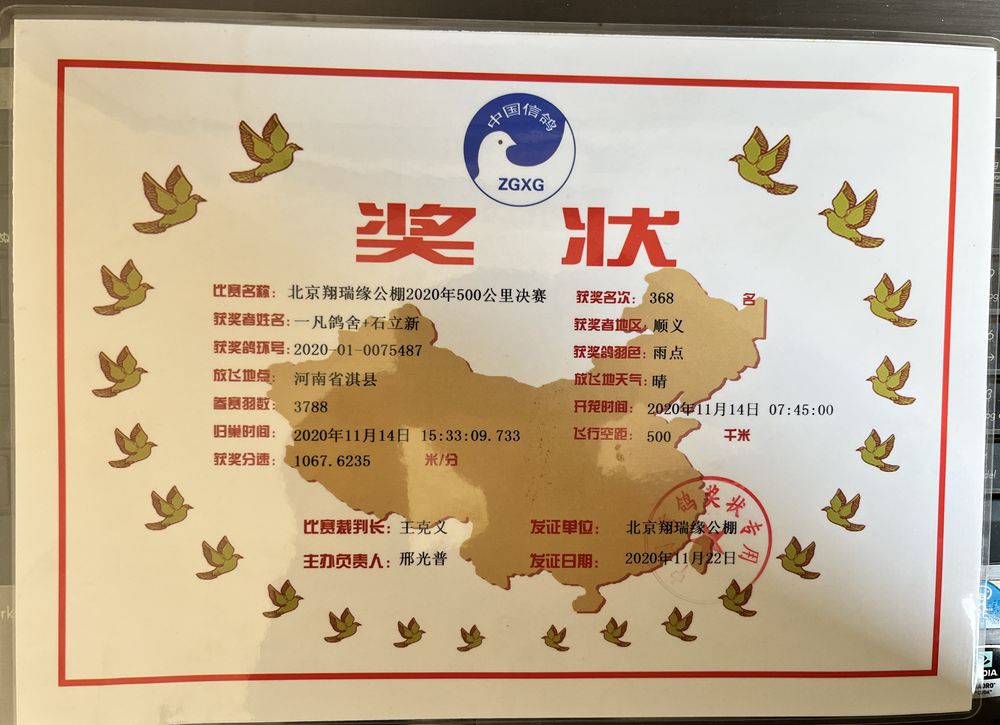 北京翔瑞緣賽鴿公棚500公里決賽368名;