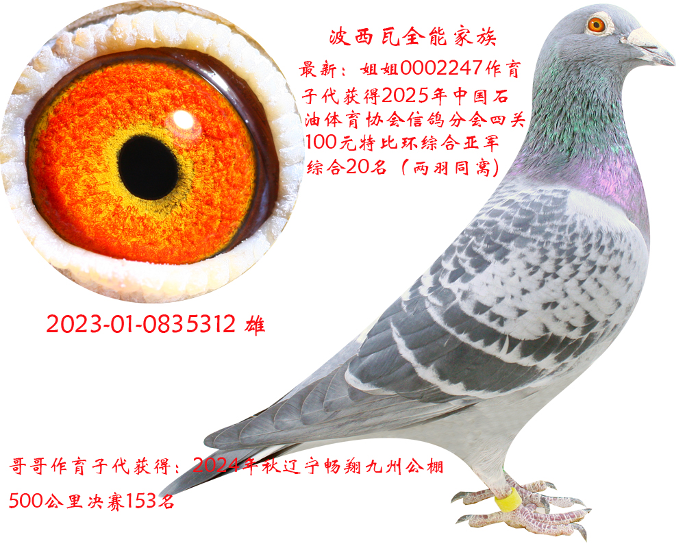 直女2021-33-000247作出子代:獲得2025年中國石油體育協(xié)會信鴿分會四關100元特比環(huán)綜合亞軍,綜合20名(兩羽同窩)