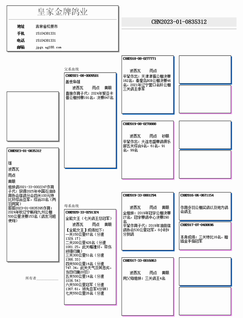 母:CHN2020-33-0291324 全能女王(七關鴿王總冠軍)