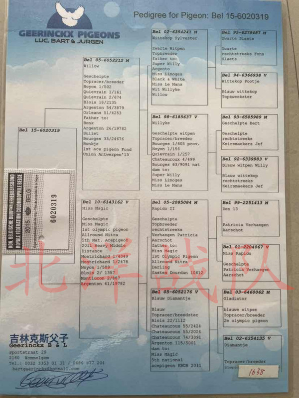 提供血統(tǒng)書、足環(huán)證及父母血統(tǒng)書復(fù)印件 當(dāng)年幼鴿雌雄僅供參考,以實際雌雄為準(zhǔn) 。