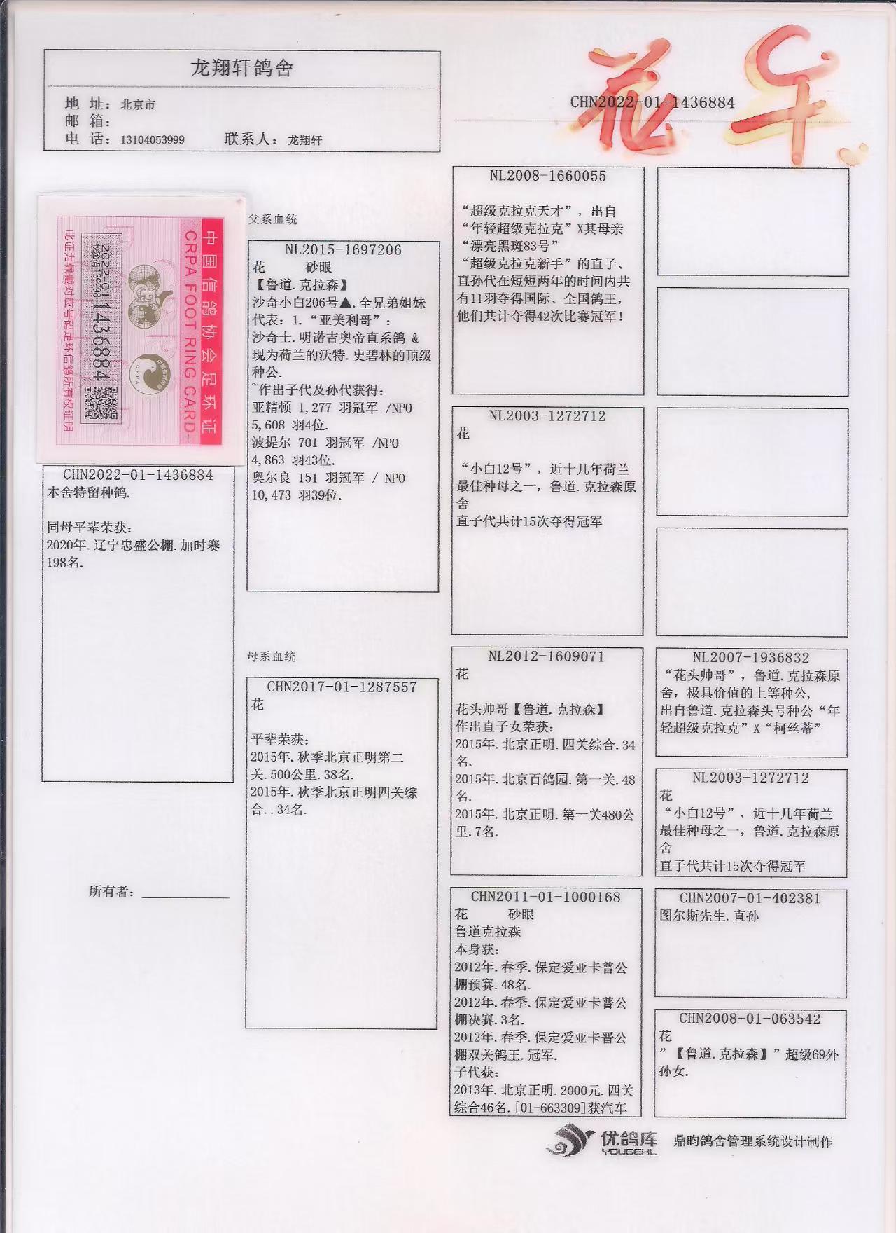 注明:5年以上的老鴿子更換環(huán)境有可能造成不能作育,請(qǐng)你謹(jǐn)慎出價(jià)