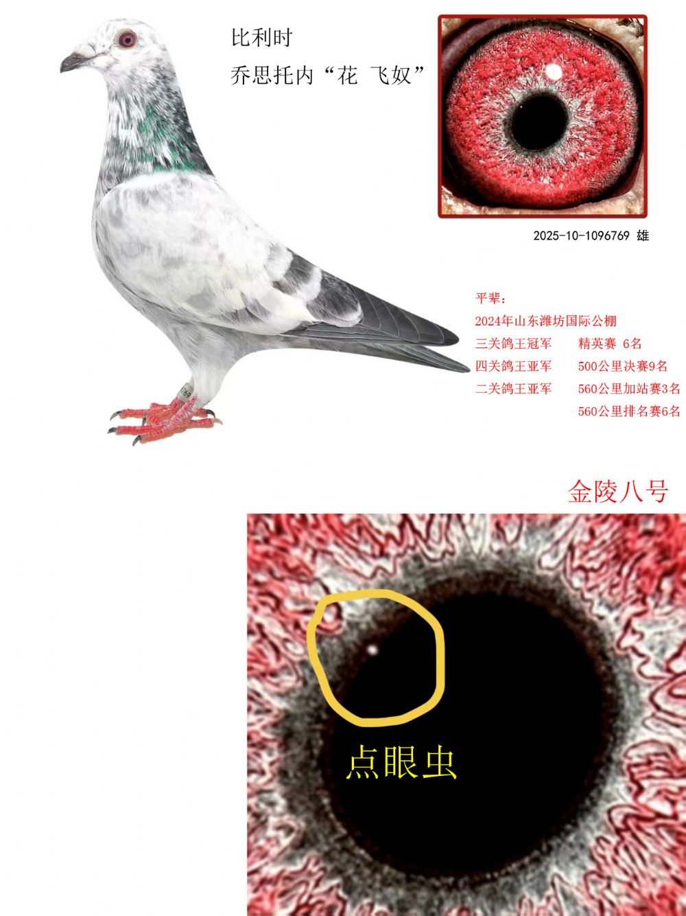 三關(guān)鴿王冠軍,四關(guān)鴿王亞軍,二關(guān)鴿王亞軍,精英賽6名,500公里決賽9名,560公里加站賽3名,560公里排名賽6名(喬 花 飛奴)