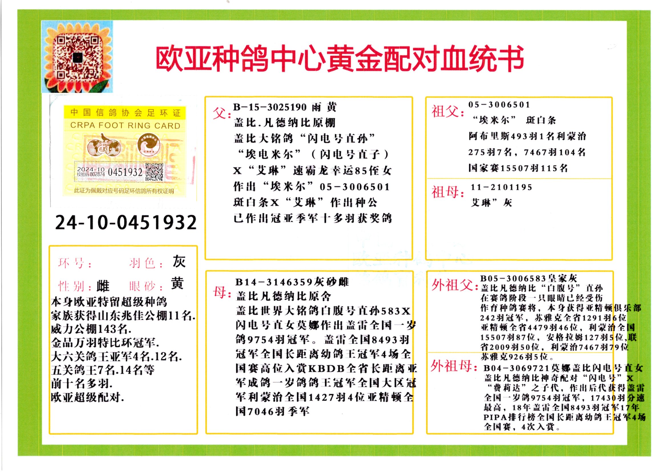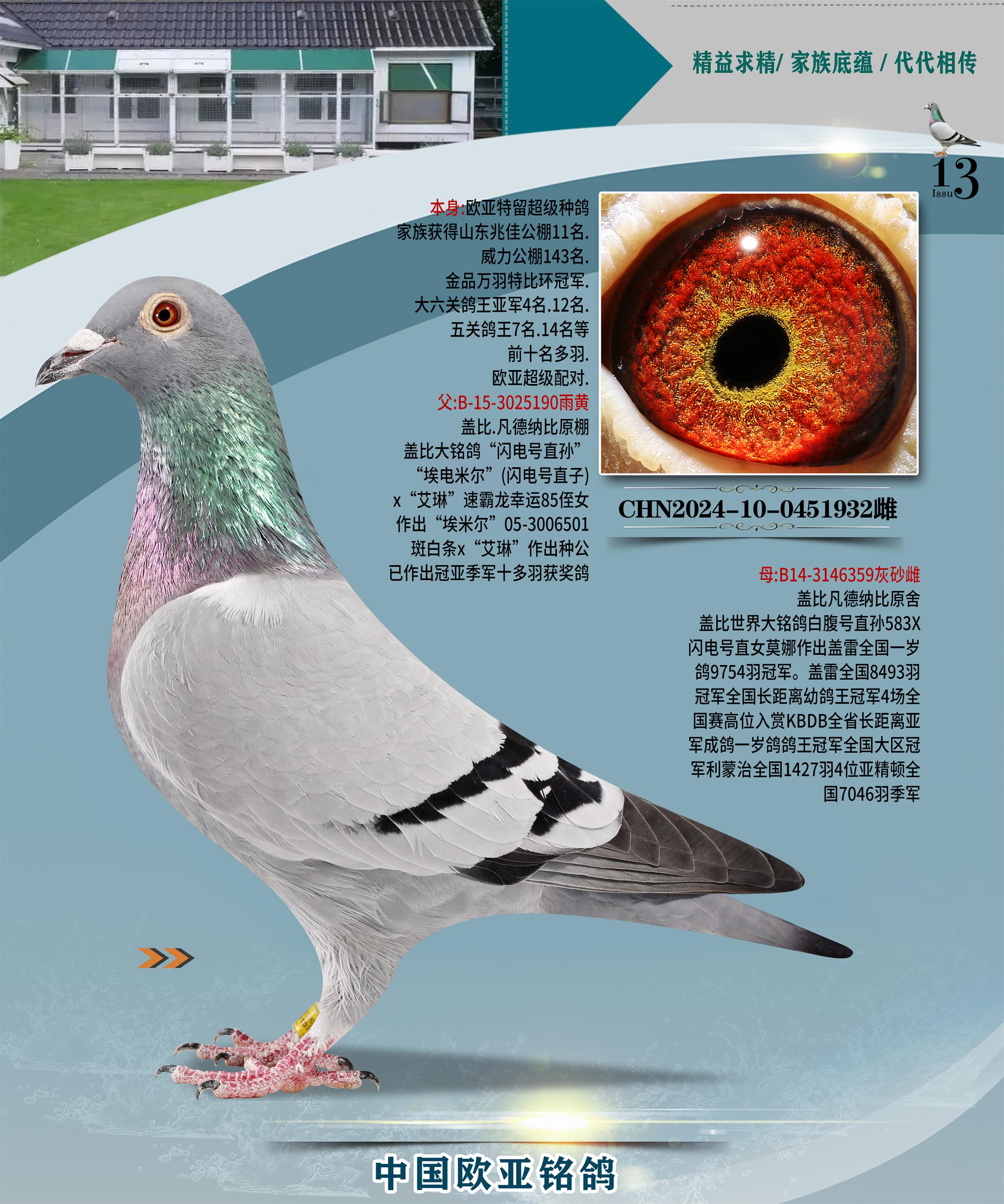 24年秋南京特比環(huán)歐亞榮獲大團體冠軍.小團體冠軍551公里大特比13名.14名.16名.19名.20名.21名.24名.26名.27名.28名.42名.52名.54名.57名.65名.66名.68名.70名.71名.72名.74名.76名.80名.82名.83名.84名.85名.86名.90名.92名.110名.116名.121名.122名.128名.131名.158名.161名.164名.165名.166名.172名.174名.177名.182名.195名.196名.201名.205名.208名.210名.216名.253名.269名.275名.276名.294名.296名.299名,,24年秋云南天南銅都公棚決賽415名.天南銅都小棚決賽409名.云南玉活公棚決賽102名.490名.團體32名上籠二羽進二羽,天南銅都大棚506公里決賽445名。熱烈祝賀河北省巨鹿縣李蘭生老師用歐亞泰山號血系連續(xù)十一年奪冠軍,河北省國家賽冠軍.全國季軍等多次前十名高位,揚州王軍王總用歐亞利奧24年春季獲山東翔宇公棚決賽33名蓋比53名。南京劉正龍劉總用歐亞蓋比獲得24年秋山東濰坊國際公棚決賽42名.精英賽30名.三關鴿王71名.決賽86名.加站賽16名.南京市特比環(huán)A組鴿王9名.B組鴿王5名.6名.C組鴿王5名.精英賽冠軍4名.技能賽A組冠軍4名.5名.秦淮區(qū)特比環(huán)榮獲15名.46名.48名.87名。四川西昌徐亮徐總用歐亞利奧獲得涼山州聚友決賽177名.第二關亞軍雙關鴿王19名.三關鴿王105名.云南豪庭公棚決賽603名。熱烈祝賀24年四川重慶翔園鴿舍用歐亞泰山號榮獲春季400公里冠軍.秋季500公里冠軍,河北王總用詹森X利奧獲得千羽千翔公棚400公里冠軍,廣東蔡楷煥榮獲24年秋愛好者 賽鴿俱樂部三關鴿王季軍.一關420公里99名.二關450公里11名.三關520公里32名.單關季軍.7名.12名,江西李衛(wèi)興榮獲貴州紅楓公棚8名.共翔俱樂部寄養(yǎng)棚四關綜合鴿王30名.一關400公里78名.二關500公里55名.三關520公里37名.四關500公里57名.同父母獲公棚18名.雷鳴獲得武漢黃浦育翔中心冠軍,四川陳文獲得四川明鴻俱樂部300公里夢幻2名.3名.4名.9名.10名.13名.14名.15名.31名.34名.40名.41名.42名.43名.69名.71名.72名.73名.74名.94名.95名.97名.98名.99名.419公里決賽榮獲總冠軍7名.總共歸巢9羽,四川徐亮獲豪庭決賽603名,山西鄭勇獲得山西泰鑫公棚決賽255名詹森紅狐,熱烈祝賀馬總獲得開爾(飛躍隊)決賽9名獲獎金1310000萬元.第一關52名,天津津福資賽180公里96名.獲獎金429543萬元,歐亞支持全國鴿友24年秋多人報喜 祝大家取得更好成績,給歐亞報喜鴿友歐亞決定給每人贈送一羽超級種鴿。歐亞俱樂部特比環(huán)多關鴿王成績:15年秋淮安特比環(huán)黑色星期一全會上籠9700多羽,當天無鴿歸巢,第二天全會歸巢357羽,本舍歸巢158羽.前十名八羽.前一百名歸巢57羽,16年春季獲五關鴿王總冠軍,總亞軍四名.六名.七名.九名.十名.晶藝俱樂部520公里冠亞季軍5名.6名.7名.9名.11名等,火車頭冠軍.季軍6名.8名.9名.10名,16年秋晶藝俱樂部特比環(huán)520公里亞軍.季軍4名.6名.7名.9名,15年春南京白下特比環(huán)冠軍.亞軍.季軍6名.7名.8名.9名.10名.指定鴿A B組獲得冠軍.亞軍.季軍4名.5名.,17年淮安特比環(huán)亞軍.4名.5名.7名.8名.10名.六關鴿王總冠軍.4名.6名.9名.10名,寄養(yǎng)棚宿遷劉總20羽特比環(huán)獲冠軍.季軍.4名.7名.8名.9名等。18年榮獲萬羽特比環(huán)六關鴿王總冠軍.總亞軍.總季軍.6名.8名.十名.單關四羽冠軍.二羽亞軍.四羽季軍.前十名27羽。19年秋萬羽特比環(huán)六關鴿王總亞軍.總季軍.5名.8名等,單關二羽冠軍.三羽亞軍.一羽季軍前十名31羽。20年秋淮安市鴿會四關特比環(huán)大賽風雨無阻鴿王亞軍.鴿王六名,金品俱樂部萬羽特比環(huán)六關鴿王總冠軍,總亞軍.四名.五名.六名.七名.八名.十名.前二百名鴿王35羽,單關冠亞季軍前十名四十多羽,火車頭五關鴿王季軍.六名.八名.前二百名鴿王十七羽。20年春榮獲淮安五區(qū)一市四關鴿王總冠軍.亞軍.四名.八名.九名。21年秋榮獲金品萬羽特比環(huán)大賽六關鴿王總亞軍.總季軍.四名.七名.九名.十名.單關冠亞軍季軍前十名三十多羽。火車頭協(xié)會鴿王六名.七名.十名.單關前十名十七羽。22年秋榮獲鴿王總冠軍.總亞軍.5名.7名.8名.9名.11名.單關冠亞季軍前十名三十多羽,第一關單關前二百名四十多羽,第二關前二百名三十多羽,第三關前二百名四十多羽,第四關前二百名四十多羽,第五關前一百名53羽。23年秋榮獲鴿王季軍.五名.八名.十名.13名.17名.20名.27名等多羽鴿王.單關前十名二十多羽。公棚.寄養(yǎng)棚部分成績:16年秋寧夏黃河公棚總冠軍電腦戈馬力指定通炮冠軍,17年送八羽參賽獲得鴿王八名進獎四名,支持韓總榮獲八名。支持鴿友榮獲寧夏中衛(wèi)公棚決賽總冠軍.精英賽冠軍,支持18年寧夏黃河公棚決賽冠軍詹森X泰山。安徽鼎博寄養(yǎng)棚院內外四關鴿王總冠軍.鴿王十七名.三十七名同窩,鴿王39名.42名.58名.67名。18年山東公棚預賽冠軍.決賽65名.送八羽進獎五羽.指定獲奔馳汽車一輛。支持鴿友獲得云南藍云公棚冠軍.蓋比X佛卡門。支持鴿友榮獲云南銀集公棚決賽冠軍 詹森427X520血系 速度賽6700羽冠軍。17年榮獲金馬俱樂部寄養(yǎng)棚四關鴿王總冠軍.季軍.六名.八名.第一關冠軍.亞軍.季軍四名.七名.十一名.金牌教練獎。支持鴿友18年北京費翔公棚預賽九名電腦X桑杰士,支持鴿友榮獲陜西威力公棚決賽11名.內蒙古臨河寄養(yǎng)棚四關鴿王六名.詹森配泰山,支持河北王總用歐亞詹森427配胡本喜獲20年秋開爾青年棚季軍。云南東榮公棚16年預賽冠軍.決賽77名.17年決賽12名.詹森紅狐X泰山,17年平安公棚決賽
