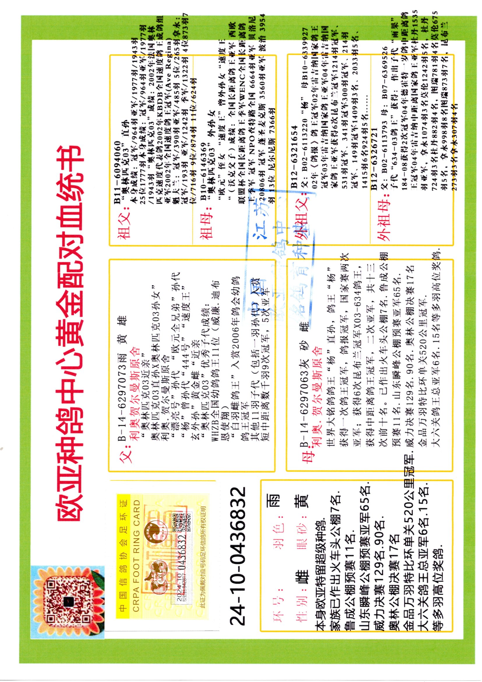 24年秋南京特比環(huán)歐亞榮獲大團(tuán)體冠軍.小團(tuán)體冠軍551公里大特比13名.14名.16名.19名.20名.21名.24名.26名.27名.28名.42名.52名.54名.57名.65名.66名.68名.70名.71名.72名.74名.76名.80名.82名.83名.84名.85名.86名.90名.92名.110名.116名.121名.122名.128名.131名.158名.161名.164名.165名.166名.172名.174名.177名.182名.195名.196名.201名.205名.208名.210名.216名.253名.269名.275名.276名.294名.296名.299名,,24年秋云南天南銅都公棚決賽415名.天南銅都小棚決賽409名.云南玉活公棚決賽102名.490名.團(tuán)體32名上籠二羽進(jìn)二羽,天南銅都大棚506公里決賽445名。熱烈祝賀河北省巨鹿縣李蘭生老師用歐亞泰山號血系連續(xù)十一年奪冠軍,河北省國家賽冠軍.全國季軍等多次前十名高位,揚州王軍王總用歐亞利奧24年春季獲山東翔宇公棚決賽33名蓋比53名。南京劉正龍劉總用歐亞蓋比獲得24年秋山東濰坊國際公棚決賽42名.精英賽30名.三關(guān)鴿王71名.決賽86名.加站賽16名.南京市特比環(huán)A組鴿王9名.B組鴿王5名.6名.C組鴿王5名.精英賽冠軍4名.技能賽A組冠軍4名.5名.秦淮區(qū)特比環(huán)榮獲15名.46名.48名.87名。四川西昌徐亮徐總用歐亞利奧獲得涼山州聚友決賽177名.第二關(guān)亞軍雙關(guān)鴿王19名.三關(guān)鴿王105名.云南豪庭公棚決賽603名。熱烈祝賀24年四川重慶翔園鴿舍用歐亞泰山號榮獲春季400公里冠軍.秋季500公里冠軍,河北王總用詹森X利奧獲得千羽千翔公棚400公里冠軍,廣東蔡楷煥榮獲24年秋愛好者 賽鴿俱樂部三關(guān)鴿王季軍.一關(guān)420公里99名.二關(guān)450公里11名.三關(guān)520公里32名.單關(guān)季軍.7名.12名,江西李衛(wèi)興榮獲貴州紅楓公棚8名.共翔俱樂部寄養(yǎng)棚四關(guān)綜合鴿王30名.一關(guān)400公里78名.二關(guān)500公里55名.三關(guān)520公里37名.四關(guān)500公里57名.同父母獲公棚18名.雷鳴獲得武漢黃浦育翔中心冠軍,四川陳文獲得四川明鴻俱樂部300公里夢幻2名.3名.4名.9名.10名.13名.14名.15名.31名.34名.40名.41名.42名.43名.69名.71名.72名.73名.74名.94名.95名.97名.98名.99名.419公里決賽榮獲總冠軍7名.總共歸巢9羽,四川徐亮獲豪庭決賽603名,山西鄭勇獲得山西泰鑫公棚決賽255名詹森紅狐,熱烈祝賀馬總獲得開爾(飛躍隊)決賽9名獲獎金1310000萬元.第一關(guān)52名,天津津福資賽180公里96名.獲獎金429543萬元,歐亞支持全國鴿友24年秋多人報喜 祝大家取得更好成績,給歐亞報喜鴿友歐亞決定給每人贈送一羽超級種鴿。歐亞俱樂部特比環(huán)多關(guān)鴿王成績:15年秋淮安特比環(huán)黑色星期一全會上籠9700多羽,當(dāng)天無鴿歸巢,第二天全會歸巢357羽,本舍歸巢158羽.前十名八羽.前一百名歸巢57羽,16年春季獲五關(guān)鴿王總冠軍,總亞軍四名.六名.七名.九名.十名.晶藝俱樂部520公里冠亞季軍5名.6名.7名.9名.11名等,火車頭冠軍.季軍6名.8名.9名.10名,16年秋晶藝俱樂部特比環(huán)520公里亞軍.季軍4名.6名.7名.9名,15年春南京白下特比環(huán)冠軍.亞軍.季軍6名.7名.8名.9名.10名.指定鴿A B組獲得冠軍.亞軍.季軍4名.5名.,17年淮安特比環(huán)亞軍.4名.5名.7名.8名.10名.六關(guān)鴿王總冠軍.4名.6名.9名.10名,寄養(yǎng)棚宿遷劉總20羽特比環(huán)獲冠軍.季軍.4名.7名.8名.9名等。18年榮獲萬羽特比環(huán)六關(guān)鴿王總冠軍.總亞軍.總季軍.6名.8名.十名.單關(guān)四羽冠軍.二羽亞軍.四羽季軍.前十名27羽。19年秋萬羽特比環(huán)六關(guān)鴿王總亞軍.總季軍.5名.8名等,單關(guān)二羽冠軍.三羽亞軍.一羽季軍前十名31羽。20年秋淮安市鴿會四關(guān)特比環(huán)大賽風(fēng)雨無阻鴿王亞軍.鴿王六名,金品俱樂部萬羽特比環(huán)六關(guān)鴿王總冠軍,總亞軍.四名.五名.六名.七名.八名.十名.前二百名鴿王35羽,單關(guān)冠亞季軍前十名四十多羽,火車頭五關(guān)鴿王季軍.六名.八名.前二百名鴿王十七羽。20年春榮獲淮安五區(qū)一市四關(guān)鴿王總冠軍.亞軍.四名.八名.九名。21年秋榮獲金品萬羽特比環(huán)大賽六關(guān)鴿王總亞軍.總季軍.四名.七名.九名.十名.單關(guān)冠亞軍季軍前十名三十多羽;疖囶^協(xié)會鴿王六名.七名.十名.單關(guān)前十名十七羽。22年秋榮獲鴿王總冠軍.總亞軍.5名.7名.8名.9名.11名.單關(guān)冠亞季軍前十名三十多羽,第一關(guān)單關(guān)前二百名四十多羽,第二關(guān)前二百名三十多羽,第三關(guān)前二百名四十多羽,第四關(guān)前二百名四十多羽,第五關(guān)前一百名53羽。23年秋榮獲鴿王季軍.五名.八名.十名.13名.17名.20名.27名等多羽鴿王.單關(guān)前十名二十多羽。公棚.寄養(yǎng)棚部分成績:16年秋寧夏黃河公棚總冠軍電腦戈馬力指定通炮冠軍,17年送八羽參賽獲得鴿王八名進(jìn)獎四名,支持韓總榮獲八名。支持鴿友榮獲寧夏中衛(wèi)公棚決賽總冠軍.精英賽冠軍,支持18年寧夏黃河公棚決賽冠軍詹森X泰山。安徽鼎博寄養(yǎng)棚院內(nèi)外四關(guān)鴿王總冠軍.鴿王十七名.三十七名同窩,鴿王39名.42名.58名.67名。18年山東公棚預(yù)賽冠軍.決賽65名.送八羽進(jìn)獎五羽.指定獲奔馳汽車一輛。支持鴿友獲得云南藍(lán)云公棚冠軍.蓋比X佛卡門。支持鴿友榮獲云南銀集公棚決賽冠軍 詹森427X520血系 速度賽6700羽冠軍。17年榮獲金馬俱樂部寄養(yǎng)棚四關(guān)鴿王總冠軍.季軍.六名.八名.第一關(guān)冠軍.亞軍.季軍四名.七名.十一名.金牌教練獎。支持鴿友18
