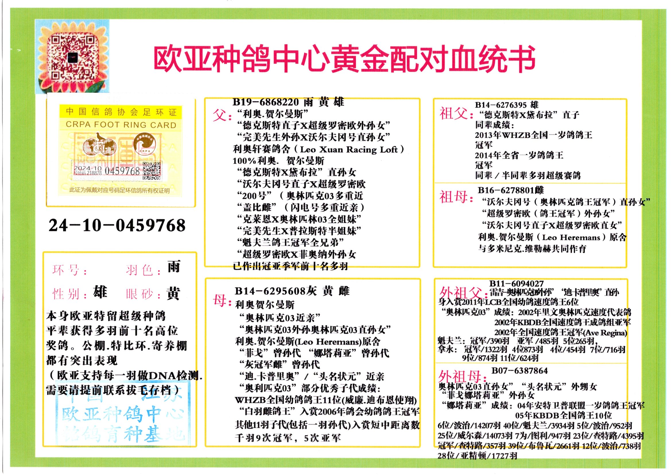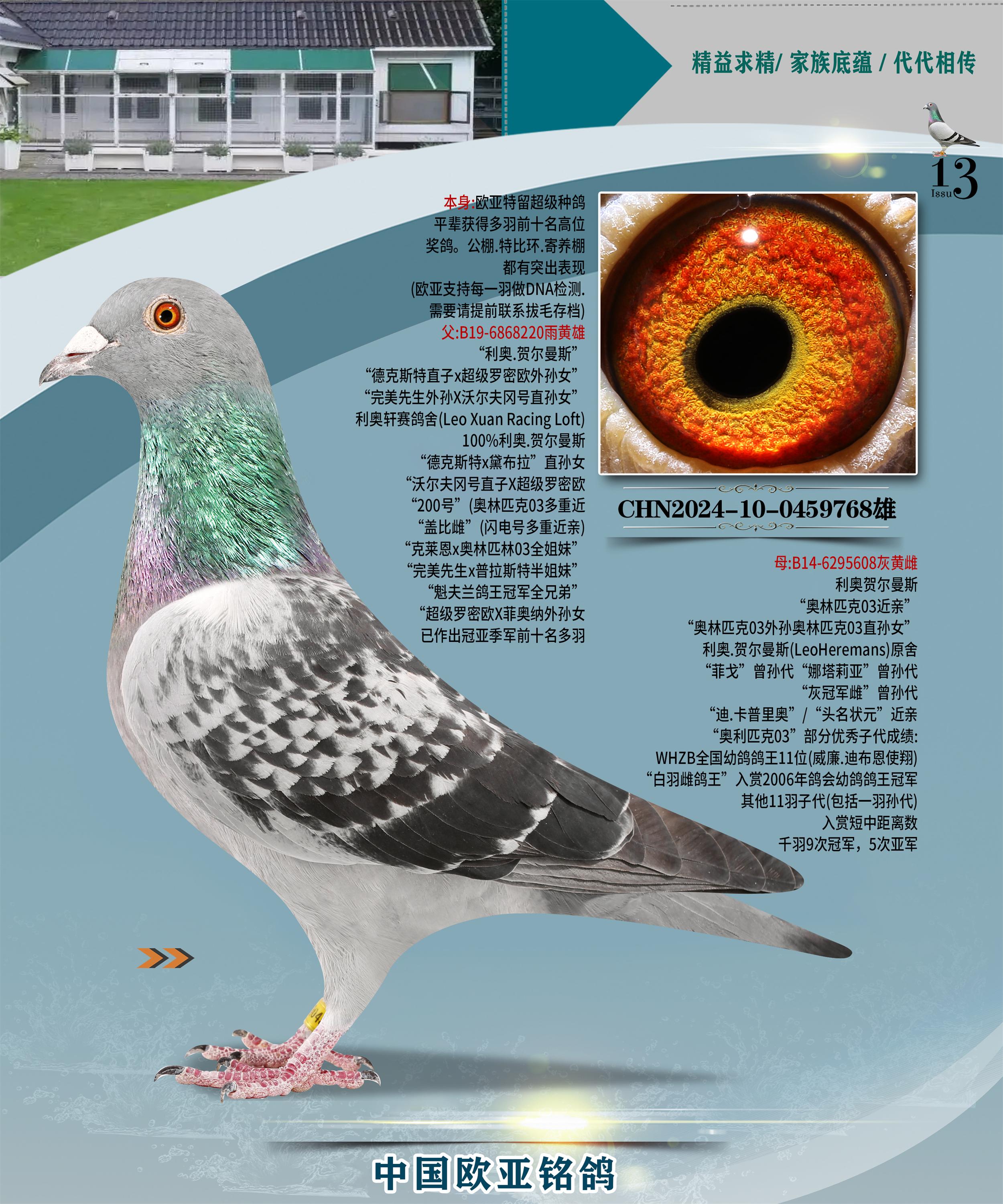 24年秋南京特比環(huán)歐亞榮獲大團(tuán)體冠軍.小團(tuán)體冠軍551公里大特比13名.14名.16名.19名.20名.21名.24名.26名.27名.28名.42名.52名.54名.57名.65名.66名.68名.70名.71名.72名.74名.76名.80名.82名.83名.84名.85名.86名.90名.92名.110名.116名.121名.122名.128名.131名.158名.161名.164名.165名.166名.172名.174名.177名.182名.195名.196名.201名.205名.208名.210名.216名.253名.269名.275名.276名.294名.296名.299名,,24年秋云南天南銅都公棚決賽415名.天南銅都小棚決賽409名.云南玉活公棚決賽102名.490名.團(tuán)體32名上籠二羽進(jìn)二羽,天南銅都大棚506公里決賽445名。熱烈祝賀河北省巨鹿縣李蘭生老師用歐亞泰山號(hào)血系連續(xù)十一年奪冠軍,河北省國(guó)家賽冠軍.全國(guó)季軍等多次前十名高位,揚(yáng)州王軍王總用歐亞利奧24年春季獲山東翔宇公棚決賽33名蓋比53名。南京劉正龍劉總用歐亞蓋比獲得24年秋山東濰坊國(guó)際公棚決賽42名.精英賽30名.三關(guān)鴿王71名.決賽86名.加站賽16名.南京市特比環(huán)A組鴿王9名.B組鴿王5名.6名.C組鴿王5名.精英賽冠軍4名.技能賽A組冠軍4名.5名.秦淮區(qū)特比環(huán)榮獲15名.46名.48名.87名。四川西昌徐亮徐總用歐亞利奧獲得涼山州聚友決賽177名.第二關(guān)亞軍雙關(guān)鴿王19名.三關(guān)鴿王105名.云南豪庭公棚決賽603名。熱烈祝賀24年四川重慶翔園鴿舍用歐亞泰山號(hào)榮獲春季400公里冠軍.秋季500公里冠軍,河北王總用詹森X利奧獲得千羽千翔公棚400公里冠軍,廣東蔡楷煥榮獲24年秋愛(ài)好者 賽鴿俱樂(lè)部三關(guān)鴿王季軍.一關(guān)420公里99名.二關(guān)450公里11名.三關(guān)520公里32名.單關(guān)季軍.7名.12名,江西李衛(wèi)興榮獲貴州紅楓公棚8名.共翔俱樂(lè)部寄養(yǎng)棚四關(guān)綜合鴿王30名.一關(guān)400公里78名.二關(guān)500公里55名.三關(guān)520公里37名.四關(guān)500公里57名.同父母獲公棚18名.雷鳴獲得武漢黃浦育翔中心冠軍,四川陳文獲得四川明鴻俱樂(lè)部300公里夢(mèng)幻2名.3名.4名.9名.10名.13名.14名.15名.31名.34名.40名.41名.42名.43名.69名.71名.72名.73名.74名.94名.95名.97名.98名.99名.419公里決賽榮獲總冠軍7名.總共歸巢9羽,四川徐亮獲豪庭決賽603名,山西鄭勇獲得山西泰鑫公棚決賽255名詹森紅狐,熱烈祝賀馬總獲得開(kāi)爾(飛躍隊(duì))決賽9名獲獎(jiǎng)金1310000萬(wàn)元.第一關(guān)52名,天津津福資賽180公里96名.獲獎(jiǎng)金429543萬(wàn)元,歐亞支持全國(guó)鴿友24年秋多人報(bào)喜 祝大家取得更好成績(jī),給歐亞報(bào)喜鴿友歐亞決定給每人贈(zèng)送一羽超級(jí)種鴿。歐亞俱樂(lè)部特比環(huán)多關(guān)鴿王成績(jī):15年秋淮安特比環(huán)黑色星期一全會(huì)上籠9700多羽,當(dāng)天無(wú)鴿歸巢,第二天全會(huì)歸巢357羽,本舍歸巢158羽.前十名八羽.前一百名歸巢57羽,16年春季獲五關(guān)鴿王總冠軍,總亞軍四名.六名.七名.九名.十名.晶藝俱樂(lè)部520公里冠亞季軍5名.6名.7名.9名.11名等,火車頭冠軍.季軍6名.8名.9名.10名,16年秋晶藝俱樂(lè)部特比環(huán)520公里亞軍.季軍4名.6名.7名.9名,15年春南京白下特比環(huán)冠軍.亞軍.季軍6名.7名.8名.9名.10名.指定鴿A B組獲得冠軍.亞軍.季軍4名.5名.,17年淮安特比環(huán)亞軍.4名.5名.7名.8名.10名.六關(guān)鴿王總冠軍.4名.6名.9名.10名,寄養(yǎng)棚宿遷劉總20羽特比環(huán)獲冠軍.季軍.4名.7名.8名.9名等。18年榮獲萬(wàn)羽特比環(huán)六關(guān)鴿王總冠軍.總亞軍.總季軍.6名.8名.十名.單關(guān)四羽冠軍.二羽亞軍.四羽季軍.前十名27羽。19年秋萬(wàn)羽特比環(huán)六關(guān)鴿王總亞軍.總季軍.5名.8名等,單關(guān)二羽冠軍.三羽亞軍.一羽季軍前十名31羽。20年秋淮安市鴿會(huì)四關(guān)特比環(huán)大賽風(fēng)雨無(wú)阻鴿王亞軍.鴿王六名,金品俱樂(lè)部萬(wàn)羽特比環(huán)六關(guān)鴿王總冠軍,總亞軍.四名.五名.六名.七名.八名.十名.前二百名鴿王35羽,單關(guān)冠亞季軍前十名四十多羽,火車頭五關(guān)鴿王季軍.六名.八名.前二百名鴿王十七羽。20年春榮獲淮安五區(qū)一市四關(guān)鴿王總冠軍.亞軍.四名.八名.九名。21年秋榮獲金品萬(wàn)羽特比環(huán)大賽六關(guān)鴿王總亞軍.總季軍.四名.七名.九名.十名.單關(guān)冠亞軍季軍前十名三十多羽;疖囶^協(xié)會(huì)鴿王六名.七名.十名.單關(guān)前十名十七羽。22年秋榮獲鴿王總冠軍.總亞軍.5名.7名.8名.9名.11名.單關(guān)冠亞季軍前十名三十多羽,第一關(guān)單關(guān)前二百名四十多羽,第二關(guān)前二百名三十多羽,第三關(guān)前二百名四十多羽,第四關(guān)前二百名四十多羽,第五關(guān)前一百名53羽。23年秋榮獲鴿王季軍.五名.八名.十名.13名.17名.20名.27名等多羽鴿王.單關(guān)前十名二十多羽。公棚.寄養(yǎng)棚部分成績(jī):16年秋寧夏黃河公棚總冠軍電腦戈馬力指定通炮冠軍,17年送八羽參賽獲得鴿王八名進(jìn)獎(jiǎng)四名,支持韓總榮獲八名。支持鴿友榮獲寧夏中衛(wèi)公棚決賽總冠軍.精英賽冠軍,支持18年寧夏黃河公棚決賽冠軍詹森X泰山。安徽鼎博寄養(yǎng)棚院內(nèi)外四關(guān)鴿王總冠軍.鴿王十七名.三十七名同窩,鴿王39名.42名.58名.67名。18年山東公棚預(yù)賽冠軍.決賽65名.送八羽進(jìn)獎(jiǎng)五羽.指定獲奔馳汽車一輛。支持鴿友獲得云南藍(lán)云公棚冠軍.蓋比X佛卡門。支持鴿友榮獲云南銀集公棚