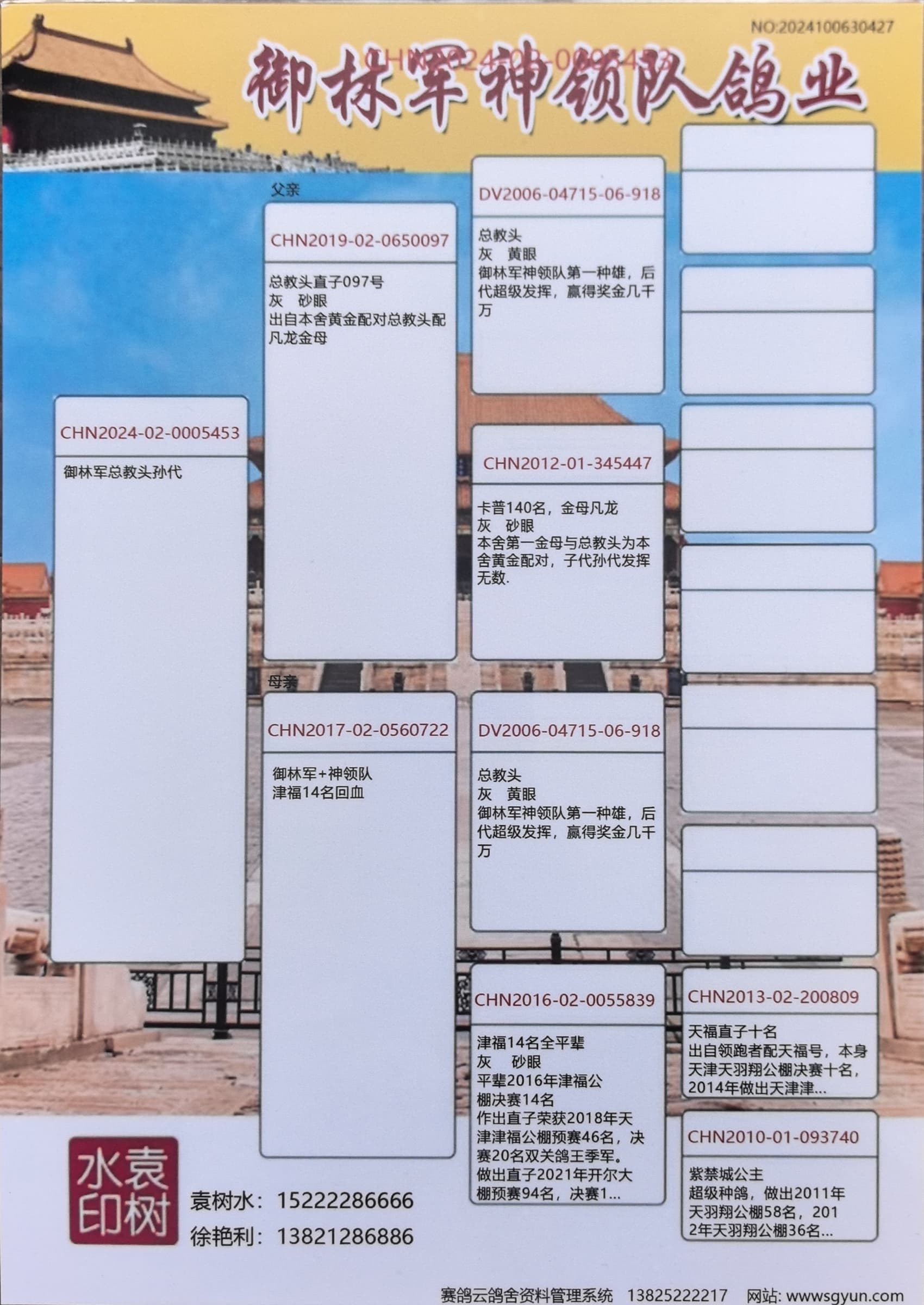 | 1610757 | 血統(tǒng):基特爾006血系本身榮獲500公里5名 | ¥200元 | 1次 |