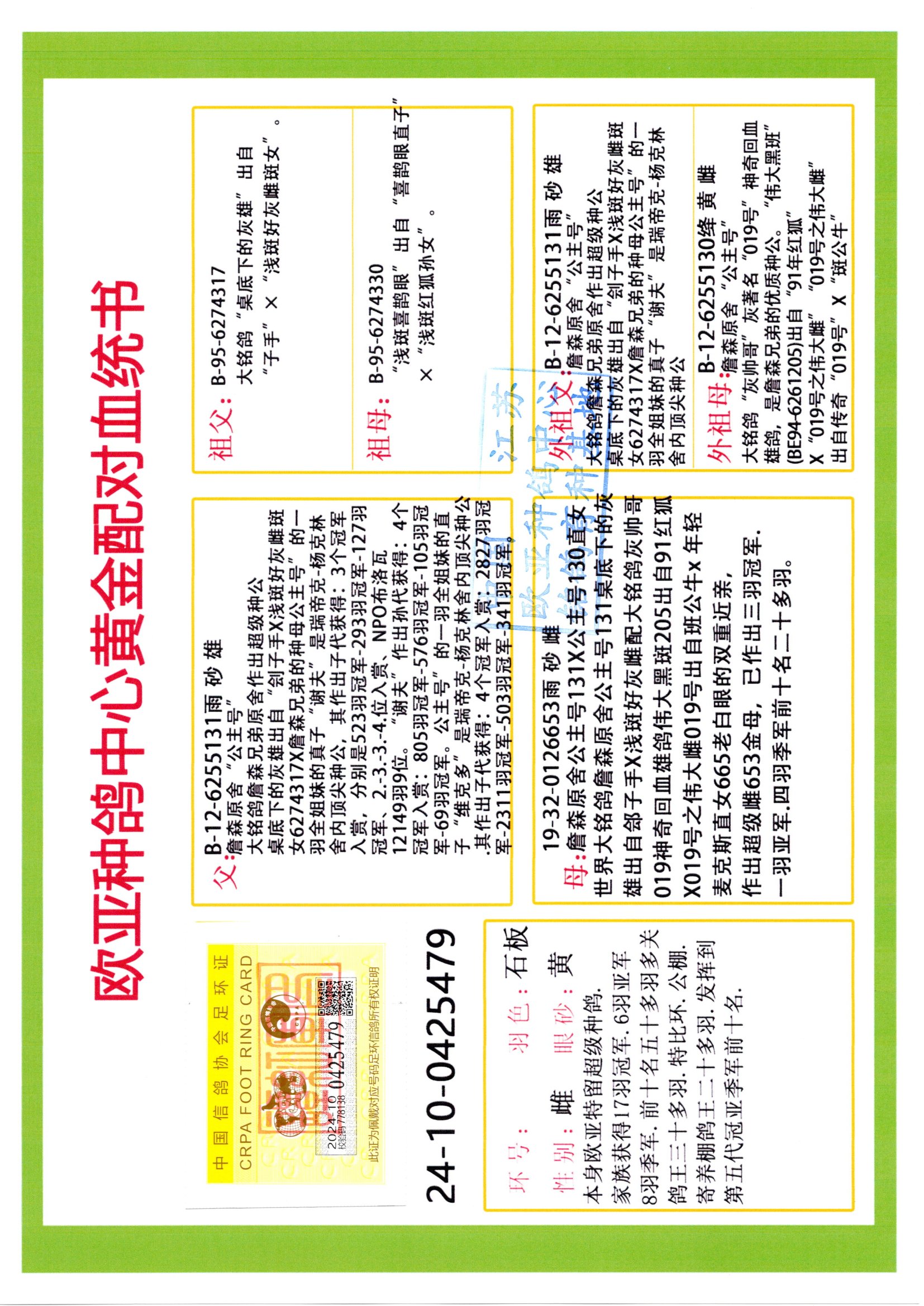 24年秋南京特比環(huán)歐亞榮獲大團體冠軍.小團體冠軍551公里大特比13名.14名.16名.19名.20名.21名.24名.26名.27名.28名.42名.52名.54名.57名.65名.66名.68名.70名.71名.72名.74名.76名.80名.82名.83名.84名.85名.86名.90名.92名.110名.116名.121名.122名.128名.131名.158名.161名.164名.165名.166名.172名.174名.177名.182名.195名.196名.201名.205名.208名.210名.216名.253名.269名.275名.276名.294名.296名.299名,,24年秋云南天南銅都公棚決賽415名.天南銅都小棚決賽409名.云南玉活公棚決賽102名.490名.團體32名上籠二羽進二羽,天南銅都大棚506公里決賽445名。熱烈祝賀河北省巨鹿縣李蘭生老師用歐亞泰山號血系連續(xù)十一年奪冠軍,河北省國家賽冠軍.全國季軍等多次前十名高位,揚州王軍王總用歐亞利奧24年春季獲山東翔宇公棚決賽33名蓋比53名。南京劉正龍劉總用歐亞蓋比獲得24年秋山東濰坊國際公棚決賽42名.精英賽30名.三關(guān)鴿王71名.決賽86名.加站賽16名.南京市特比環(huán)A組鴿王9名.B組鴿王5名.6名.C組鴿王5名.精英賽冠軍4名.技能賽A組冠軍4名.5名.秦淮區(qū)特比環(huán)榮獲15名.46名.48名.87名。四川西昌徐亮徐總用歐亞利奧獲得涼山州聚友決賽177名.第二關(guān)亞軍雙關(guān)鴿王19名.三關(guān)鴿王105名.云南豪庭公棚決賽603名。熱烈祝賀24年四川重慶翔園鴿舍用歐亞泰山號榮獲春季400公里冠軍.秋季500公里冠軍,河北王總用詹森X利奧獲得千羽千翔公棚400公里冠軍,廣東蔡楷煥榮獲24年秋愛好者 賽鴿俱樂部三關(guān)鴿王季軍.一關(guān)420公里99名.二關(guān)450公里11名.三關(guān)520公里32名.單關(guān)季軍.7名.12名,江西李衛(wèi)興榮獲貴州紅楓公棚8名.共翔俱樂部寄養(yǎng)棚四關(guān)綜合鴿王30名.一關(guān)400公里78名.二關(guān)500公里55名.三關(guān)520公里37名.四關(guān)500公里57名.同父母獲公棚18名.雷鳴獲得武漢黃浦育翔中心冠軍,四川陳文獲得四川明鴻俱樂部300公里夢幻2名.3名.4名.9名.10名.13名.14名.15名.31名.34名.40名.41名.42名.43名.69名.71名.72名.73名.74名.94名.95名.97名.98名.99名.419公里決賽榮獲總冠軍7名.總共歸巢9羽,四川徐亮獲豪庭決賽603名,山西鄭勇獲得山西泰鑫公棚決賽255名詹森紅狐,熱烈祝賀馬總獲得開爾(飛躍隊)決賽9名獲獎金1310000萬元.第一關(guān)52名,天津津福資賽180公里96名.獲獎金429543萬元,歐亞支持全國鴿友24年秋多人報喜 祝大家取得更好成績,給歐亞報喜鴿友歐亞決定給每人贈送一羽超級種鴿。歐亞俱樂部特比環(huán)多關(guān)鴿王成績:15年秋淮安特比環(huán)黑色星期一全會上籠9700多羽,當天無鴿歸巢,第二天全會歸巢357羽,本舍歸巢158羽.前十名八羽.前一百名歸巢57羽,16年春季獲五關(guān)鴿王總冠軍,總亞軍四名.六名.七名.九名.十名.晶藝俱樂部520公里冠亞季軍5名.6名.7名.9名.11名等,火車頭冠軍.季軍6名.8名.9名.10名,16年秋晶藝俱樂部特比環(huán)520公里亞軍.季軍4名.6名.7名.9名,15年春南京白下特比環(huán)冠軍.亞軍.季軍6名.7名.8名.9名.10名.指定鴿A B組獲得冠軍.亞軍.季軍4名.5名.,17年淮安特比環(huán)亞軍.4名.5名.7名.8名.10名.六關(guān)鴿王總冠軍.4名.6名.9名.10名,寄養(yǎng)棚宿遷劉總20羽特比環(huán)獲冠軍.季軍.4名.7名.8名.9名等。18年榮獲萬羽特比環(huán)六關(guān)鴿王總冠軍.總亞軍.總季軍.6名.8名.十名.單關(guān)四羽冠軍.二羽亞軍.四羽季軍.前十名27羽。19年秋萬羽特比環(huán)六關(guān)鴿王總亞軍.總季軍.5名.8名等,單關(guān)二羽冠軍.三羽亞軍.一羽季軍前十名31羽。20年秋淮安市鴿會四關(guān)特比環(huán)大賽風雨無阻鴿王亞軍.鴿王六名,金品俱樂部萬羽特比環(huán)六關(guān)鴿王總冠軍,總亞軍.四名.五名.六名.七名.八名.十名.前二百名鴿王35羽,單關(guān)冠亞季軍前十名四十多羽,火車頭五關(guān)鴿王季軍.六名.八名.前二百名鴿王十七羽。20年春榮獲淮安五區(qū)一市四關(guān)鴿王總冠軍.亞軍.四名.八名.九名。21年秋榮獲金品萬羽特比環(huán)大賽六關(guān)鴿王總亞軍.總季軍.四名.七名.九名.十名.單關(guān)冠亞軍季軍前十名三十多羽。火車頭協(xié)會鴿王六名.七名.十名.單關(guān)前十名十七羽。22年秋榮獲鴿王總冠軍.總亞軍.5名.7名.8名.9名.11名.單關(guān)冠亞季軍前十名三十多羽,第一關(guān)單關(guān)前二百名四十多羽,第二關(guān)前二百名三十多羽,第三關(guān)前二百名四十多羽,第四關(guān)前二百名四十多羽,第五關(guān)前一百名53羽。23年秋榮獲鴿王季軍.五名.八名.十名.13名.17名.20名.27名等多羽鴿王.單關(guān)前十名二十多羽。公棚.寄養(yǎng)棚部分成績:16年秋寧夏黃河公棚總冠軍電腦戈馬力指定通炮冠軍,17年送八羽參賽獲得鴿王八名進獎四名,支持韓總榮獲八名。支持鴿友榮獲寧夏中衛(wèi)公棚決賽總冠軍.精英賽冠軍,支持18年寧夏黃河公棚決賽冠軍詹森X泰山。安徽鼎博寄養(yǎng)棚院內(nèi)外四關(guān)鴿王總冠軍.鴿王十七名.三十七名同窩,鴿王39名.42名.58名.67名。18年山東公棚預(yù)賽冠軍.決賽65名.送八羽進獎五羽.指定獲奔馳汽車一輛。支持鴿友獲得云南藍云公棚冠軍.蓋比X佛卡門。支持鴿友榮獲云南銀集公棚決賽冠軍 詹森427X520血系 速度賽6700羽冠軍。17年榮獲金馬俱樂部寄養(yǎng)棚四關(guān)鴿王總冠軍.季軍.六名.八名.第一關(guān)冠軍.亞軍.季軍四名.七名.十一名.金牌教練獎。支持鴿友18年北京費翔公棚預(yù)賽九名電腦X桑杰士,