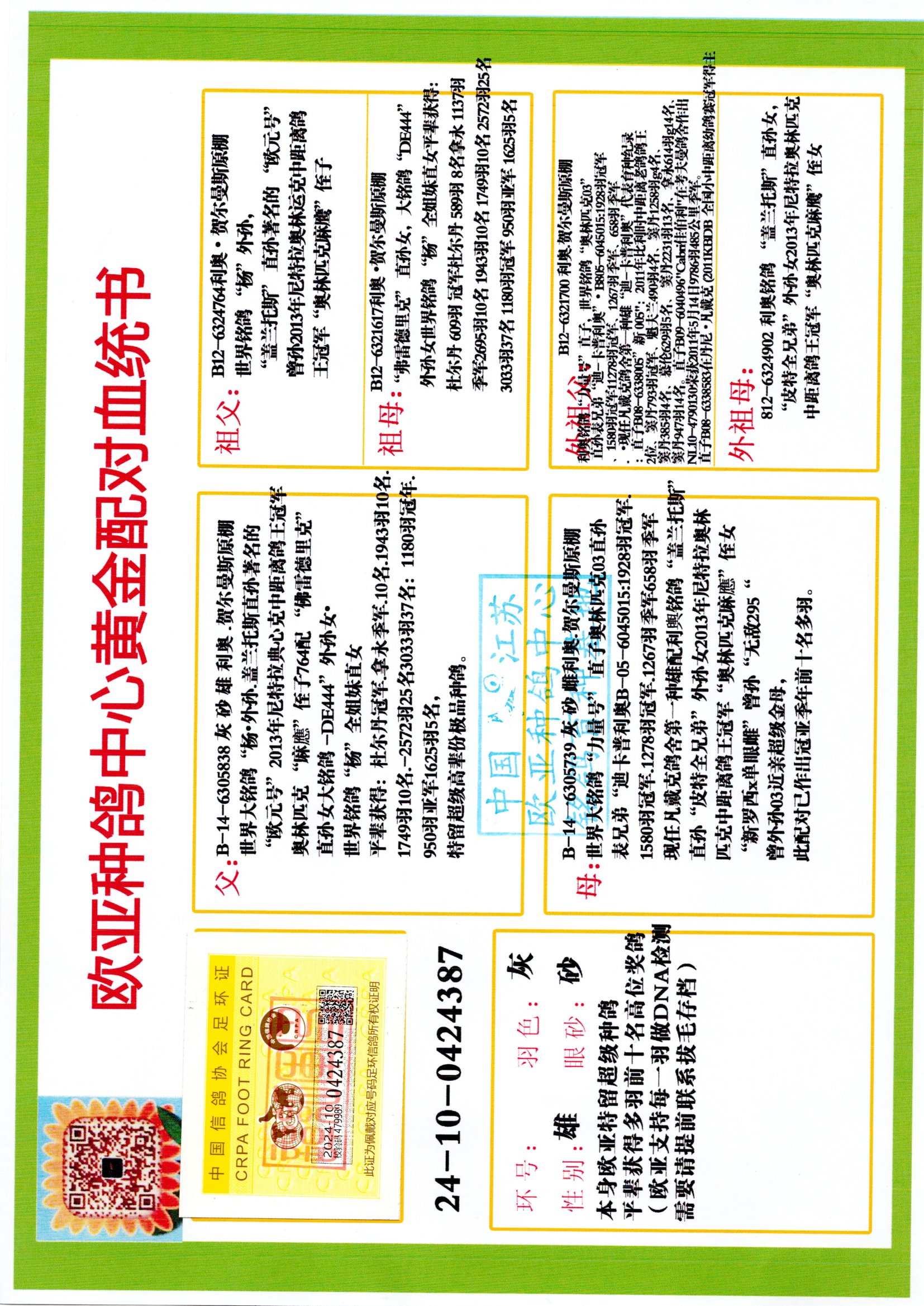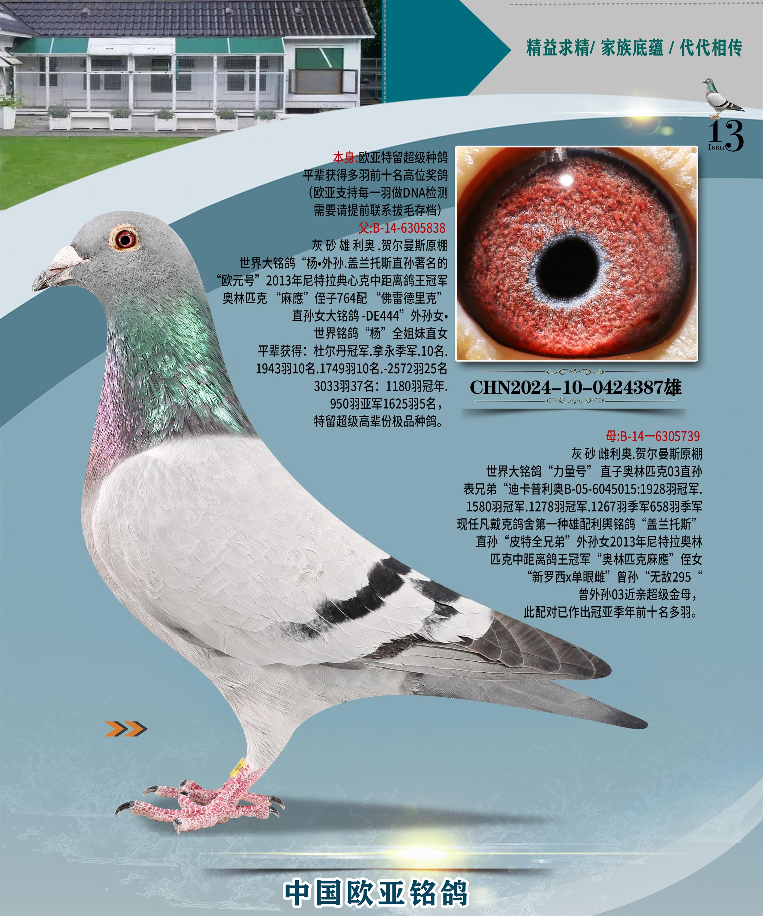 24年秋南京特比環(huán)歐亞榮獲大團(tuán)體冠軍.小團(tuán)體冠軍551公里大特比13名.14名.16名.19名.20名.21名.24名.26名.27名.28名.42名.52名.54名.57名.65名.66名.68名.70名.71名.72名.74名.76名.80名.82名.83名.84名.85名.86名.90名.92名.110名.116名.121名.122名.128名.131名.158名.161名.164名.165名.166名.172名.174名.177名.182名.195名.196名.201名.205名.208名.210名.216名.253名.269名.275名.276名.294名.296名.299名,,24年秋云南天南銅都公棚決賽415名.天南銅都小棚決賽409名.云南玉活公棚決賽102名.490名.團(tuán)體32名上籠二羽進(jìn)二羽,天南銅都大棚506公里決賽445名。熱烈祝賀河北省巨鹿縣李蘭生老師用歐亞泰山號血系連續(xù)十一年奪冠軍,河北省國家賽冠軍.全國季軍等多次前十名高位,揚(yáng)州王軍王總用歐亞利奧24年春季獲山東翔宇公棚決賽33名蓋比53名。南京劉正龍劉總用歐亞蓋比獲得24年秋山東濰坊國際公棚決賽42名.精英賽30名.三關(guān)鴿王71名.決賽86名.加站賽16名.南京市特比環(huán)A組鴿王9名.B組鴿王5名.6名.C組鴿王5名.精英賽冠軍4名.技能賽A組冠軍4名.5名.秦淮區(qū)特比環(huán)榮獲15名.46名.48名.87名。四川西昌徐亮徐總用歐亞利奧獲得涼山州聚友決賽177名.第二關(guān)亞軍雙關(guān)鴿王19名.三關(guān)鴿王105名.云南豪庭公棚決賽603名。熱烈祝賀24年四川重慶翔園鴿舍用歐亞泰山號榮獲春季400公里冠軍.秋季500公里冠軍,河北王總用詹森X利奧獲得千羽千翔公棚400公里冠軍,廣東蔡楷煥榮獲24年秋愛好者 賽鴿俱樂部三關(guān)鴿王季軍.一關(guān)420公里99名.二關(guān)450公里11名.三關(guān)520公里32名.單關(guān)季軍.7名.12名,江西李衛(wèi)興榮獲貴州紅楓公棚8名.共翔俱樂部寄養(yǎng)棚四關(guān)綜合鴿王30名.一關(guān)400公里78名.二關(guān)500公里55名.三關(guān)520公里37名.四關(guān)500公里57名.同父母獲公棚18名.雷鳴獲得武漢黃浦育翔中心冠軍,四川陳文獲得四川明鴻俱樂部300公里夢幻2名.3名.4名.9名.10名.13名.14名.15名.31名.34名.40名.41名.42名.43名.69名.71名.72名.73名.74名.94名.95名.97名.98名.99名.419公里決賽榮獲總冠軍7名.總共歸巢9羽,四川徐亮獲豪庭決賽603名,山西鄭勇獲得山西泰鑫公棚決賽255名詹森紅狐,熱烈祝賀馬總獲得開爾(飛躍隊)決賽9名獲獎金1310000萬元.第一關(guān)52名,天津津福資賽180公里96名.獲獎金429543萬元,歐亞支持全國鴿友24年秋多人報喜 祝大家取得更好成績,給歐亞報喜鴿友歐亞決定給每人贈送一羽超級種鴿。歐亞俱樂部特比環(huán)多關(guān)鴿王成績:15年秋淮安特比環(huán)黑色星期一全會上籠9700多羽,當(dāng)天無鴿歸巢,第二天全會歸巢357羽,本舍歸巢158羽.前十名八羽.前一百名歸巢57羽,16年春季獲五關(guān)鴿王總冠軍,總亞軍四名.六名.七名.九名.十名.晶藝俱樂部520公里冠亞季軍5名.6名.7名.9名.11名等,火車頭冠軍.季軍6名.8名.9名.10名,16年秋晶藝俱樂部特比環(huán)520公里亞軍.季軍4名.6名.7名.9名,15年春南京白下特比環(huán)冠軍.亞軍.季軍6名.7名.8名.9名.10名.指定鴿A B組獲得冠軍.亞軍.季軍4名.5名.,17年淮安特比環(huán)亞軍.4名.5名.7名.8名.10名.六關(guān)鴿王總冠軍.4名.6名.9名.10名,寄養(yǎng)棚宿遷劉總20羽特比環(huán)獲冠軍.季軍.4名.7名.8名.9名等。18年榮獲萬羽特比環(huán)六關(guān)鴿王總冠軍.總亞軍.總季軍.6名.8名.十名.單關(guān)四羽冠軍.二羽亞軍.四羽季軍.前十名27羽。19年秋萬羽特比環(huán)六關(guān)鴿王總亞軍.總季軍.5名.8名等,單關(guān)二羽冠軍.三羽亞軍.一羽季軍前十名31羽。20年秋淮安市鴿會四關(guān)特比環(huán)大賽風(fēng)雨無阻鴿王亞軍.鴿王六名,金品俱樂部萬羽特比環(huán)六關(guān)鴿王總冠軍,總亞軍.四名.五名.六名.七名.八名.十名.前二百名鴿王35羽,單關(guān)冠亞季軍前十名四十多羽,火車頭五關(guān)鴿王季軍.六名.八名.前二百名鴿王十七羽。20年春榮獲淮安五區(qū)一市四關(guān)鴿王總冠軍.亞軍.四名.八名.九名。21年秋榮獲金品萬羽特比環(huán)大賽六關(guān)鴿王總亞軍.總季軍.四名.七名.九名.十名.單關(guān)冠亞軍季軍前十名三十多羽;疖囶^協(xié)會鴿王六名.七名.十名.單關(guān)前十名十七羽。22年秋榮獲鴿王總冠軍.總亞軍.5名.7名.8名.9名.11名.單關(guān)冠亞季軍前十名三十多羽,第一關(guān)單關(guān)前二百名四十多羽,第二關(guān)前二百名三十多羽,第三關(guān)前二百名四十多羽,第四關(guān)前二百名四十多羽,第五關(guān)前一百名53羽。23年秋榮獲鴿王季軍.五名.八名.十名.13名.17名.20名.27名等多羽鴿王.單關(guān)前十名二十多羽。公棚.寄養(yǎng)棚部分成績:16年秋寧夏黃河公棚總冠軍電腦戈馬力指定通炮冠軍,17年送八羽參賽獲得鴿王八名進(jìn)獎四名,支持韓總榮獲八名。支持鴿友榮獲寧夏中衛(wèi)公棚決賽總冠軍.精英賽冠軍,支持18年寧夏黃河公棚決賽冠軍詹森X泰山。安徽鼎博寄養(yǎng)棚院內(nèi)外四關(guān)鴿王總冠軍.鴿王十七名.三十七名同窩,鴿王39名.42名.58名.67名。18年山東公棚預(yù)賽冠軍.決賽65名.送八羽進(jìn)獎五羽.指定獲奔馳汽車一輛。支持鴿友獲得云南藍(lán)云公棚冠軍.蓋比X佛卡門。支持鴿友榮獲云南銀集公棚決賽冠軍 詹森427X520血系 速度賽6700羽冠軍。17年榮獲金馬俱樂部寄養(yǎng)棚四關(guān)鴿王總冠軍.季軍.六名.八名.第一關(guān)冠軍.亞軍.季軍四名.七名.十一名.金牌教練獎。支持鴿