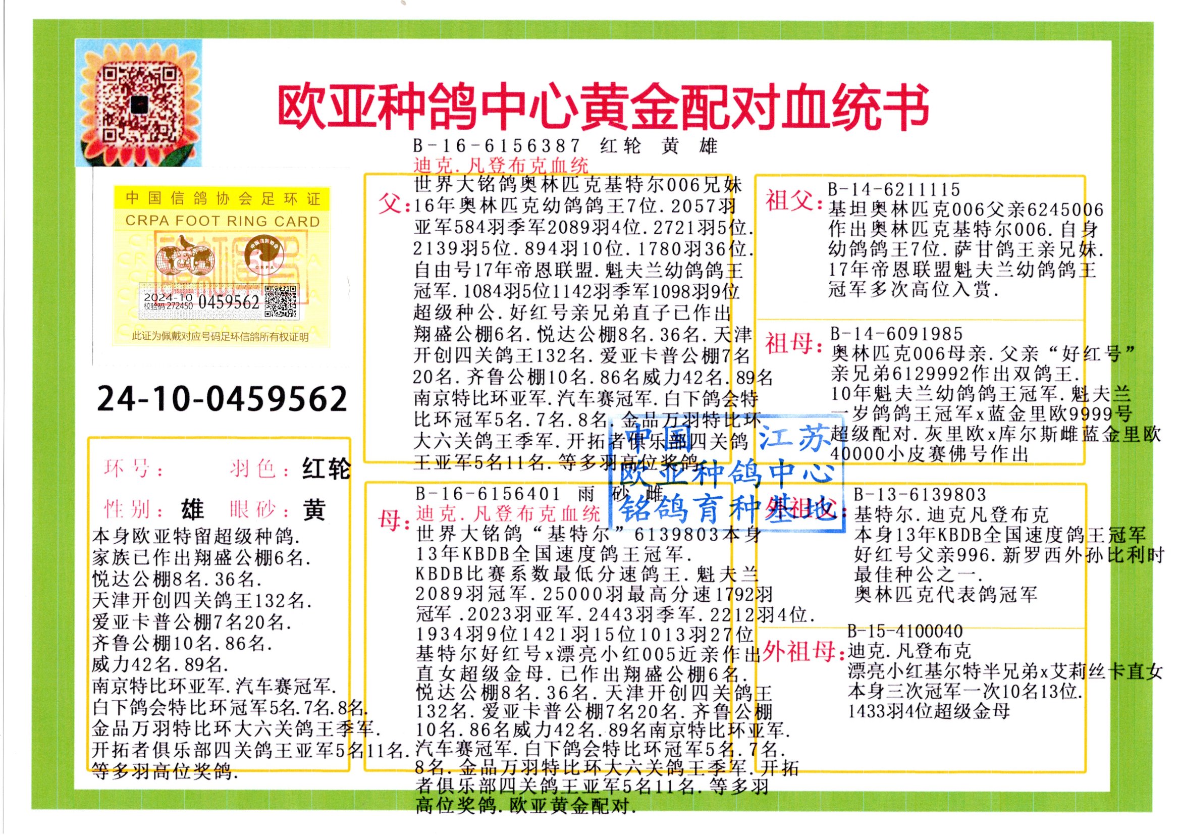 24年秋南京特比環(huán)歐亞榮獲大團體冠軍.小團體冠軍551公里大特比13名.14名.16名.19名.20名.21名.24名.26名.27名.28名.42名.52名.54名.57名.65名.66名.68名.70名.71名.72名.74名.76名.80名.82名.83名.84名.85名.86名.90名.92名.110名.116名.121名.122名.128名.131名.158名.161名.164名.165名.166名.172名.174名.177名.182名.195名.196名.201名.205名.208名.210名.216名.253名.269名.275名.276名.294名.296名.299名,,24年秋云南天南銅都公棚決賽415名.天南銅都小棚決賽409名.云南玉活公棚決賽102名.490名.團體32名上籠二羽進二羽,天南銅都大棚506公里決賽445名。熱烈祝賀河北省巨鹿縣李蘭生老師用歐亞泰山號血系連續(xù)十一年奪冠軍,河北省國家賽冠軍.全國季軍等多次前十名高位,揚州王軍王總用歐亞利奧24年春季獲山東翔宇公棚決賽33名蓋比53名。南京劉正龍劉總用歐亞蓋比獲得24年秋山東濰坊國際公棚決賽42名.精英賽30名.三關鴿王71名.決賽86名.加站賽16名.南京市特比環(huán)A組鴿王9名.B組鴿王5名.6名.C組鴿王5名.精英賽冠軍4名.技能賽A組冠軍4名.5名.秦淮區(qū)特比環(huán)榮獲15名.46名.48名.87名。四川西昌徐亮徐總用歐亞利奧獲得涼山州聚友決賽177名.第二關亞軍雙關鴿王19名.三關鴿王105名.云南豪庭公棚決賽603名。熱烈祝賀24年四川重慶翔園鴿舍用歐亞泰山號榮獲春季400公里冠軍.秋季500公里冠軍,河北王總用詹森X利奧獲得千羽千翔公棚400公里冠軍,廣東蔡楷煥榮獲24年秋愛好者 賽鴿俱樂部三關鴿王季軍.一關420公里99名.二關450公里11名.三關520公里32名.單關季軍.7名.12名,江西李衛(wèi)興榮獲貴州紅楓公棚8名.共翔俱樂部寄養(yǎng)棚四關綜合鴿王30名.一關400公里78名.二關500公里55名.三關520公里37名.四關500公里57名.同父母獲公棚18名.雷鳴獲得武漢黃浦育翔中心冠軍,四川陳文獲得四川明鴻俱樂部300公里夢幻2名.3名.4名.9名.10名.13名.14名.15名.31名.34名.40名.41名.42名.43名.69名.71名.72名.73名.74名.94名.95名.97名.98名.99名.419公里決賽榮獲總冠軍7名.總共歸巢9羽,四川徐亮獲豪庭決賽603名,山西鄭勇獲得山西泰鑫公棚決賽255名詹森紅狐,熱烈祝賀馬總獲得開爾(飛躍隊)決賽9名獲獎金1310000萬元.第一關52名,天津津福資賽180公里96名.獲獎金429543萬元,歐亞支持全國鴿友24年秋多人報喜 祝大家取得更好成績,給歐亞報喜鴿友歐亞決定給每人贈送一羽超級種鴿。歐亞俱樂部特比環(huán)多關鴿王成績:15年秋淮安特比環(huán)黑色星期一全會上籠9700多羽,當天無鴿歸巢,第二天全會歸巢357羽,本舍歸巢158羽.前十名八羽.前一百名歸巢57羽,16年春季獲五關鴿王總冠軍,總亞軍四名.六名.七名.九名.十名.晶藝俱樂部520公里冠亞季軍5名.6名.7名.9名.11名等,火車頭冠軍.季軍6名.8名.9名.10名,16年秋晶藝俱樂部特比環(huán)520公里亞軍.季軍4名.6名.7名.9名,15年春南京白下特比環(huán)冠軍.亞軍.季軍6名.7名.8名.9名.10名.指定鴿A B組獲得冠軍.亞軍.季軍4名.5名.,17年淮安特比環(huán)亞軍.4名.5名.7名.8名.10名.六關鴿王總冠軍.4名.6名.9名.10名,寄養(yǎng)棚宿遷劉總20羽特比環(huán)獲冠軍.季軍.4名.7名.8名.9名等。18年榮獲萬羽特比環(huán)六關鴿王總冠軍.總亞軍.總季軍.6名.8名.十名.單關四羽冠軍.二羽亞軍.四羽季軍.前十名27羽。19年秋萬羽特比環(huán)六關鴿王總亞軍.總季軍.5名.8名等,單關二羽冠軍.三羽亞軍.一羽季軍前十名31羽。20年秋淮安市鴿會四關特比環(huán)大賽風雨無阻鴿王亞軍.鴿王六名,金品俱樂部萬羽特比環(huán)六關鴿王總冠軍,總亞軍.四名.五名.六名.七名.八名.十名.前二百名鴿王35羽,單關冠亞季軍前十名四十多羽,火車頭五關鴿王季軍.六名.八名.前二百名鴿王十七羽。20年春榮獲淮安五區(qū)一市四關鴿王總冠軍.亞軍.四名.八名.九名。21年秋榮獲金品萬羽特比環(huán)大賽六關鴿王總亞軍.總季軍.四名.七名.九名.十名.單關冠亞軍季軍前十名三十多羽;疖囶^協(xié)會鴿王六名.七名.十名.單關前十名十七羽。22年秋榮獲鴿王總冠軍.總亞軍.5名.7名.8名.9名.11名.單關冠亞季軍前十名三十多羽,第一關單關前二百名四十多羽,第二關前二百名三十多羽,第三關前二百名四十多羽,第四關前二百名四十多羽,第五關前一百名53羽。23年秋榮獲鴿王季軍.五名.八名.十名.13名.17名.20名.27名等多羽鴿王.單關前十名二十多羽。公棚.寄養(yǎng)棚部分成績:16年秋寧夏黃河公棚總冠軍電腦戈馬力指定通炮冠軍,17年送八羽參賽獲得鴿王八名進獎四名,支持韓總榮獲八名。支持鴿友榮獲寧夏中衛(wèi)公棚決賽總冠軍.精英賽冠軍,支持18年寧夏黃河公棚決賽冠軍詹森X泰山。安徽鼎博寄養(yǎng)棚院內(nèi)外四關鴿王總冠軍.鴿王十七名.三十七名同窩,鴿王39名.42名.58名.67名。18年山東公棚預賽冠軍.決賽65名.送八羽進獎五羽.指定獲奔馳汽車一輛。支持鴿友獲得云南藍云公棚冠軍.蓋比X佛卡門。支持鴿友榮獲云南銀集公棚決賽冠軍 詹森427X520血系 速度賽6700羽冠軍。17年榮獲金馬俱樂部寄養(yǎng)棚四關鴿王總冠軍.季軍.六名.八名.第一關冠軍.亞軍.季軍四名.七名.十一名.金牌教練獎。支持鴿友18年北京費翔公棚預賽九名電腦X桑杰士,支持鴿友榮獲陜西威力公棚決賽11名.內(nèi)蒙古臨河寄養(yǎng)棚四關鴿王六名.詹森配泰山,支持河北王總用歐亞詹森427配胡本喜獲20年秋開爾青年棚季軍。云南東榮公棚16年預賽冠軍.決賽77名.17年決賽12名.詹森紅狐X泰山,17年平安公
