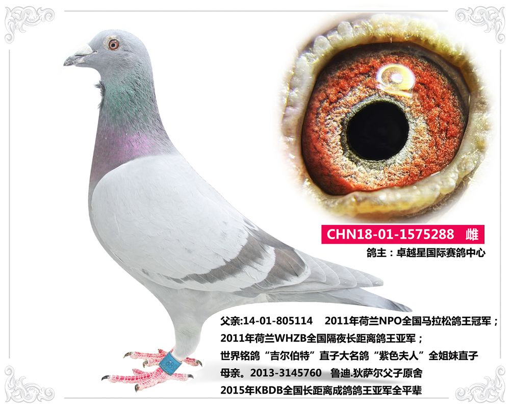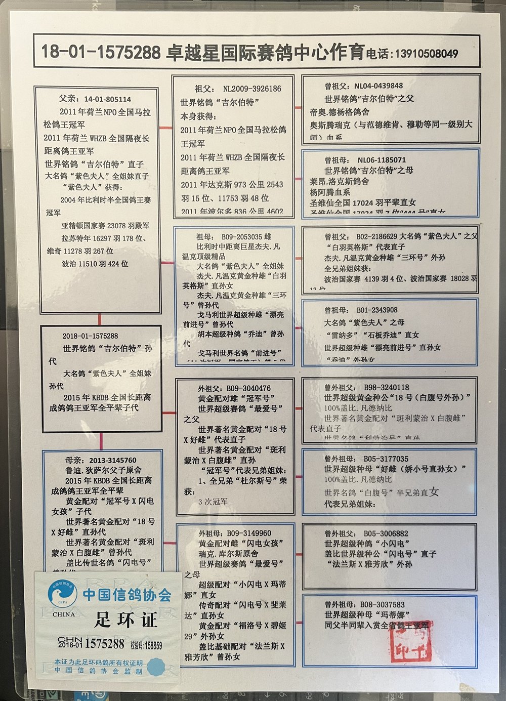 母親。2013-3145760 魯?shù)?狄薩爾父子原舍 2015年KBDB全國長距離成鴿鴿王亞軍全平輩 黃金配對“冠軍號X閃電女孩”子代 世界著名黃金配對“18號X好雌”直孫代 世界著名黃金配對“斑利蒙治X白腹雌”曾孫代 蓋比傳世名鴿“閃電號”;